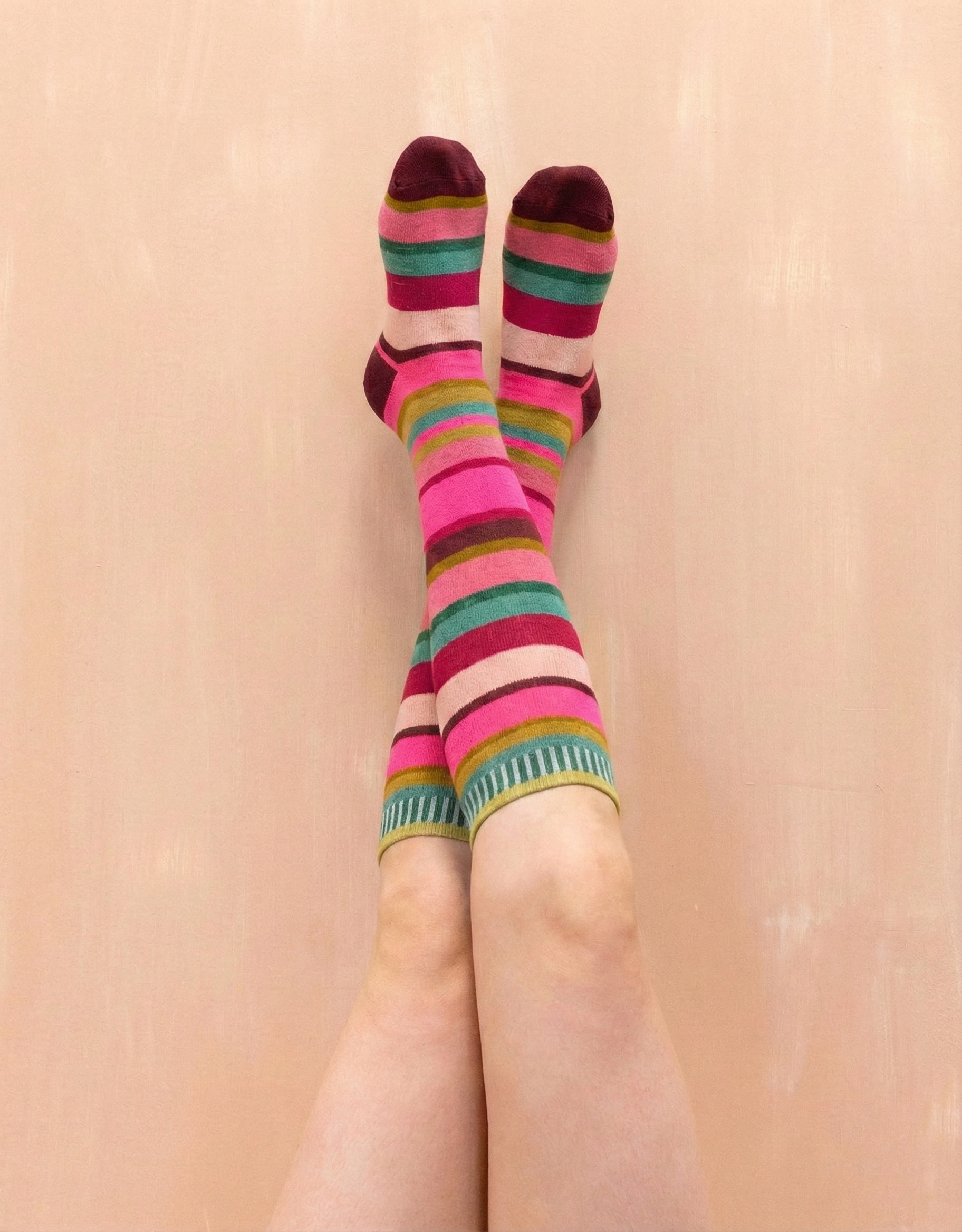 Heerlijke blije gestreepte kniekousen in gezellige kleuren die ervoor zorgen je voeten er ook vrolijk bij lopen dit seizoen.