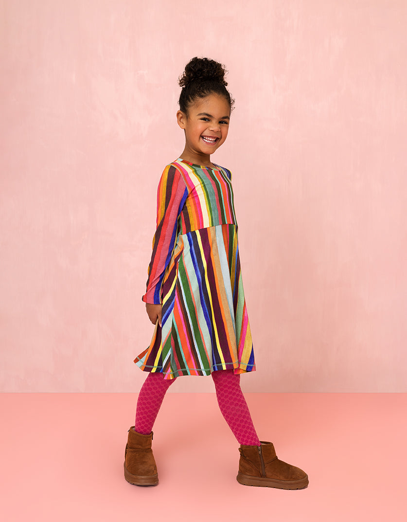De Hollandse tulpenvelden gezien vanuit de lucht waren de inspiratie voor dit dessin. Met de hand schilderden we de strepen van print Pieternella. Een vrolijke stijl voor een vrolijke jurk.