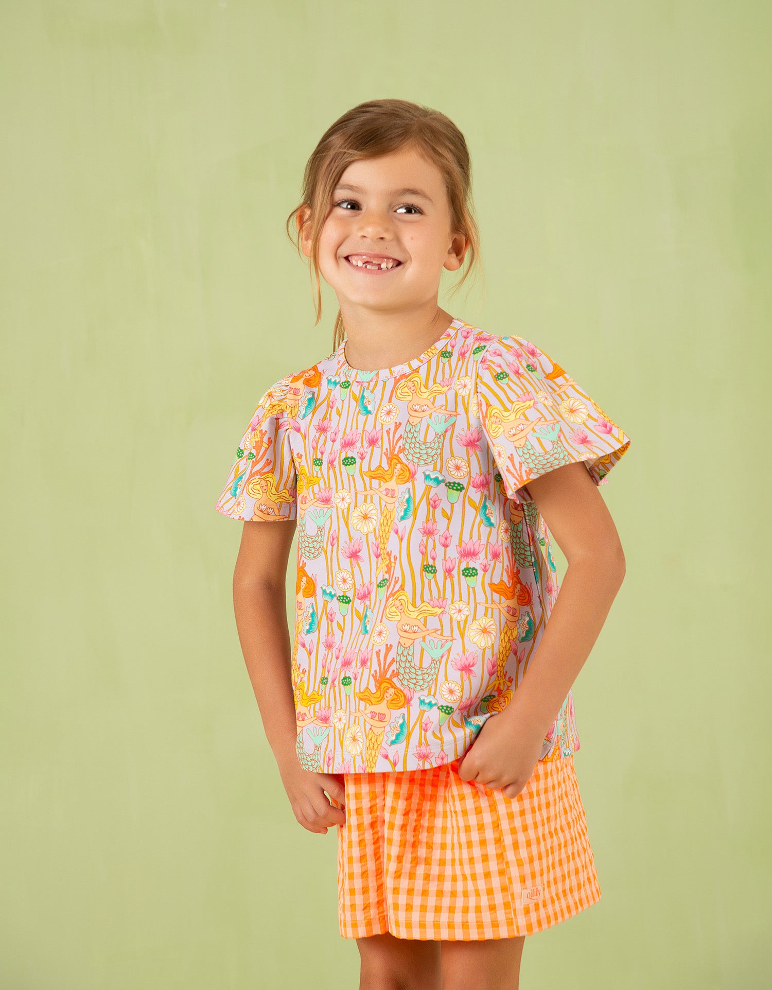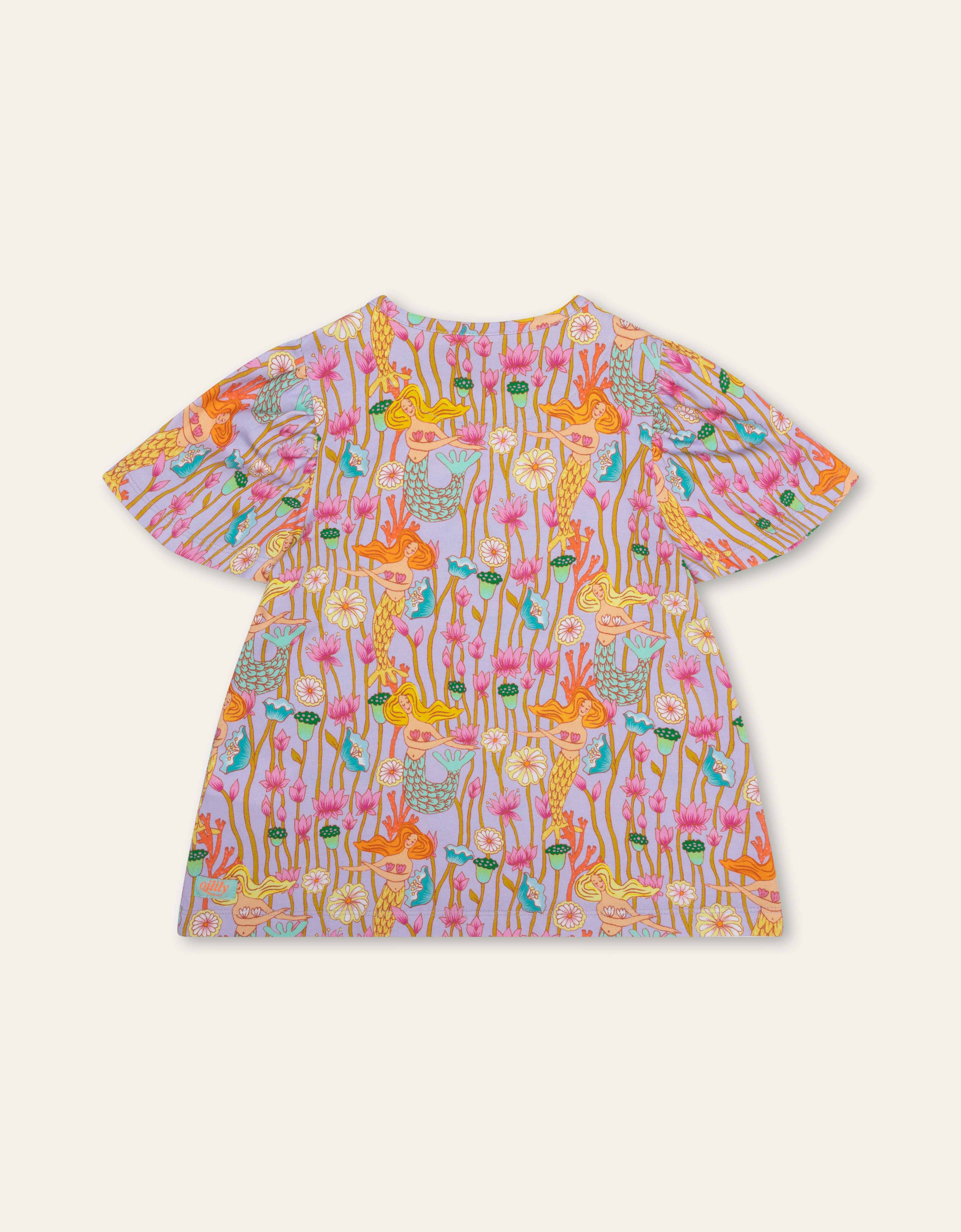 Tussen de lotusbloemen en het koraal zwemmen kleurrijke zeemeerminnen, samen vormen ze dessin Lotus Mermaid. Vind jouw favoriete zeemeermin op dit t-shirt en neem haar mee op al zomerse avonturen.