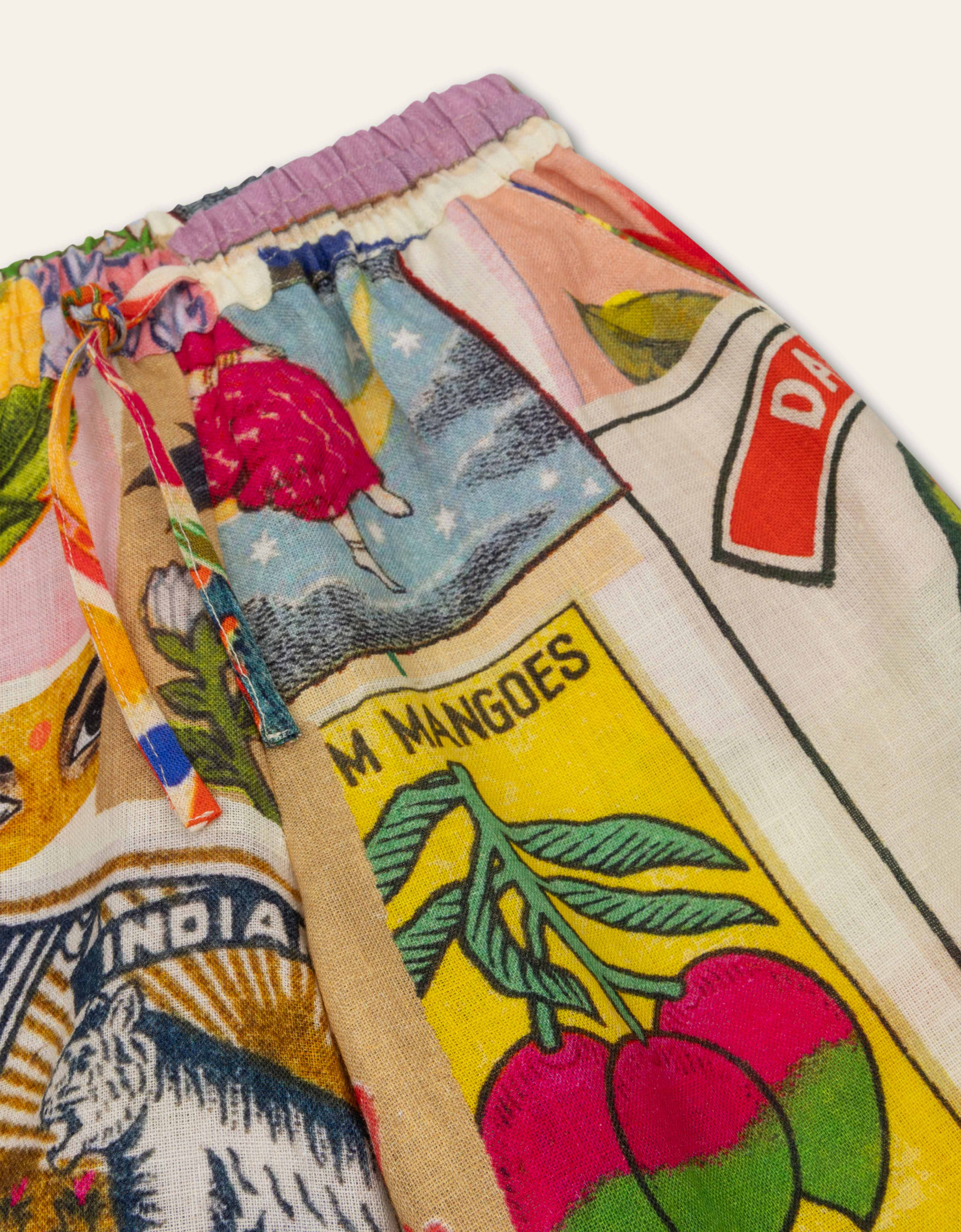 Luchtige broek, perfect voor frisse en warmere dagen. De pasvorm is comfortabel en soepel. De print is geïnspireerd op Indiase luciferdoosjes — kleine kunstwerkjes vol kleur en details.