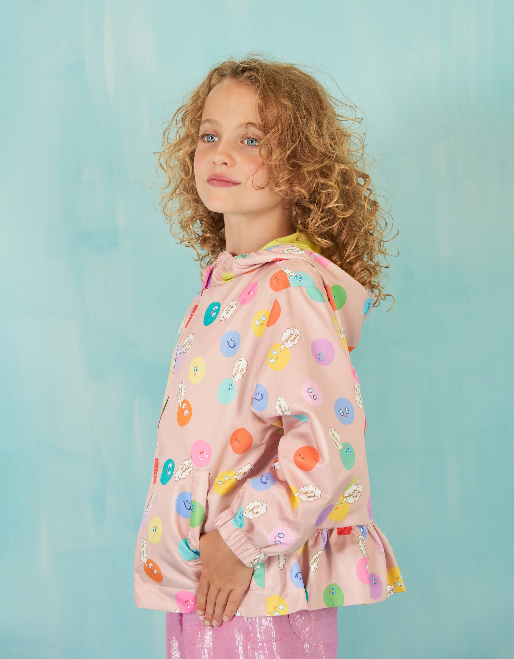 Fijn jasje met rits, capuchon en steekzakken in een zachte kleur. De vrolijke kleuren komen van het dessin Vitamin Dots met onze vitaminebolletjes vol vrolijkheid.