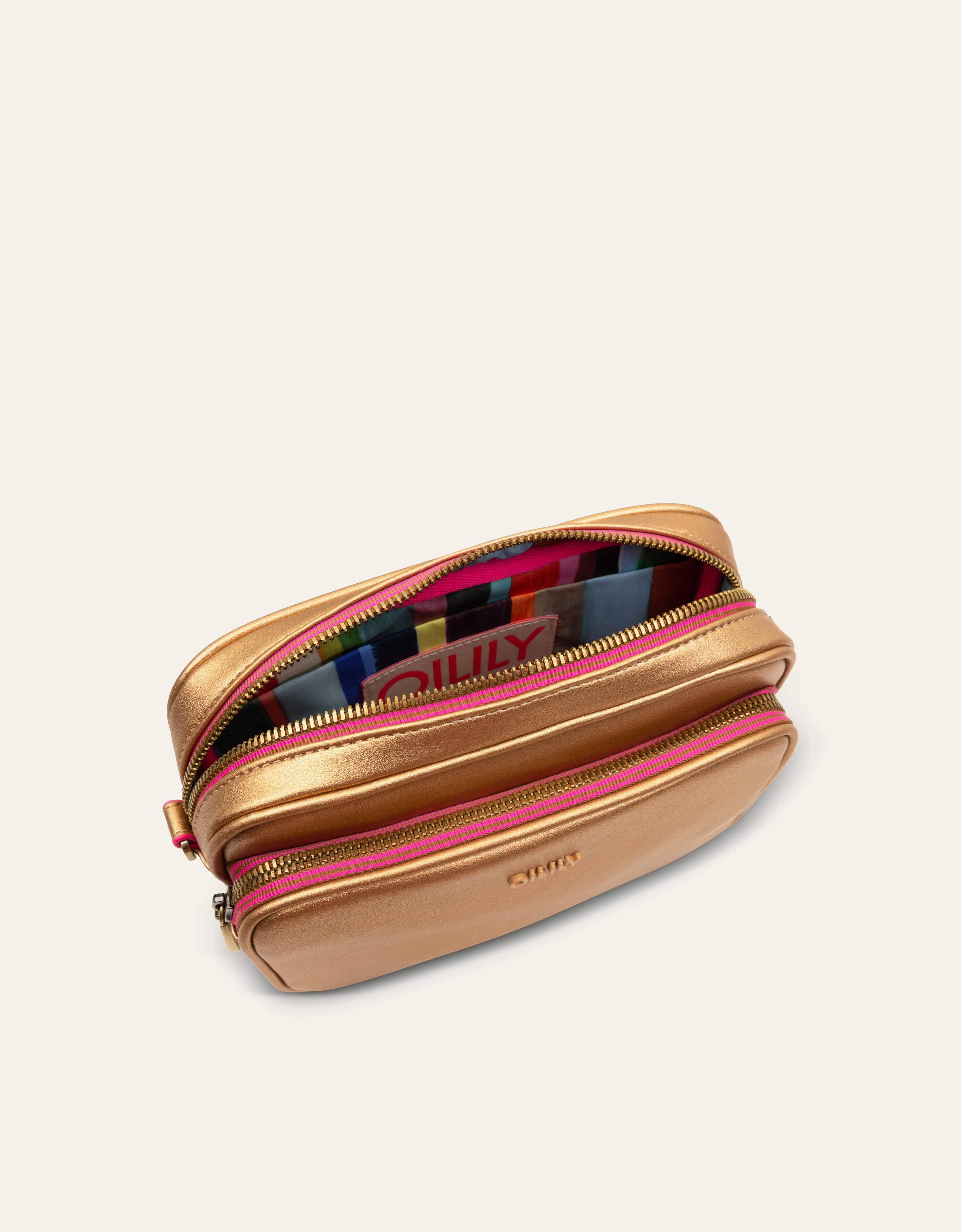 - Hoofdcompartiment met ritssluiting opent wijd en bevat een open vak van links naar rechts