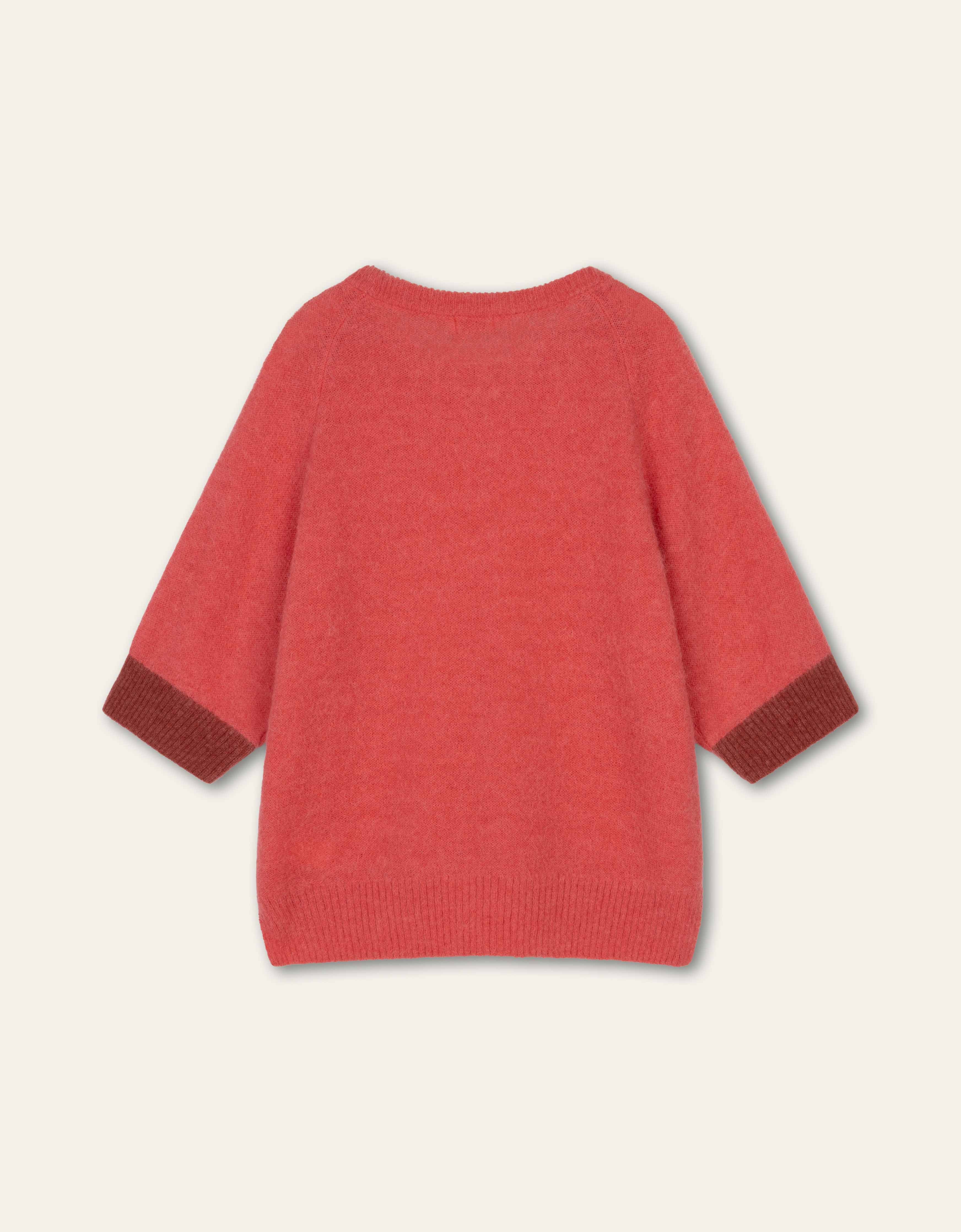 Comfortabele pullover van luxe Italiaanse kwaliteit, met loose fit en korte mouwen die net over de elleboog vallen. Subtiele colourblock-details aan de cuffs en een split aan de onderkant maken het item stijlvol en speels.