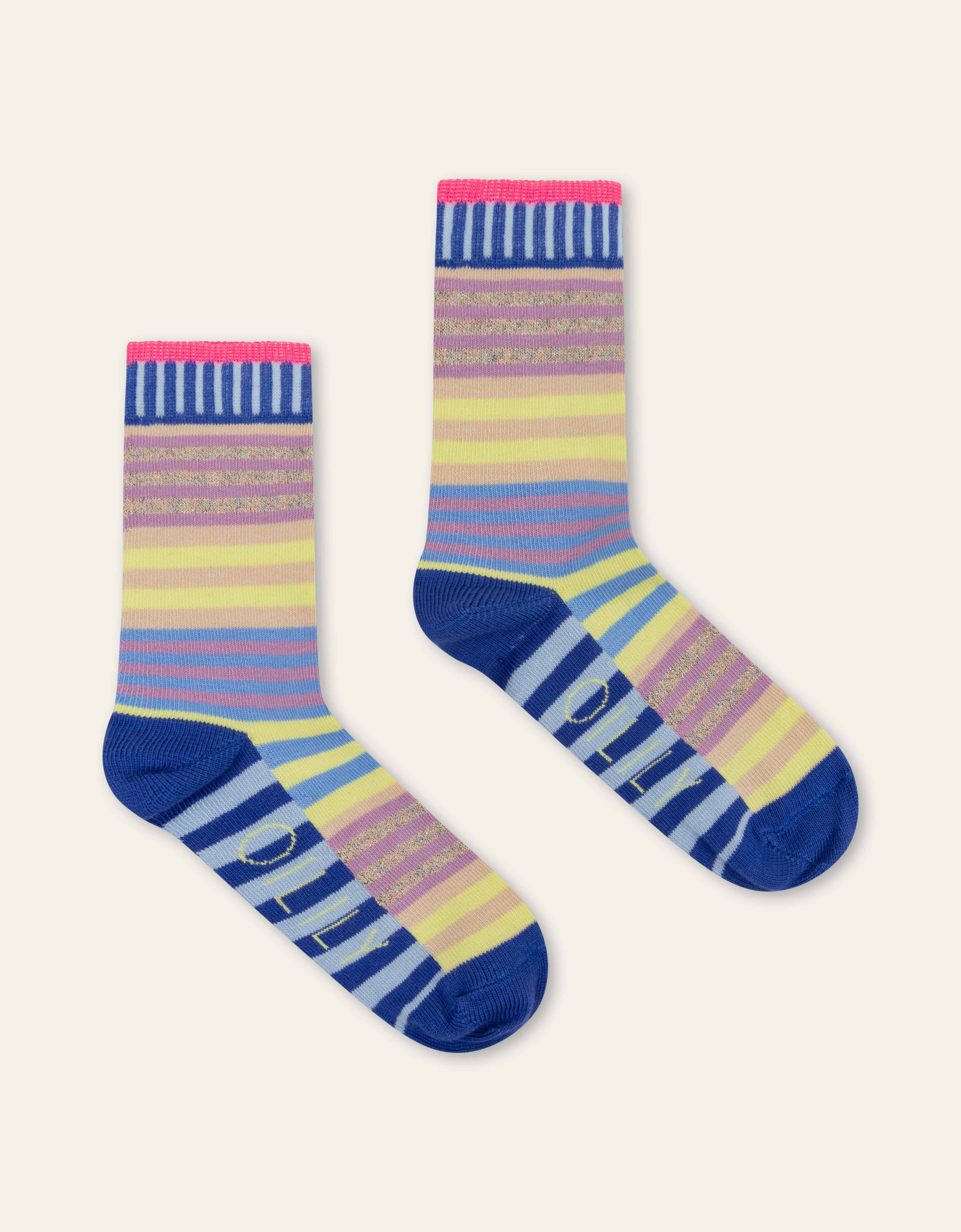 Gestreepte sokken in gezellige kleuren die ervoor zorgen je voeten er ook vrolijk bij lopen dit seizoen.