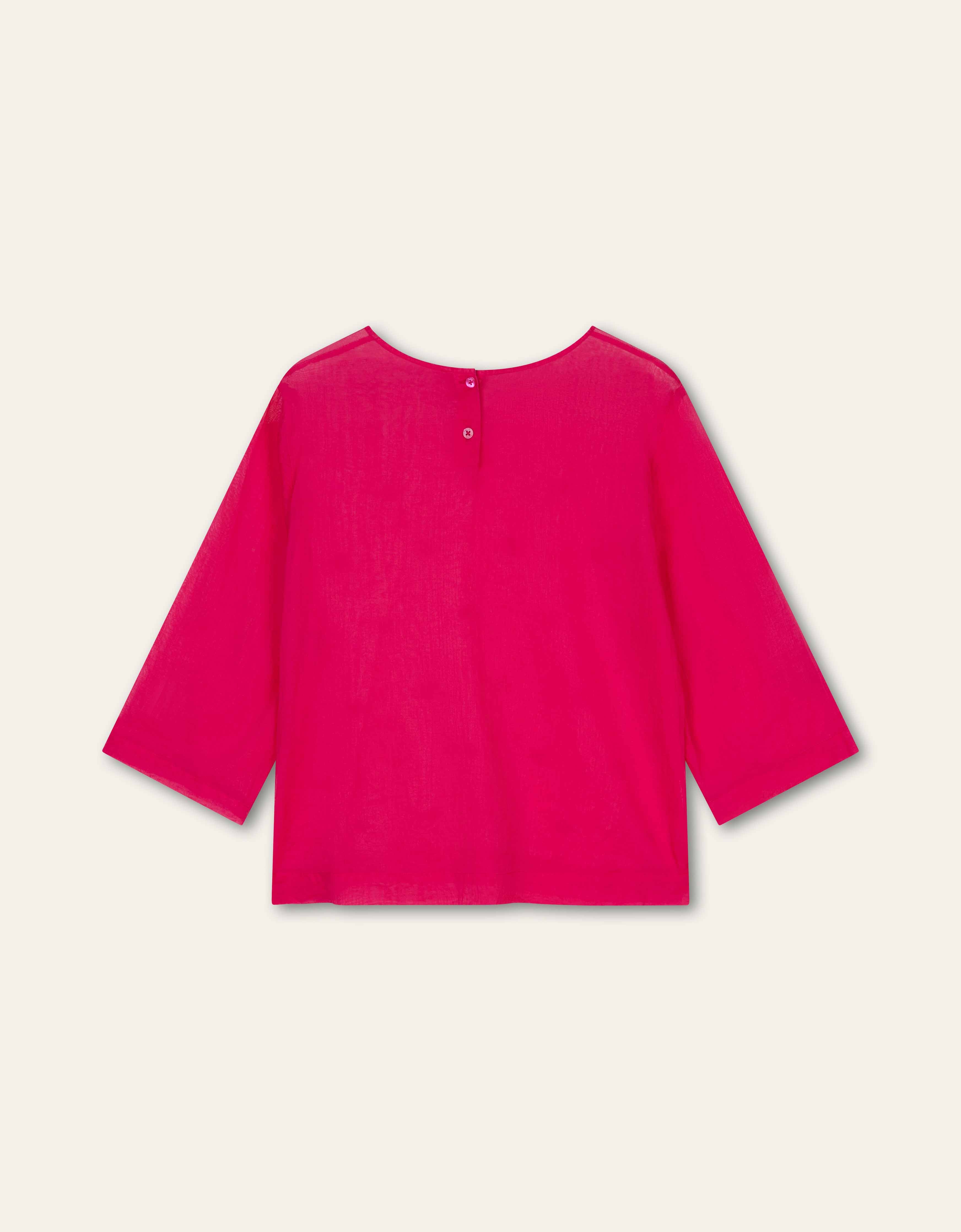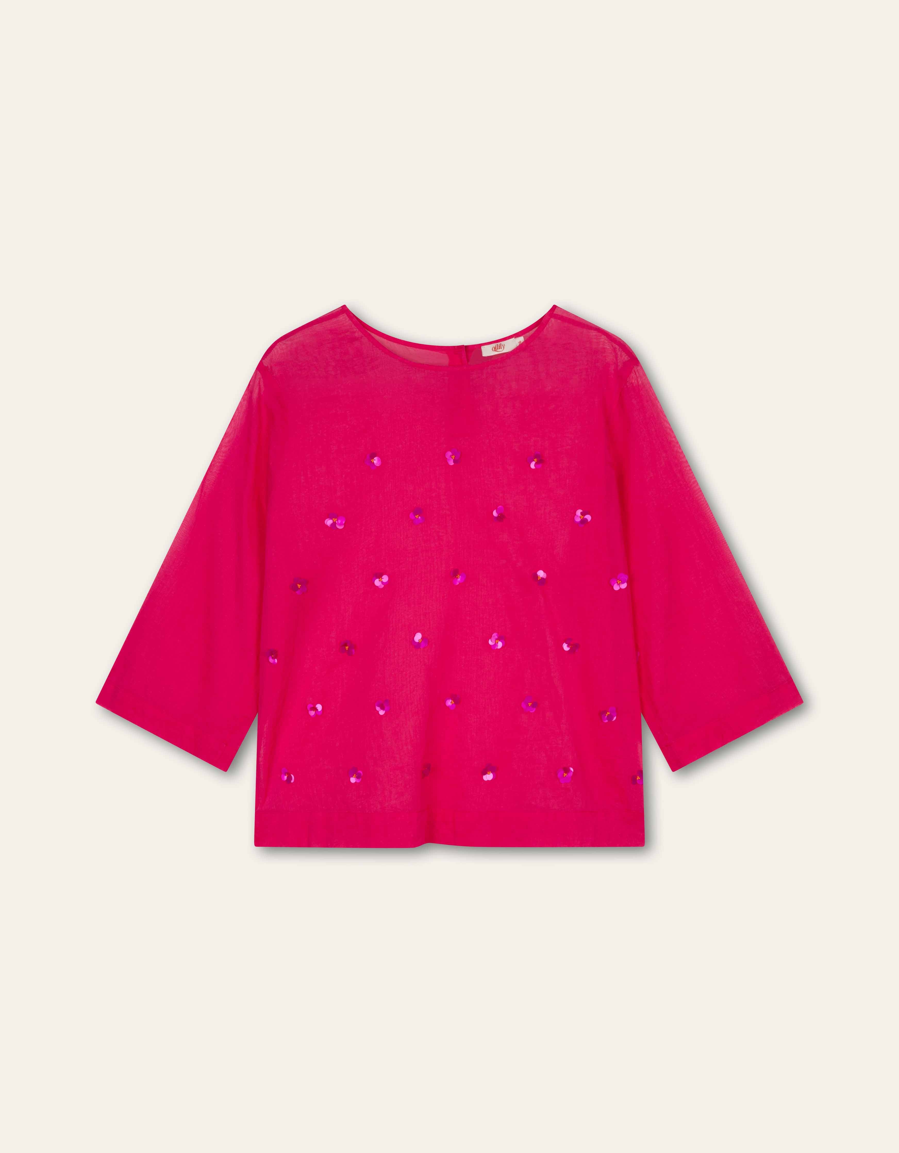 Wunderschöne leichte Baumwollbluse, leicht durchscheinend, mit 2 Knöpfen im Nacken und Ärmeln knapp über dem Ellbogen. Mit wunderschönen Pailletten verziert.