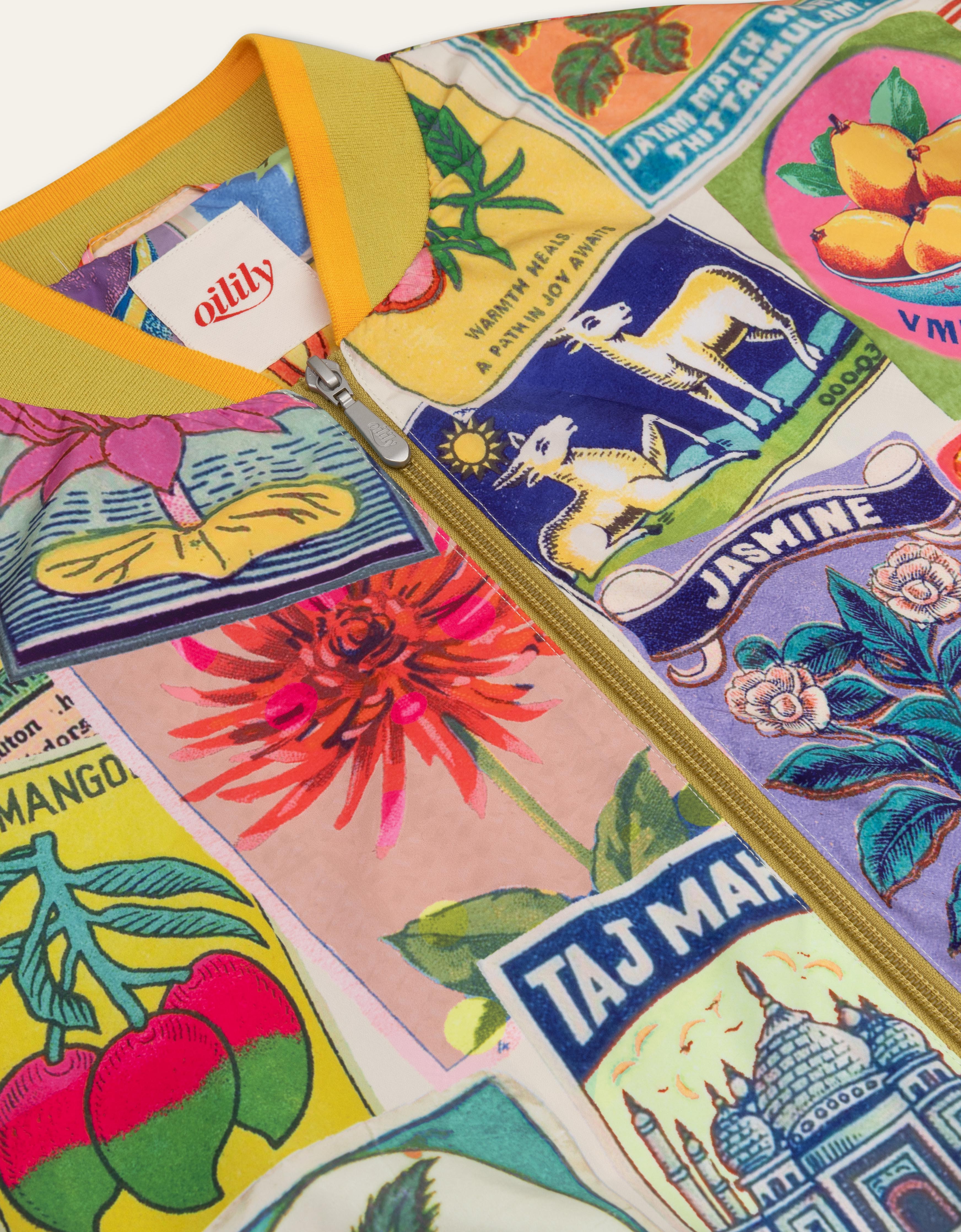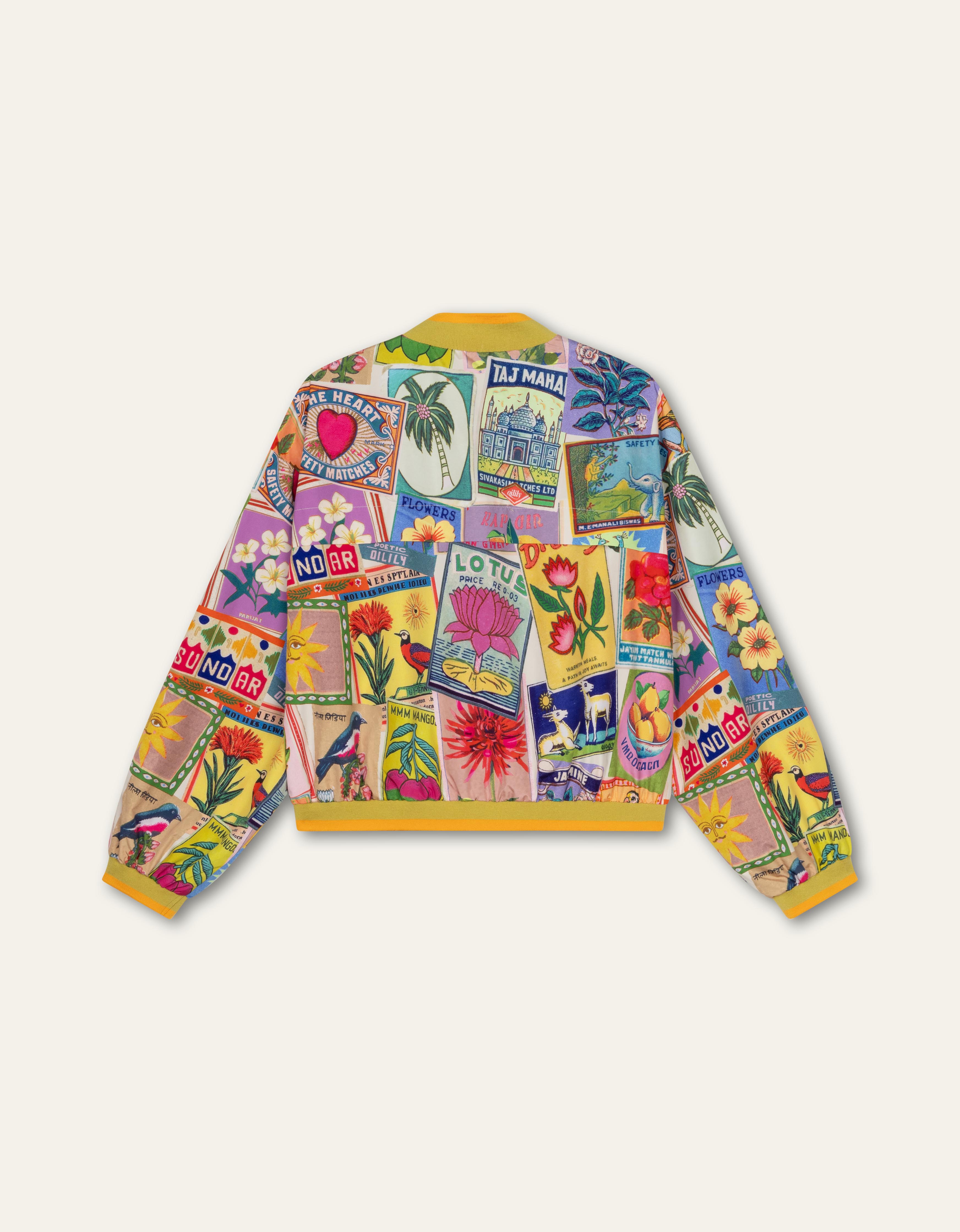 Eine Bomberjacke mit unserem Flaming Symbols Print, inspiriert von indischen Streichholzschachteln. Die Platzierung des Prints variiert je Artikel, sodass jedes T-Shirt ein Unikat ist!