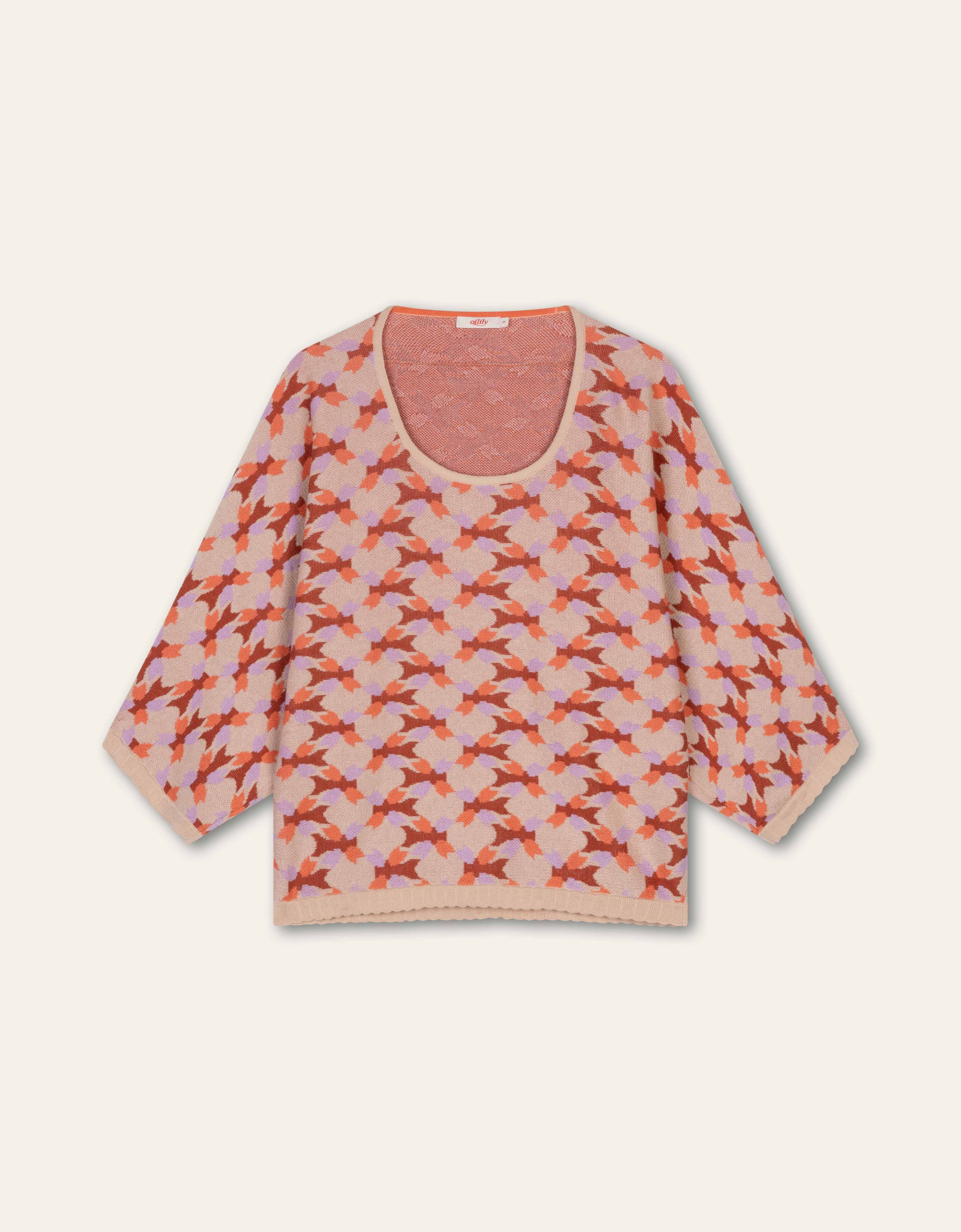 Pullover mit Fledermausärmeln und modellierten Kanten an Ärmeln und Saum für einen subtilen Akzent. Das Jacquardmuster ist eingestrickt. Fällt großzügig für eine bequeme, verspielte Silhouette.
