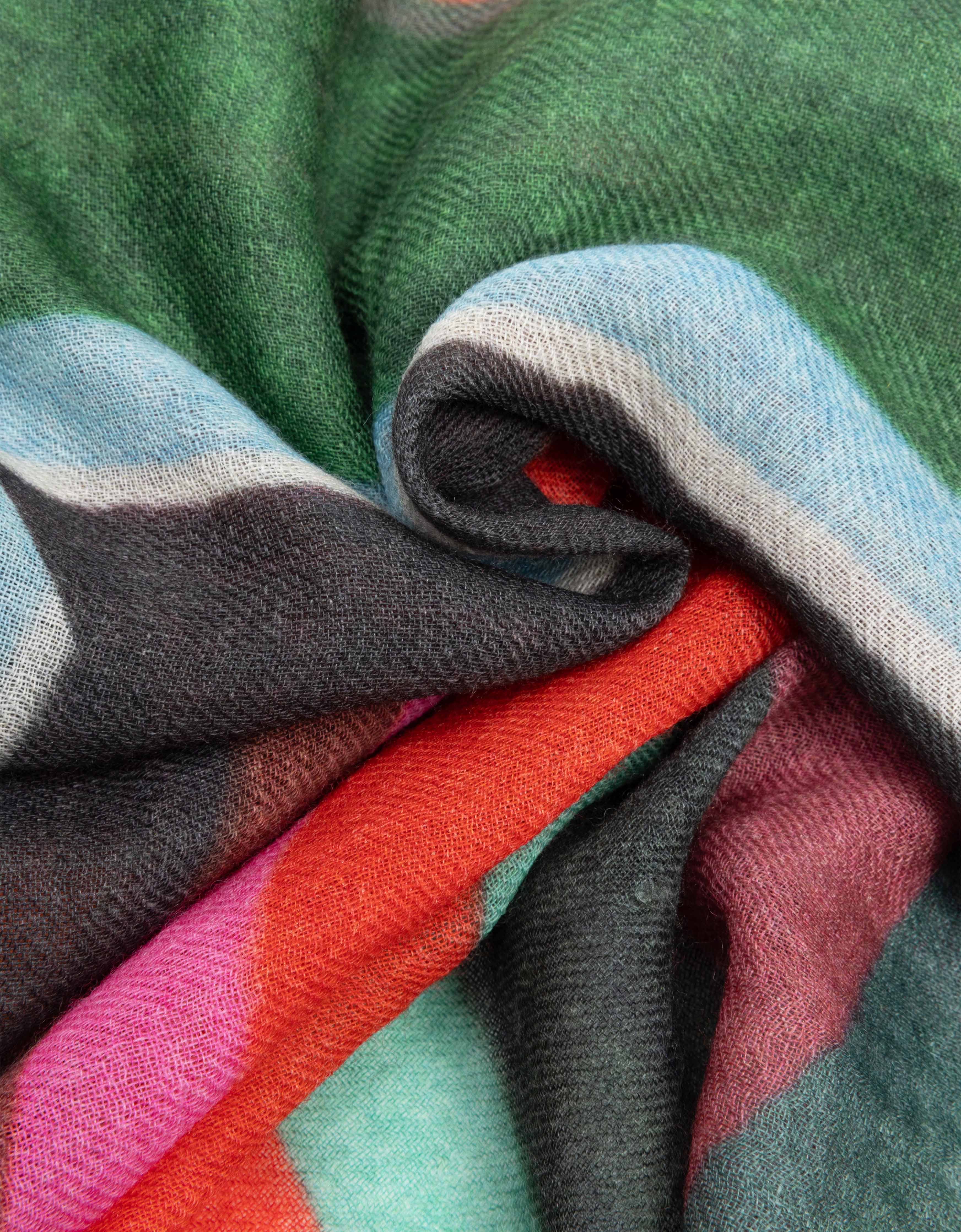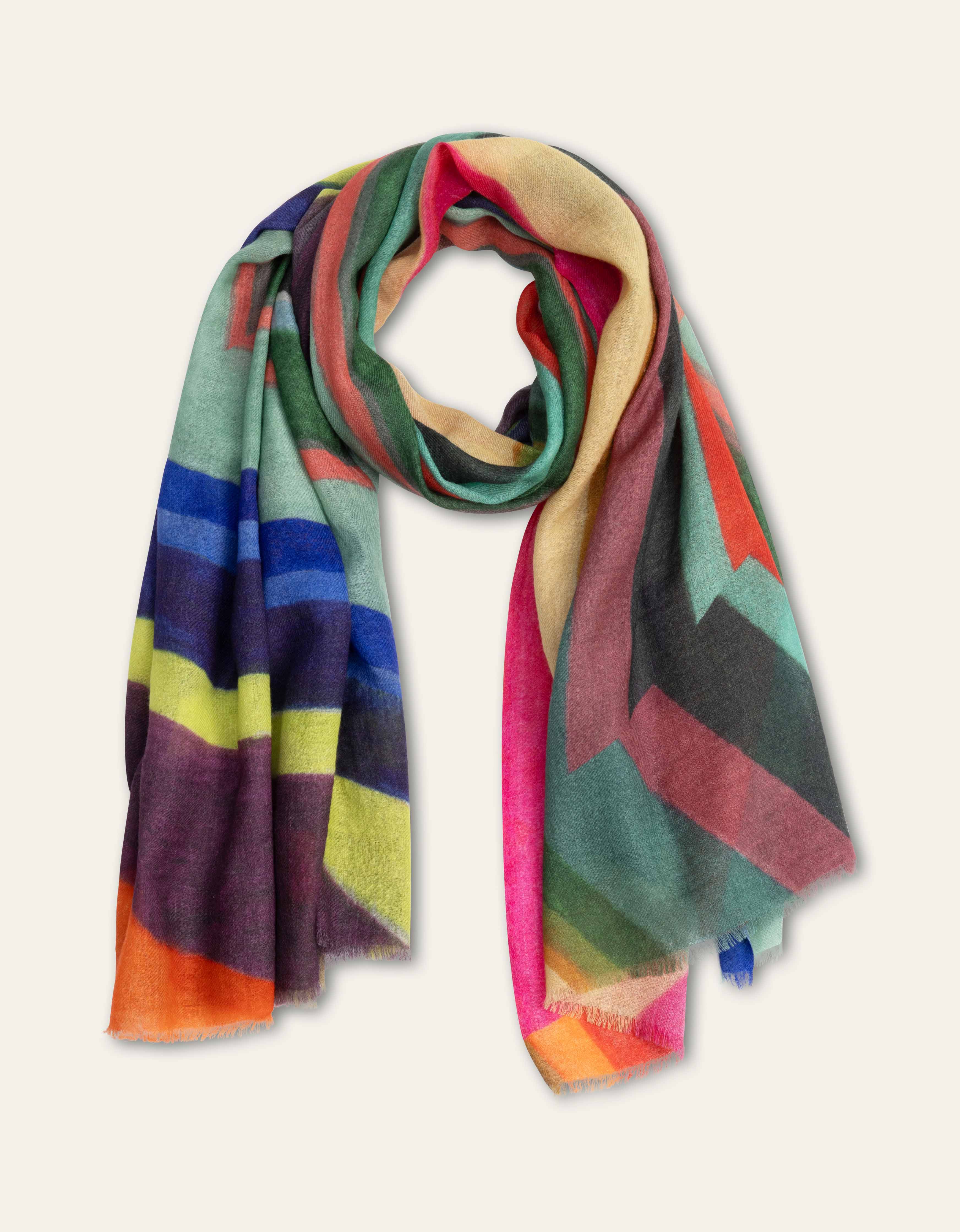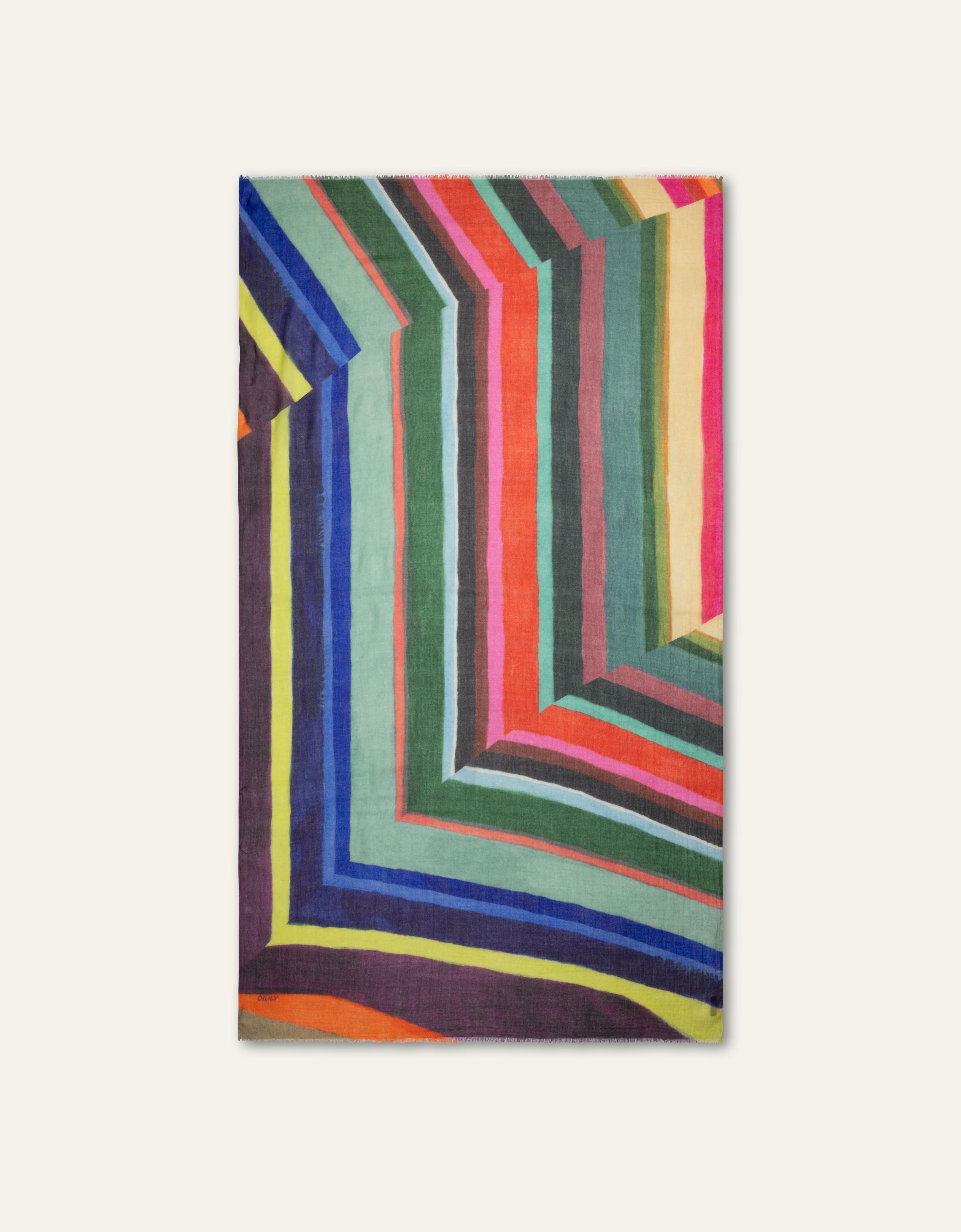 Unser Pieternelle Stripe Print ist von Tulpenfeldern aus der Vogelperspektive inspiriert. Die Farben dieses herrlichen Schals feiern die Schönheit der niederländischen Landschaft.