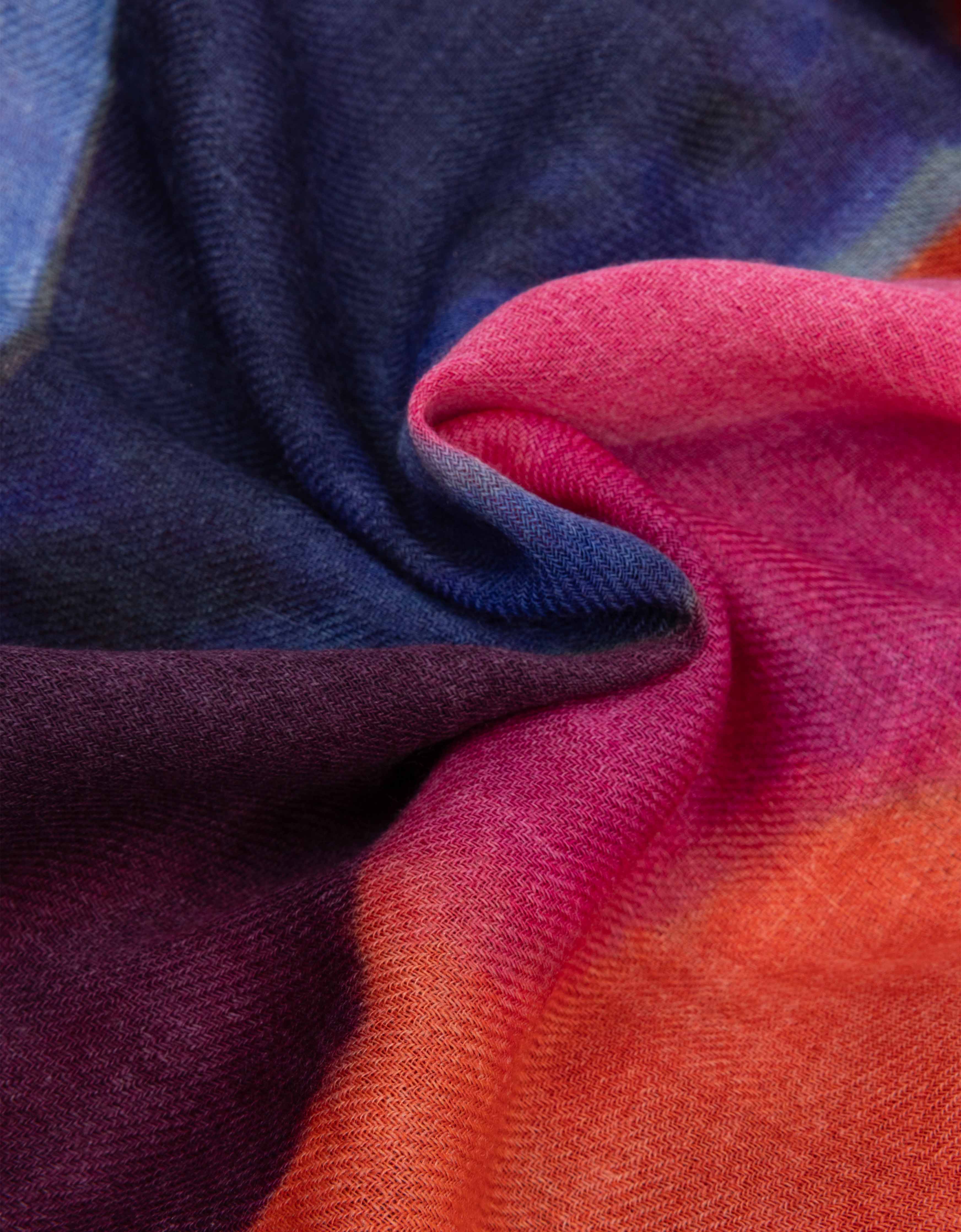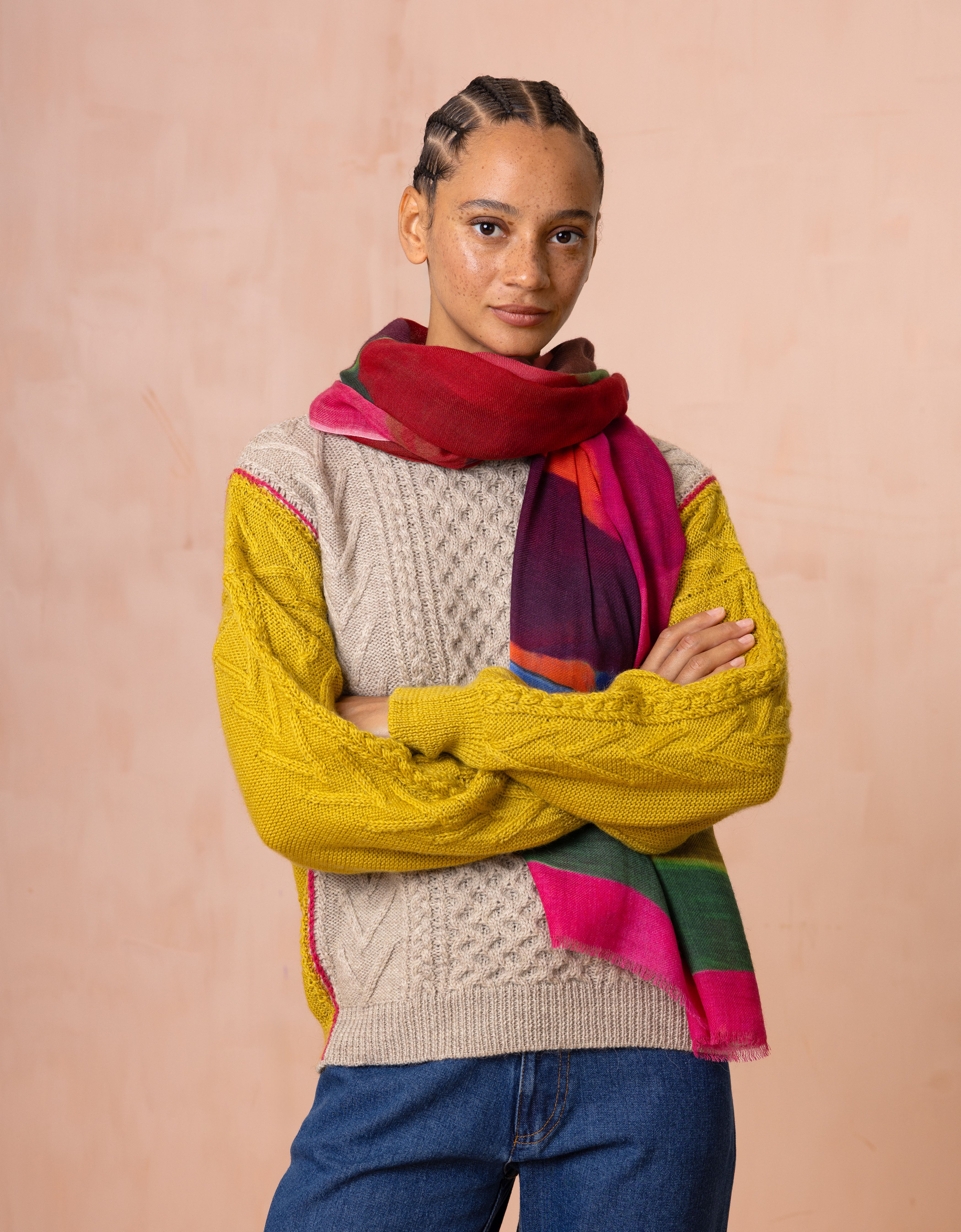 Üppige Formen, organische Kurven und kräftige Farben — all das vereint der Veerle Print. Die warme Ausstrahlung dieser Kombination aus Wolle und Seide macht diesen Schal zum puren Tragevergnügen.