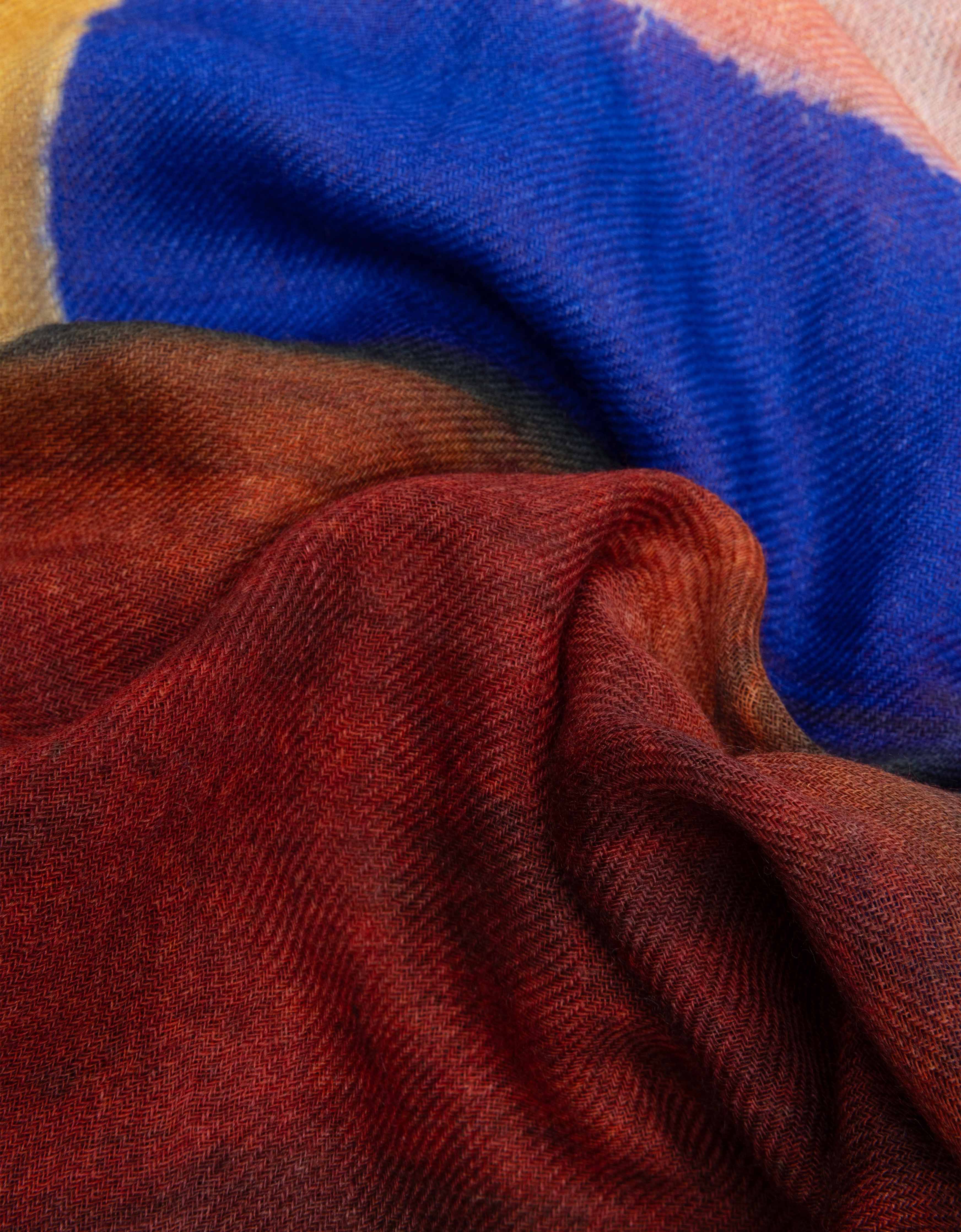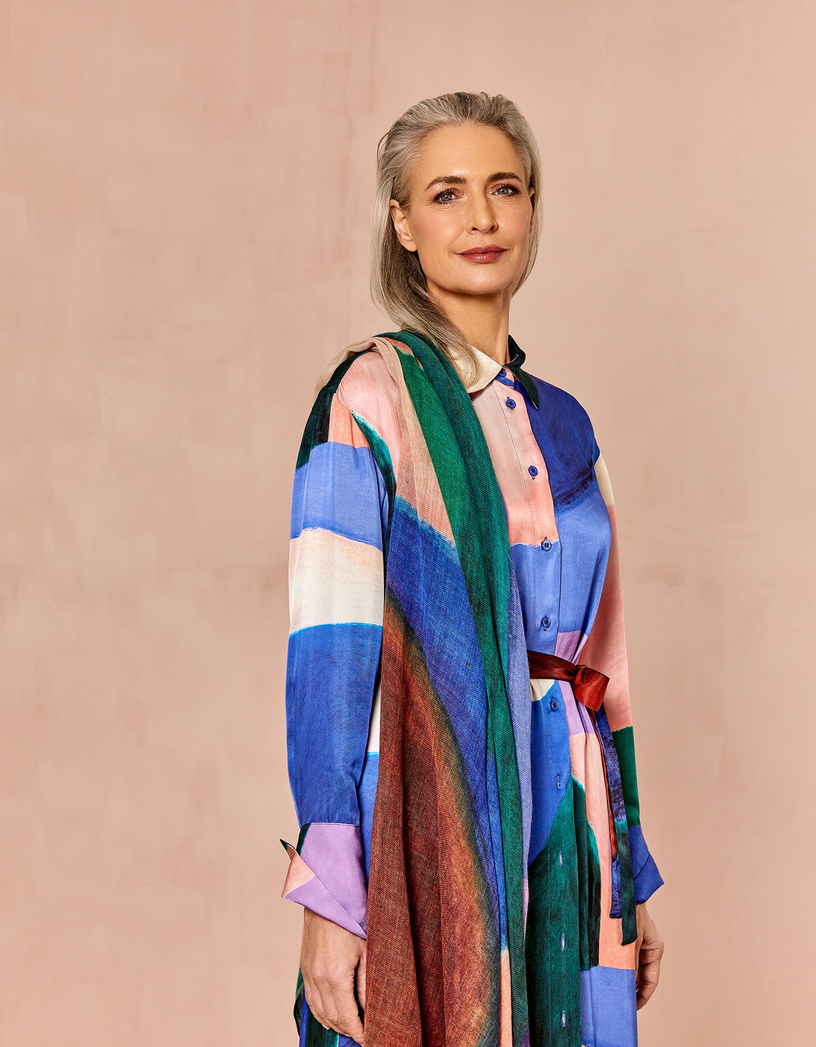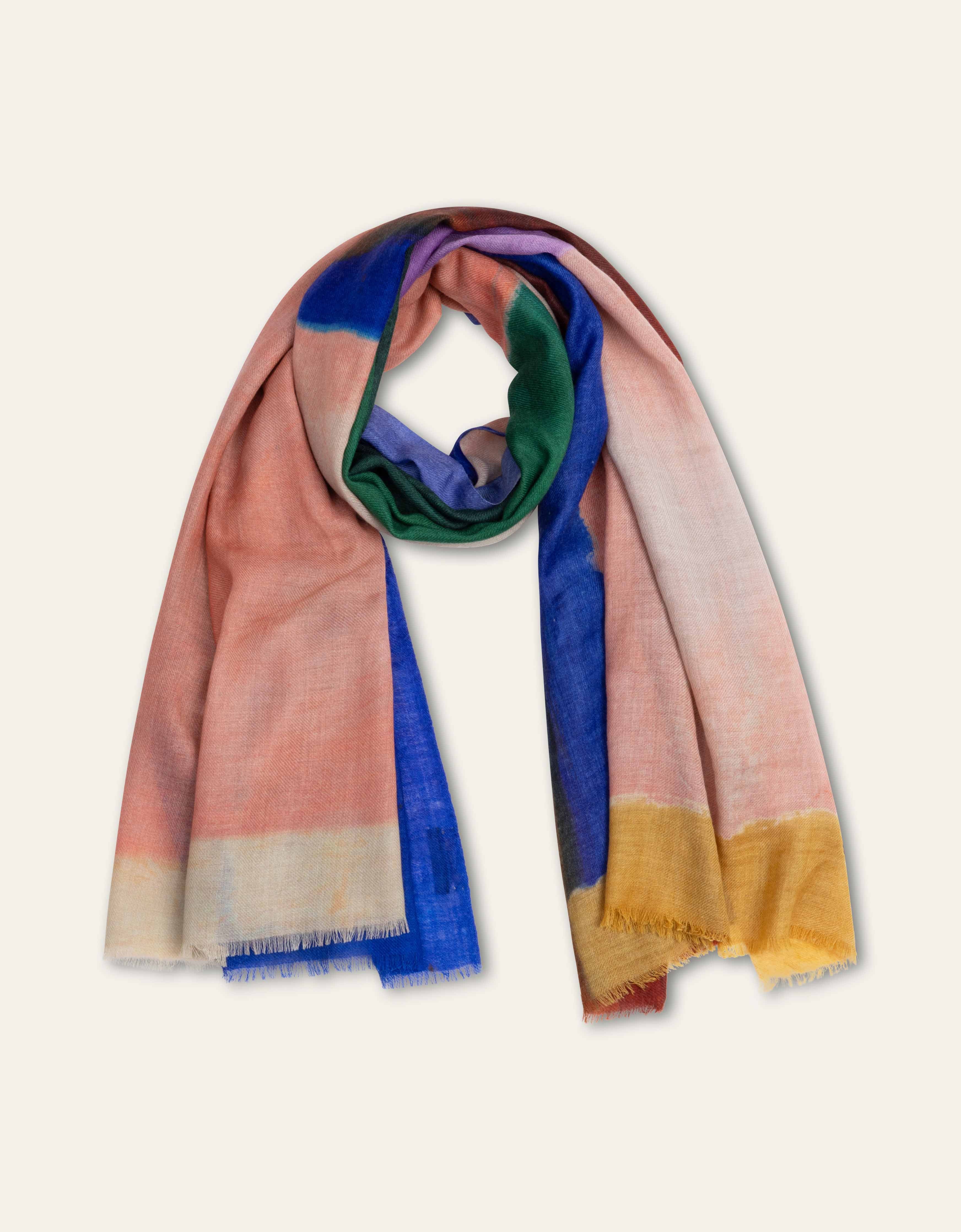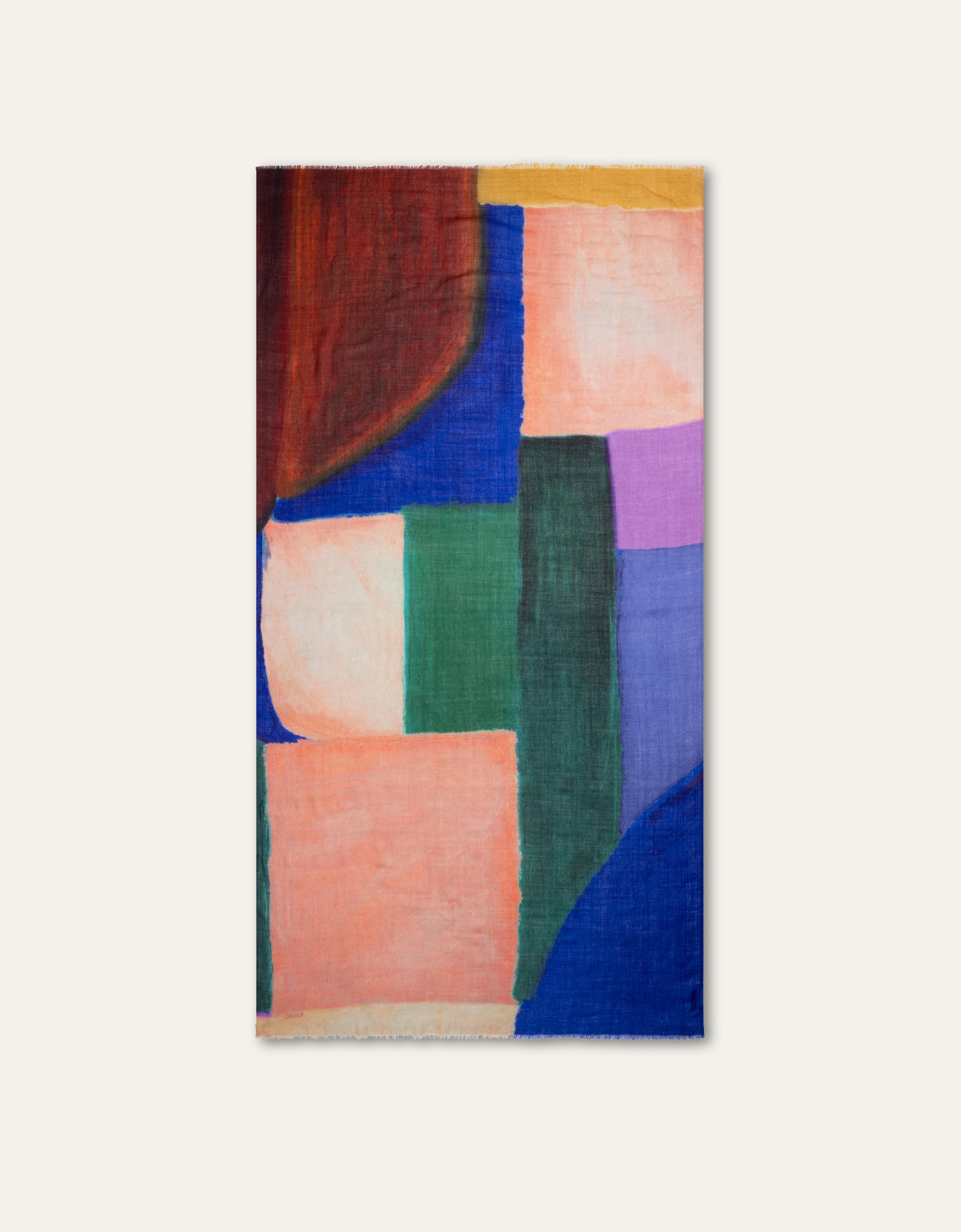 Schottland lieferte Inspiration noch und nöcher — vor allem seine atemberaubende Natur. Daraus entstand Highland Hues: ein gemaltes Muster in natürlichen Farben und abstrakten Formen. Ein echter Hingucker auf diesem Schal.