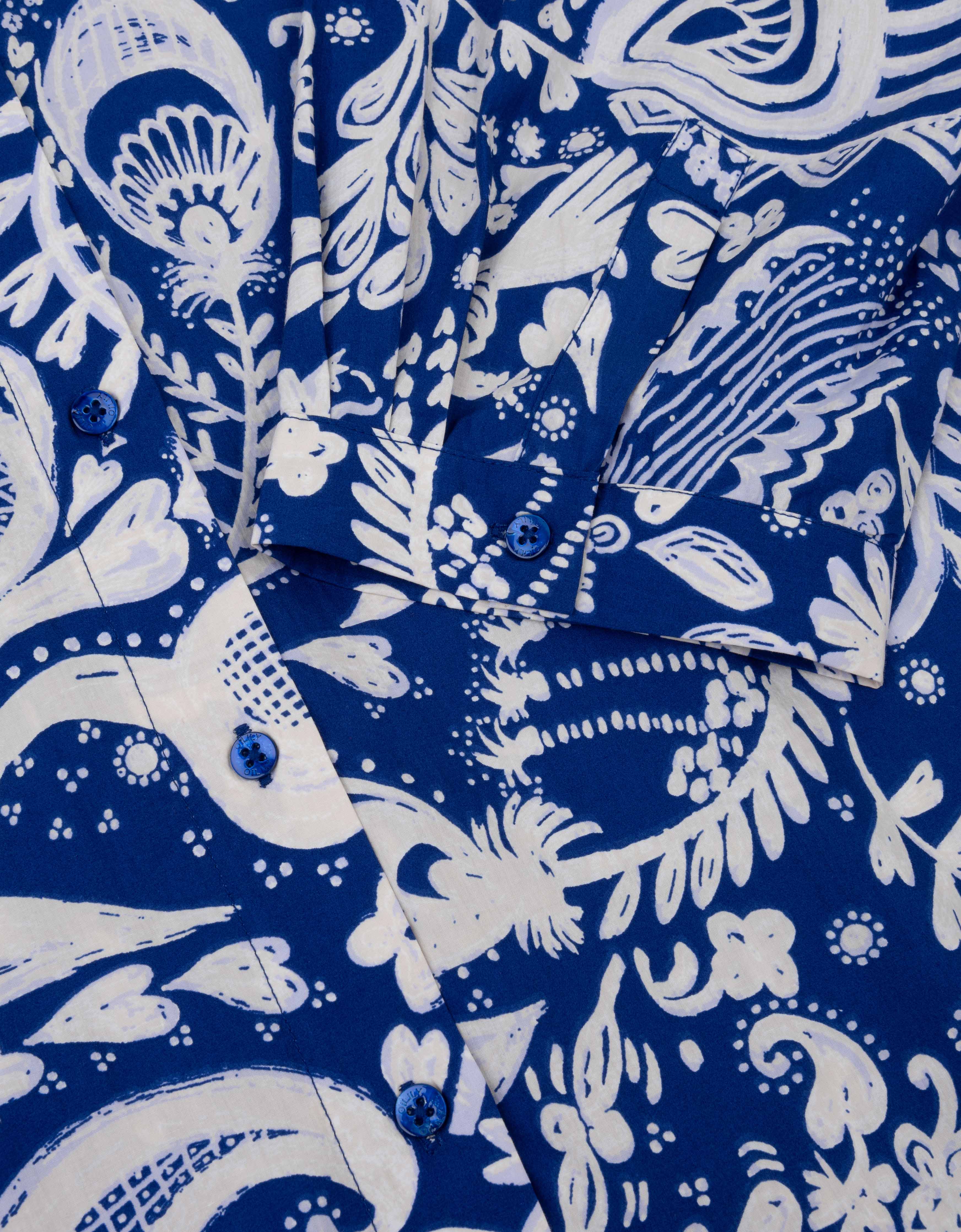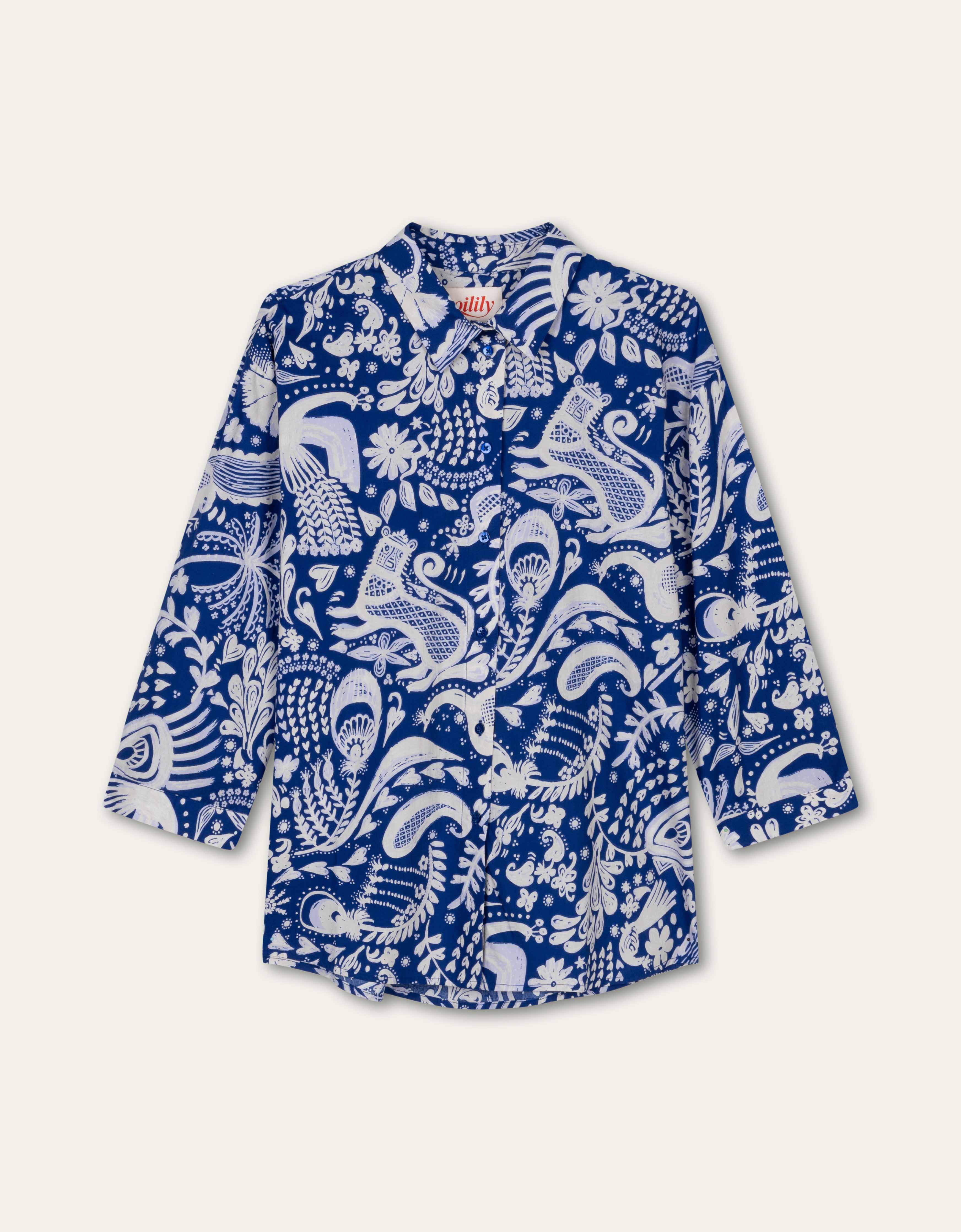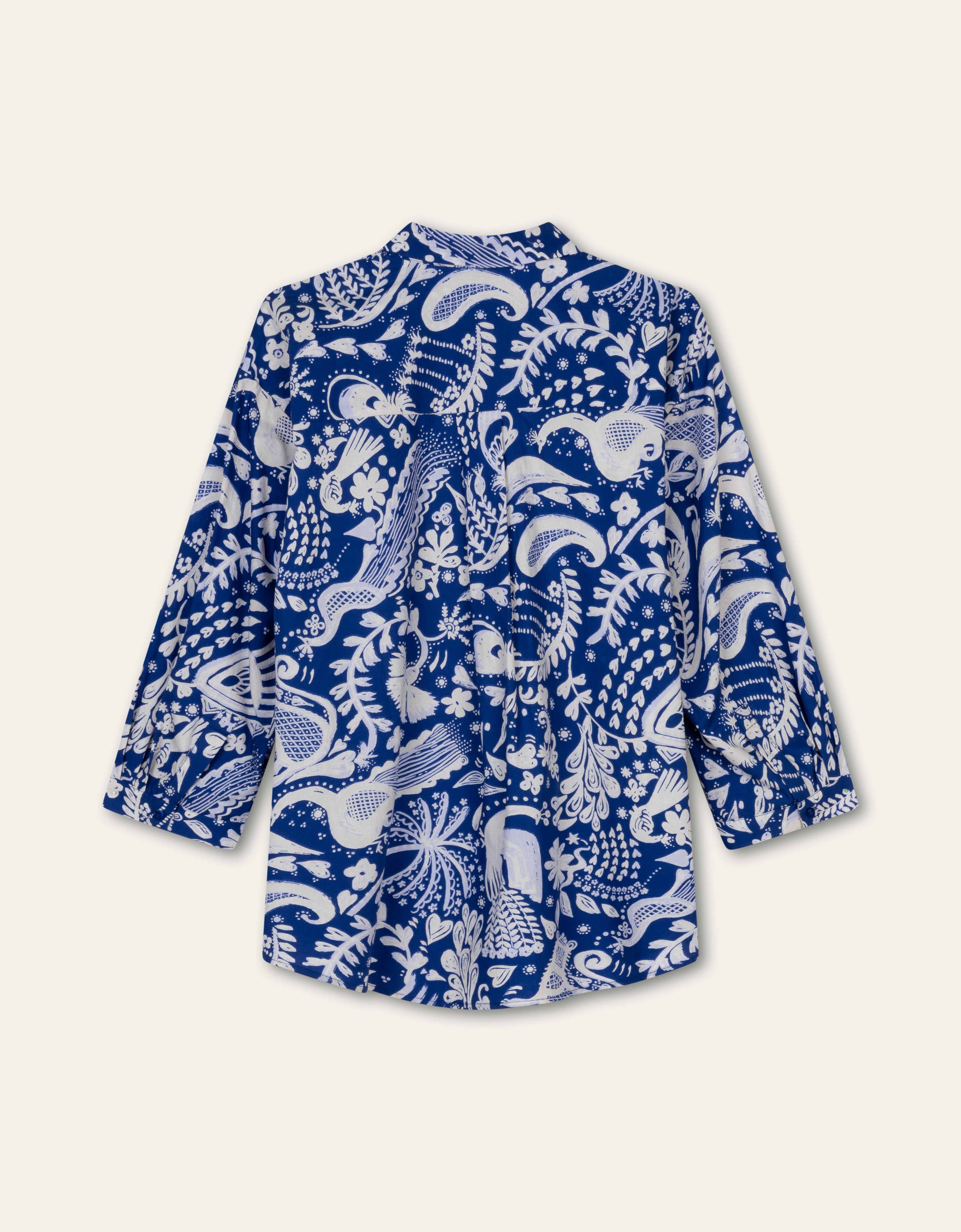 Luftige Baumwollbluse mit 5/6-Ärmeln, einer kastenförmigen, aber längeren Passform und einem verspielten Print. Mit blauen Perlmuttknöpfen verziert, die einen subtilen, eleganten Akzent setzen.