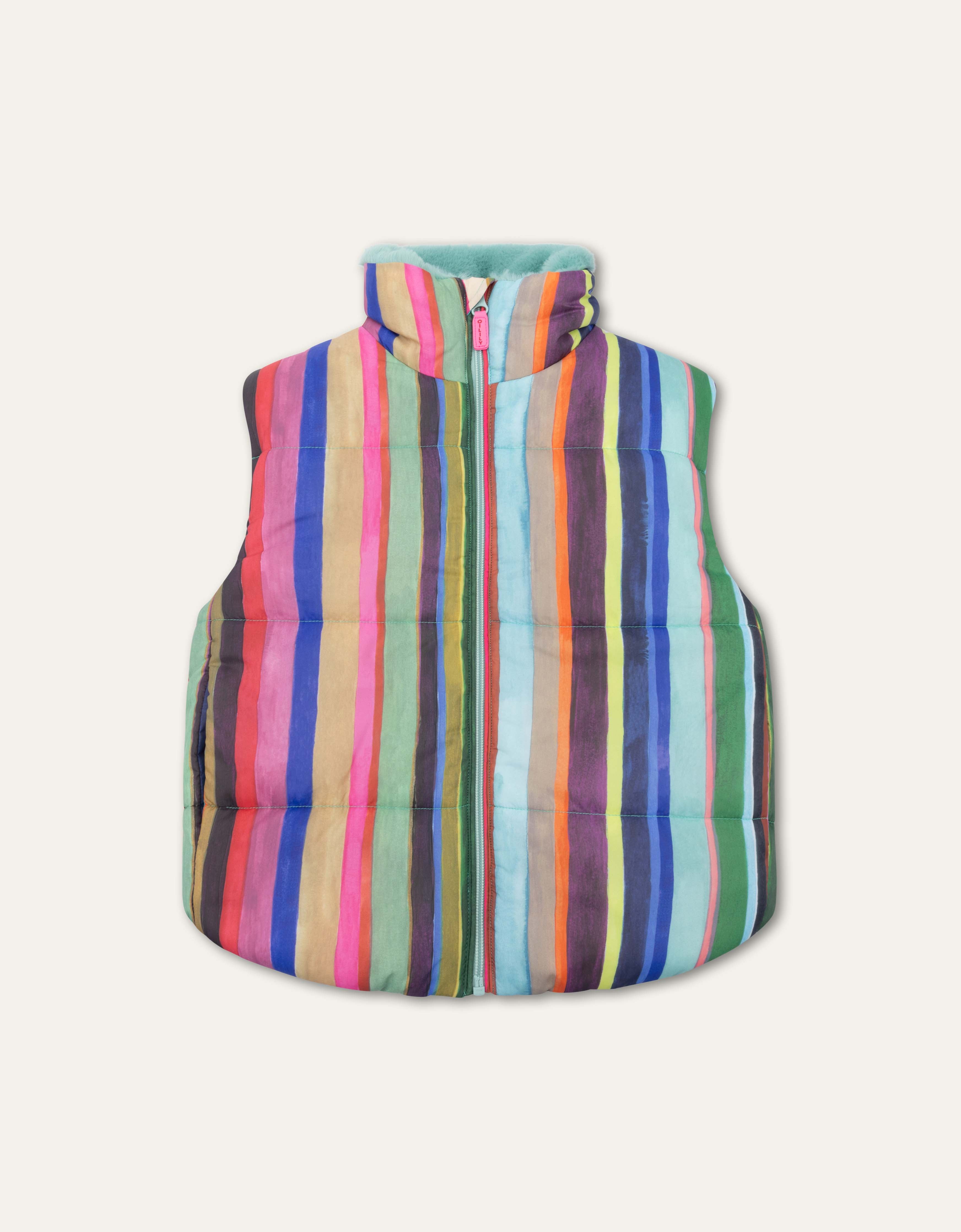 Beim Gestalten des Waverly Prints haben wir Formen ausgemalt und sie dann zu einer Collage zusammengestellt. Der Print begrüßt dich auf dieser Weste fröhlich und kuschelig weich. Die Innenseite ist mit Kunstfell gefüttert und außen befindet sich ein Smiley-Aufnäher.