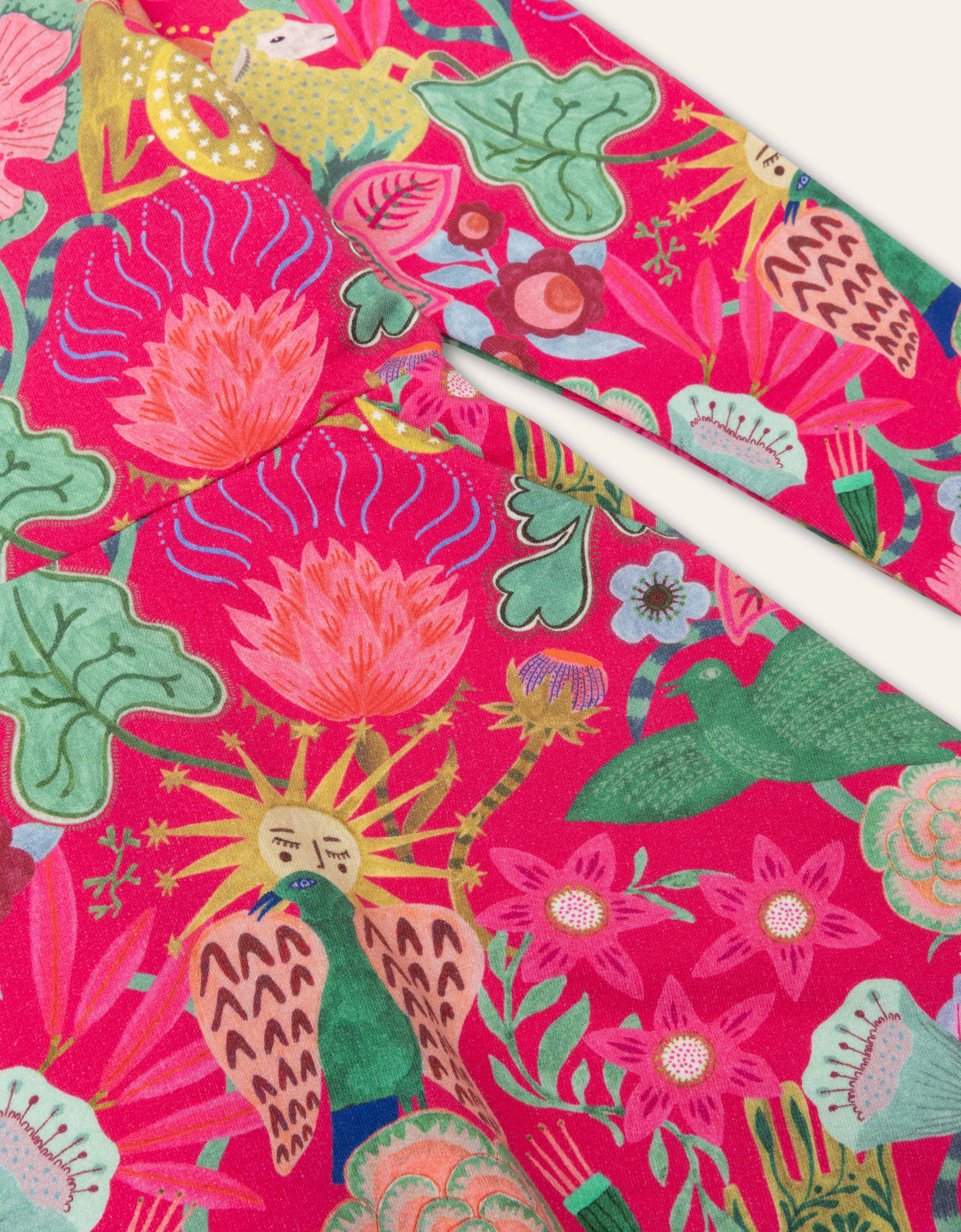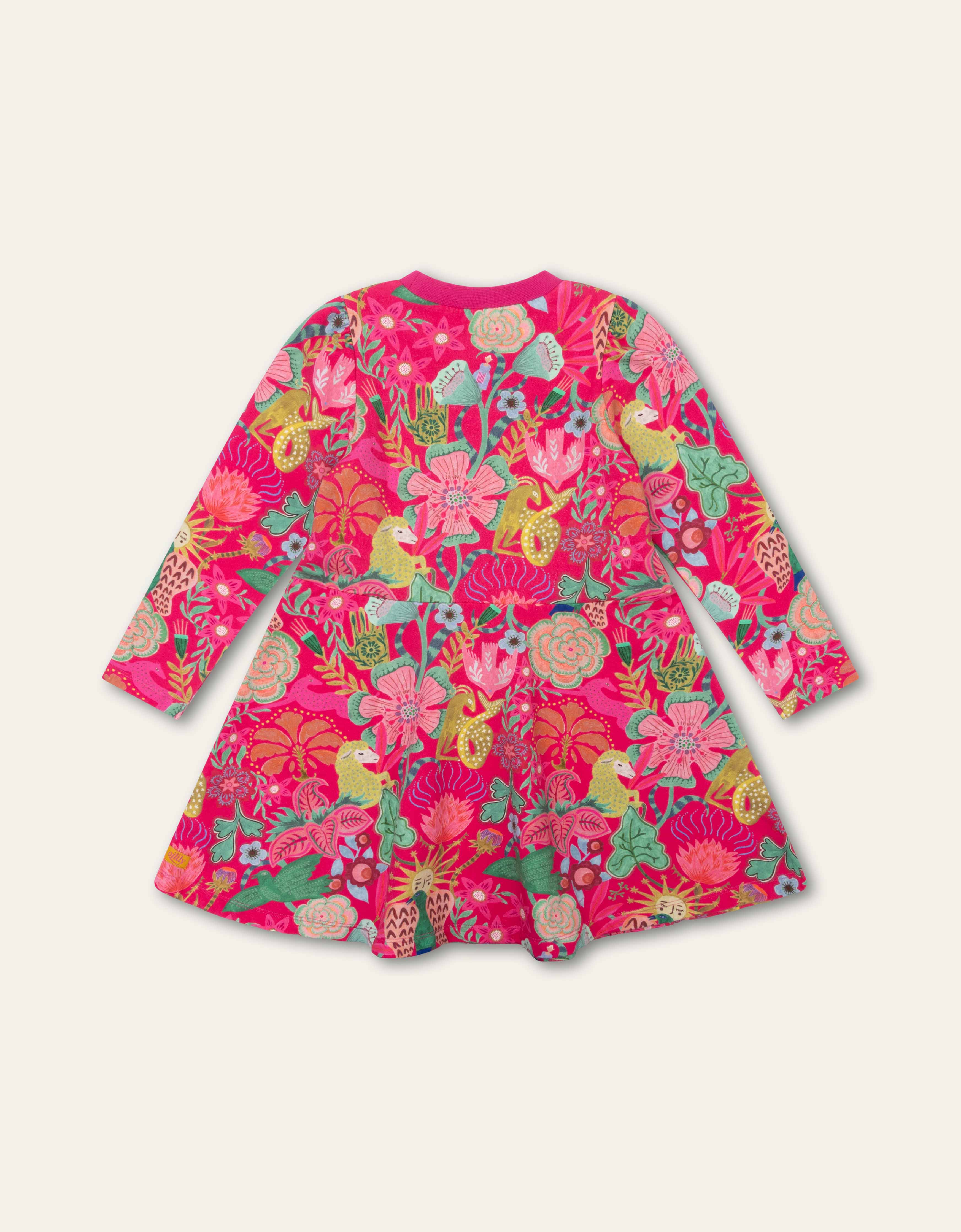 Ein Kleid, das sich wunderbar leicht anziehen lässt mit dehnbarem Kragen und weicher Baumwolle. Die bunten Blumen des Schokland Treasures Prints machen es besonders üppig.