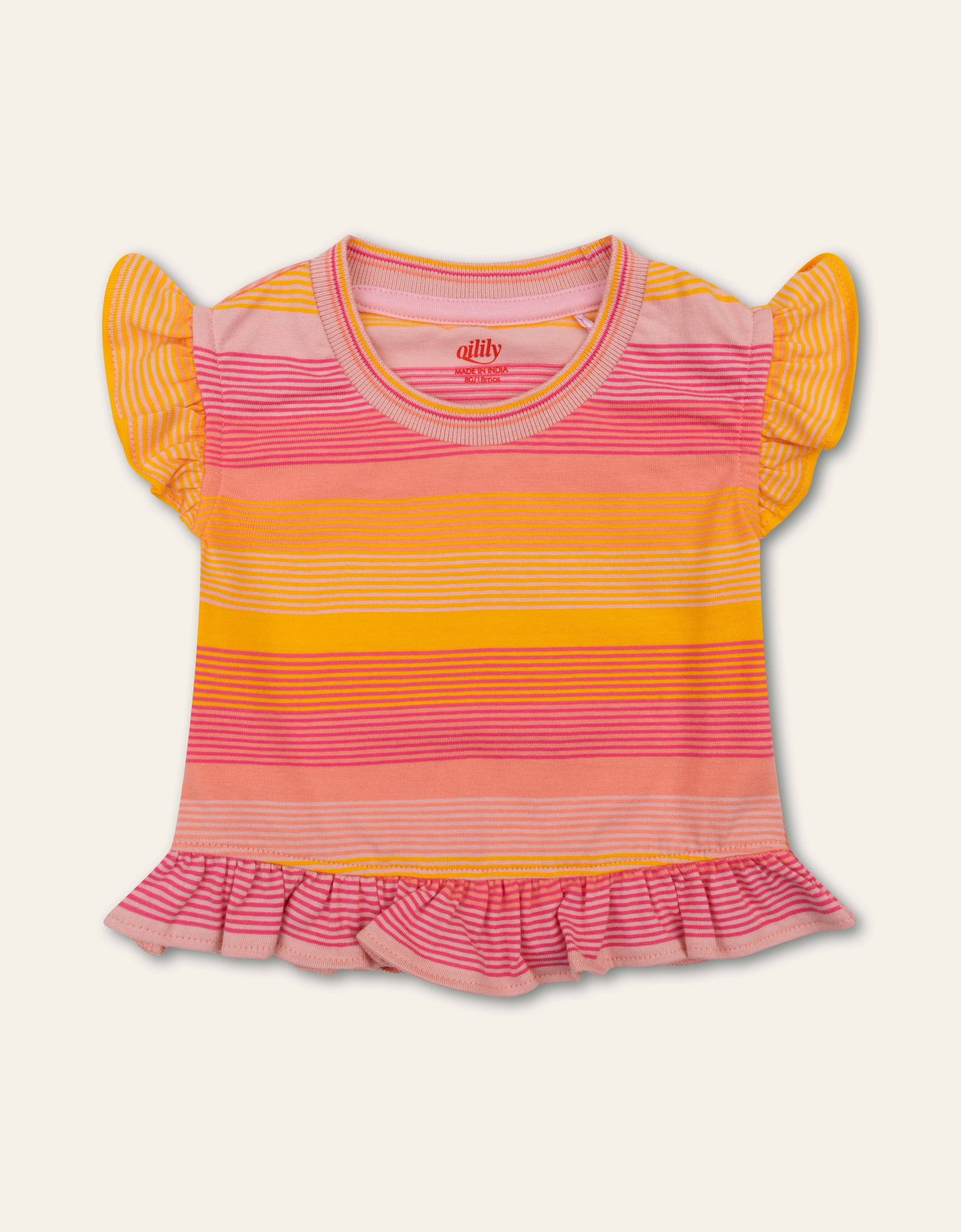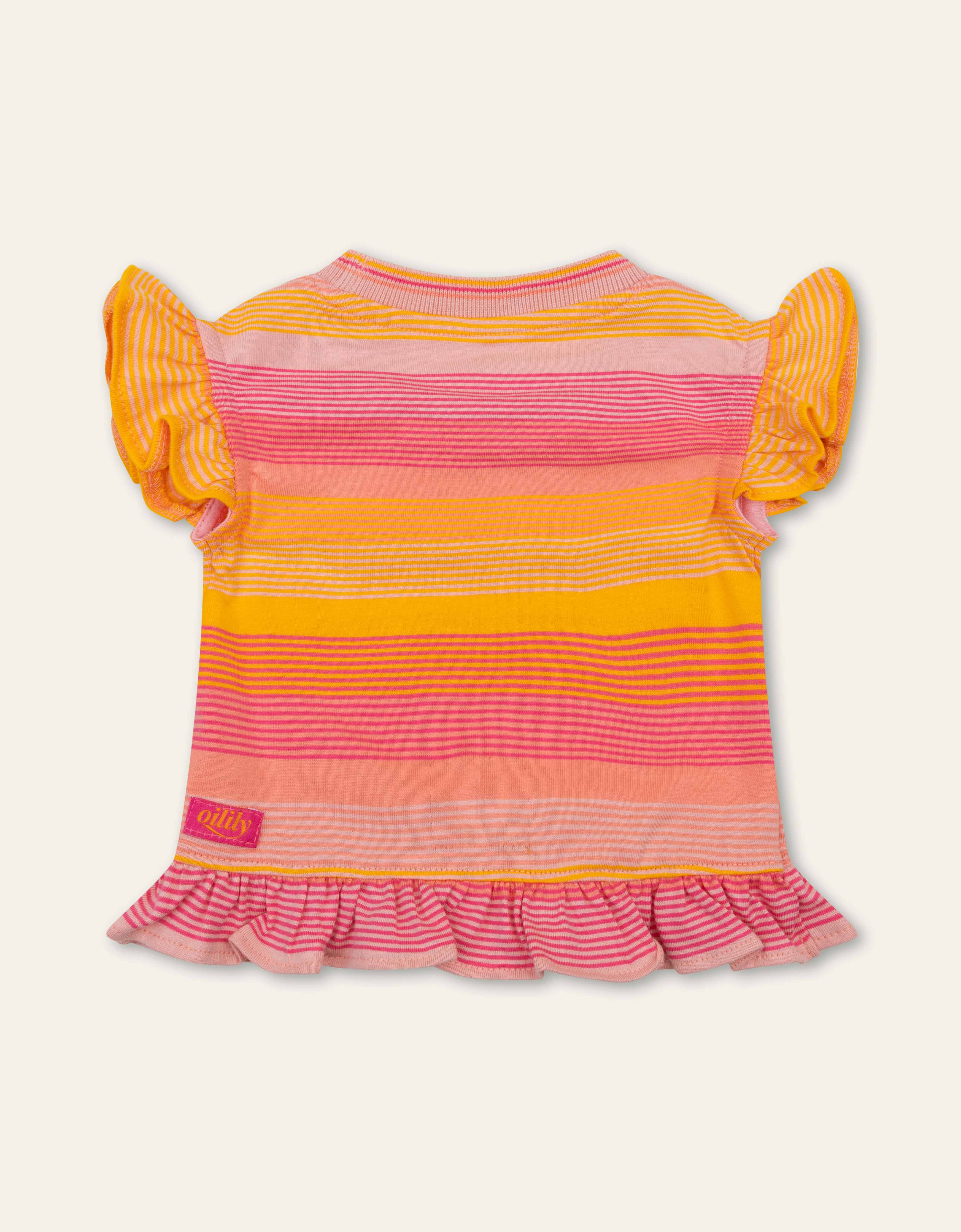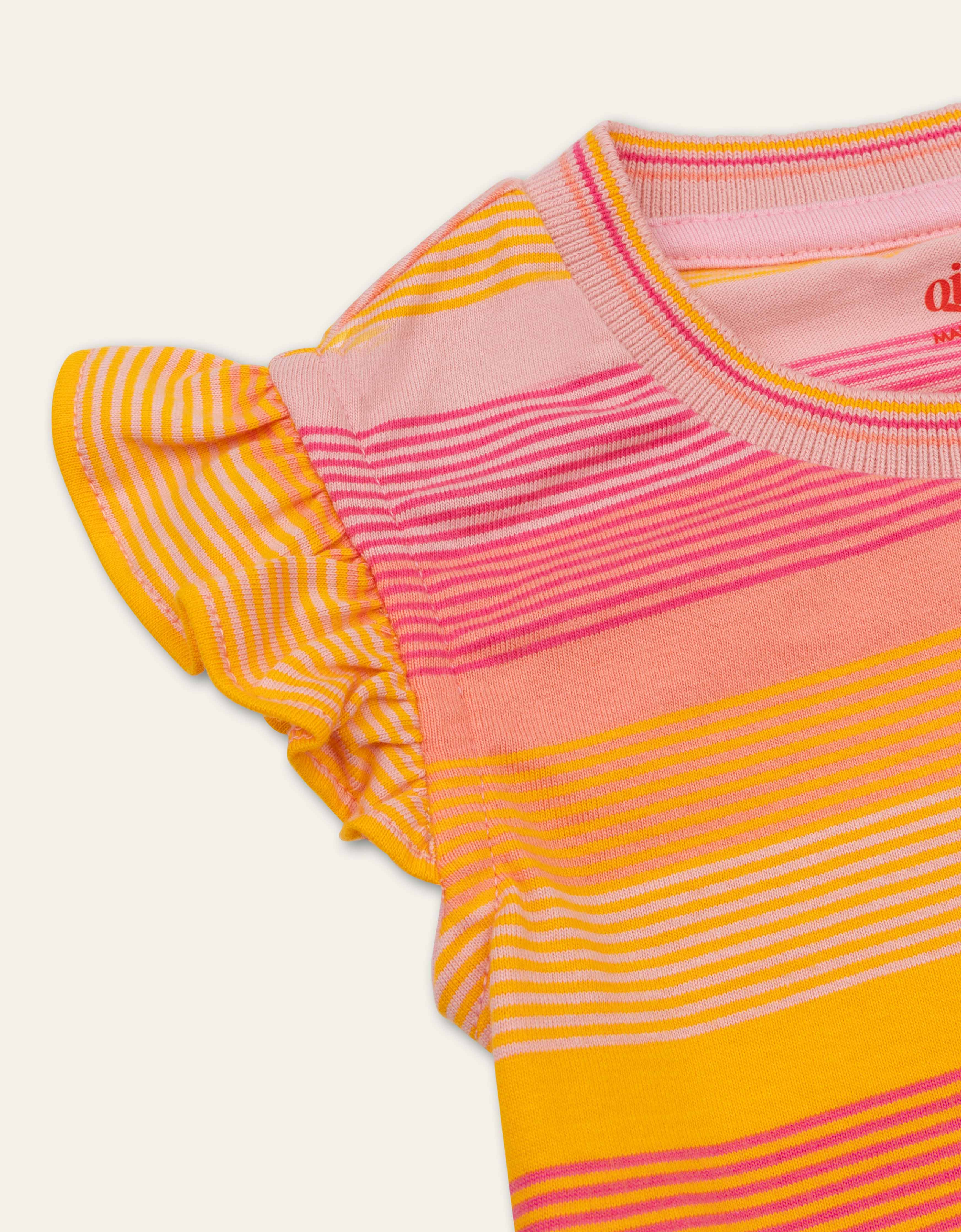 Dieses T-Shirt mit Rüschen an den Ärmeln und am Saum sorgt für einen verspielten Touch. Die garngefärbten Streifen in zarten Rosatönen sind von Jaipur, der rosa Stadt Indiens, inspiriert – einem Symbol für Gastfreundschaft und Sonnenschein.