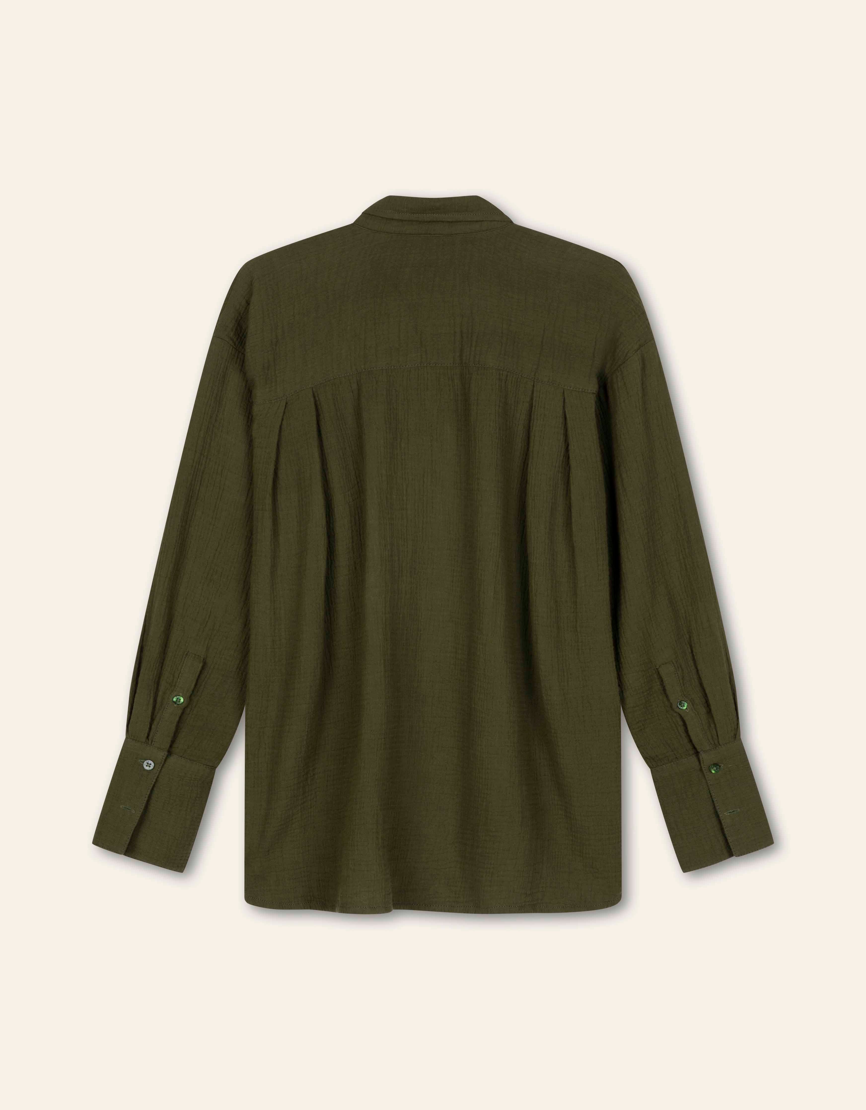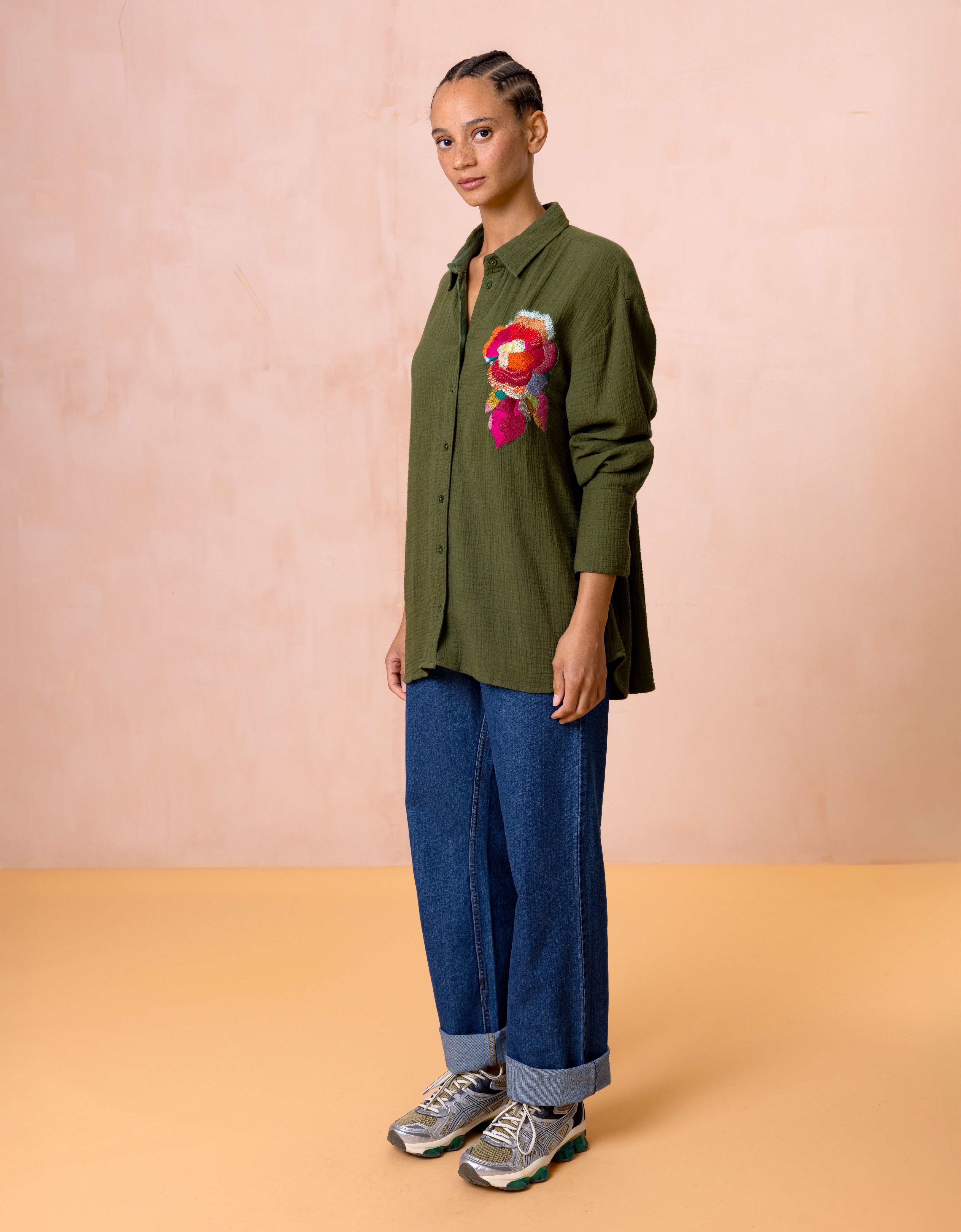 Diese Bluse aus Waffelbaumwolle in Rifle Green ist ein echtes Lieblingsstück. Sie liegt weich und warm auf der Haut und die fein gestickte Blume macht das Bild perfekt.