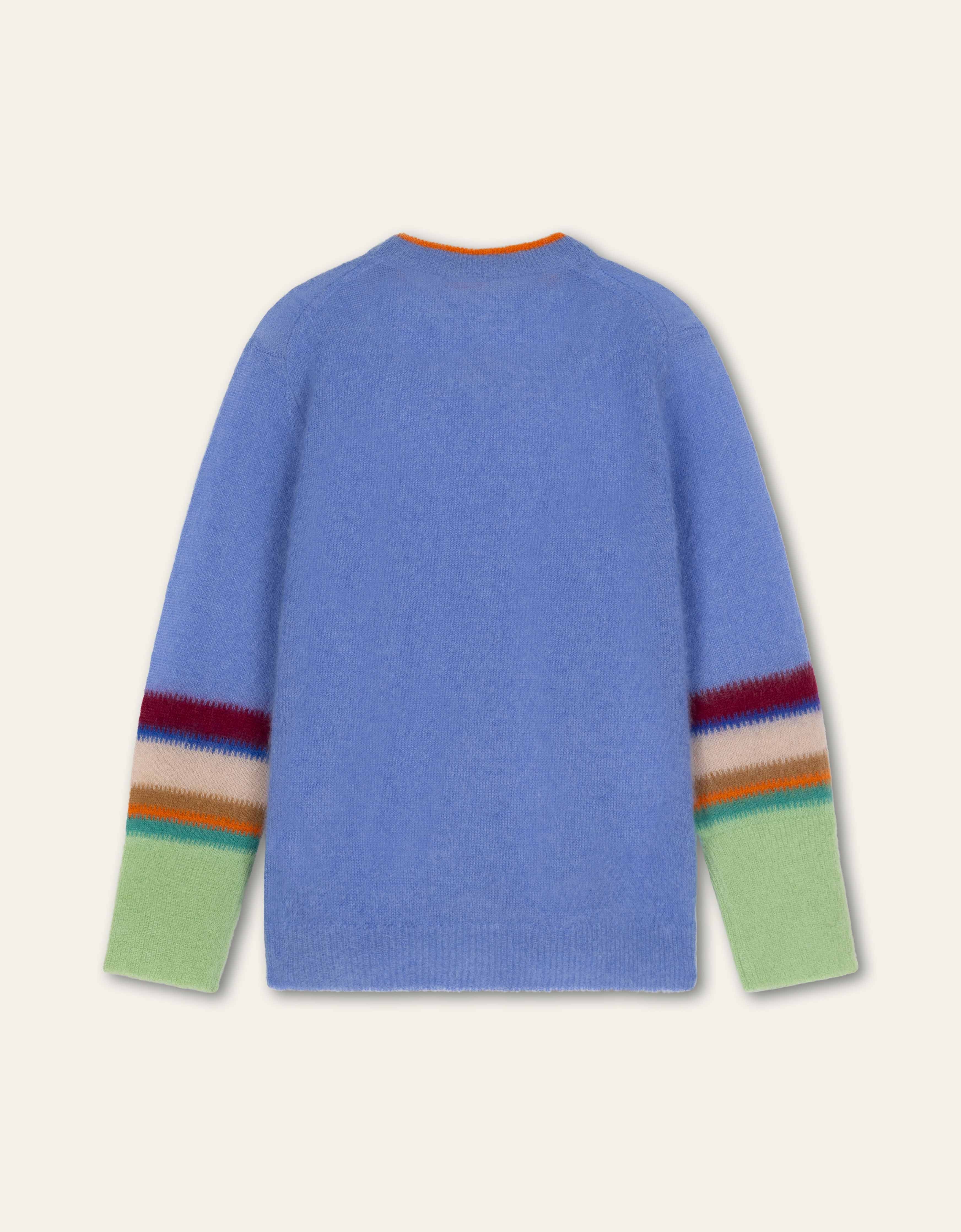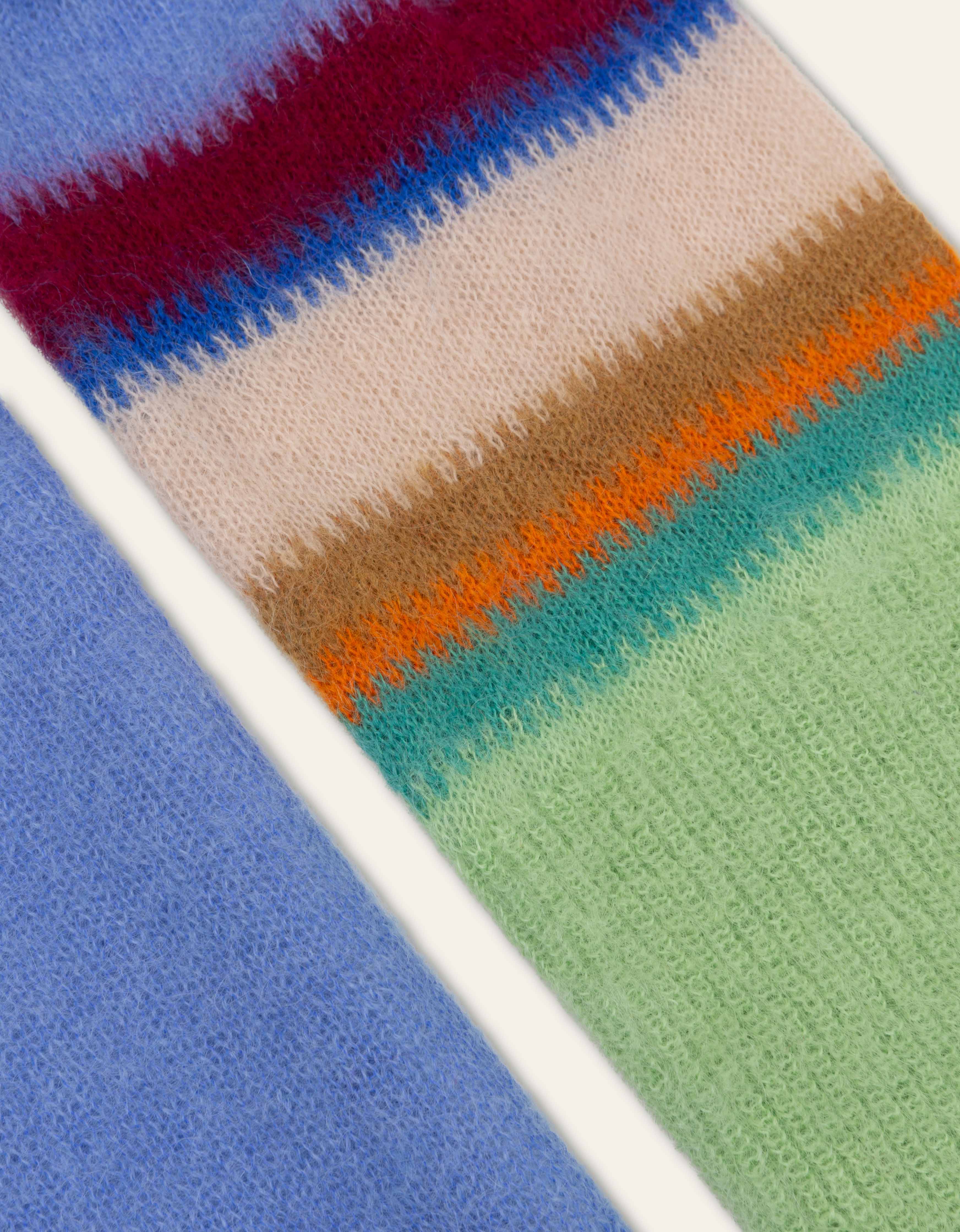 Gebrushter Mohair-Pullover mit mehrfarbigen Streifen und lockerem, luftigem Schnitt. Die Farbübergänge an den Ärmeln sind spielerisch gestaltet und erzeugen einen sanften Farbverlauf.