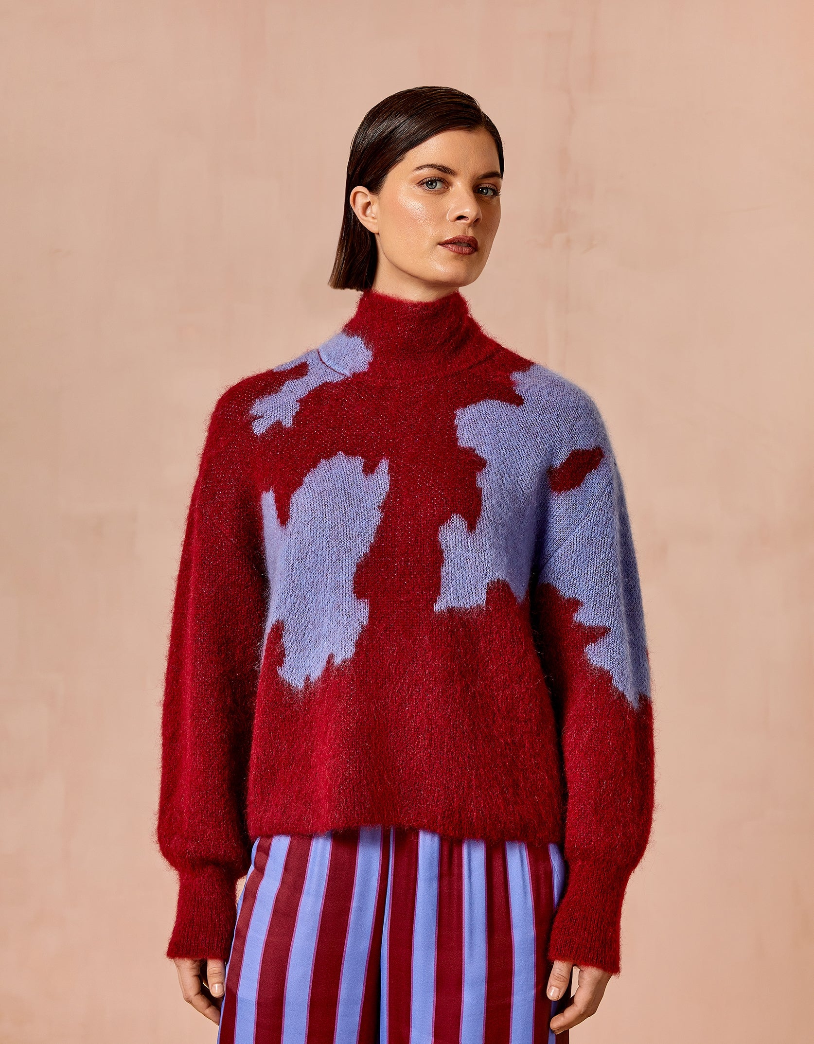Wunderschöner Mohair-Pullover mit Turtleneck im allover gebrushten Jacquarddesign. Das Muster ist von Herbstblättern inspiriert, durch die Sonnenlicht fällt. Es setzt sich stimmig über Ärmel und Schultern fort.