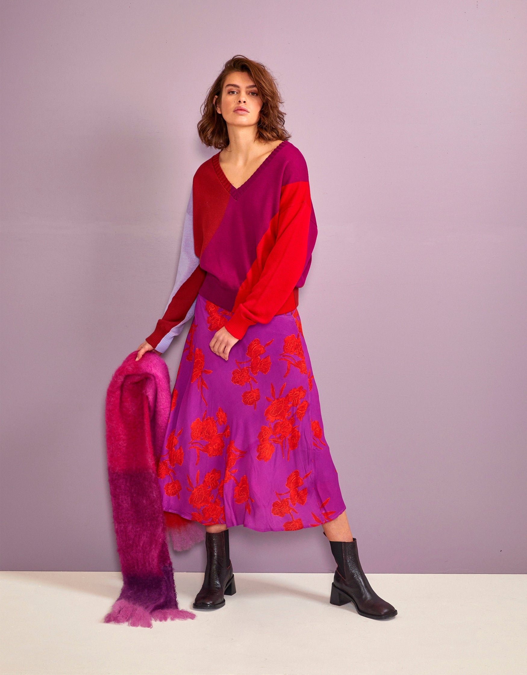 Big and bold! Herrlicher Pullover mit großen asymmetrischen, farbigen Jacquard-Streifen. Dieser Pulli in zwei Farbausführungen verbindet vier Farben am Korpus und zwei Farben in den Ärmeln. Der weite V-Ausschnitt spielt synchron mit der lockeren Passform, die an der Taille schmal zusammen läuft. Bewahren Sie das Modell möglichst liegend und nicht hängend in Ihrem Kleiderschrank auf, um seine Form zu erhalten. - 50 % Wolle and 50 % Baumwolle - Italienisches Wollgarn - V-Ausschnitt - Normale Passform