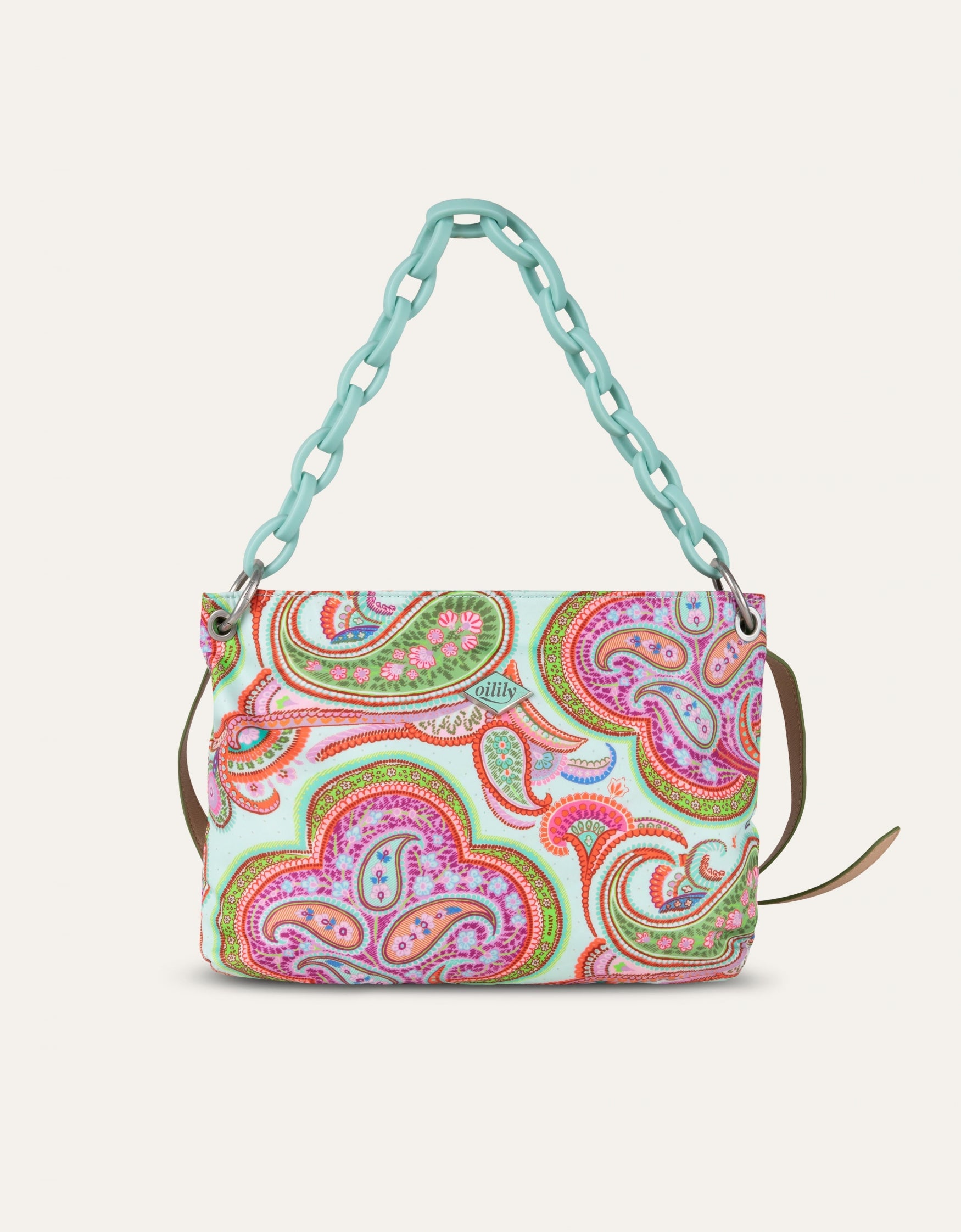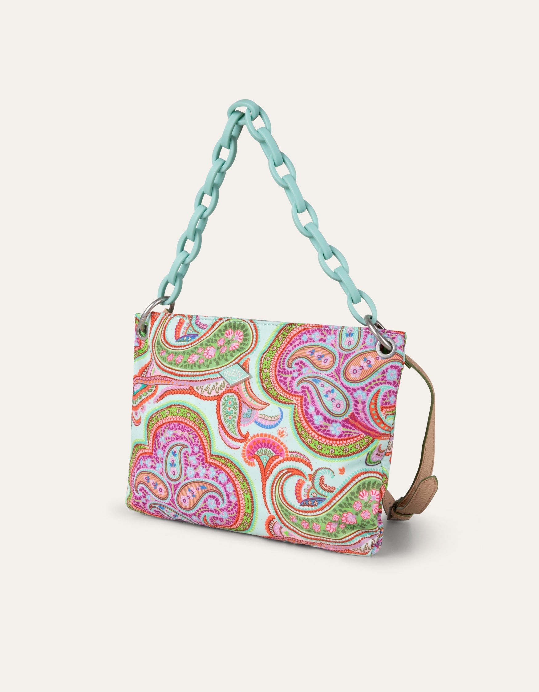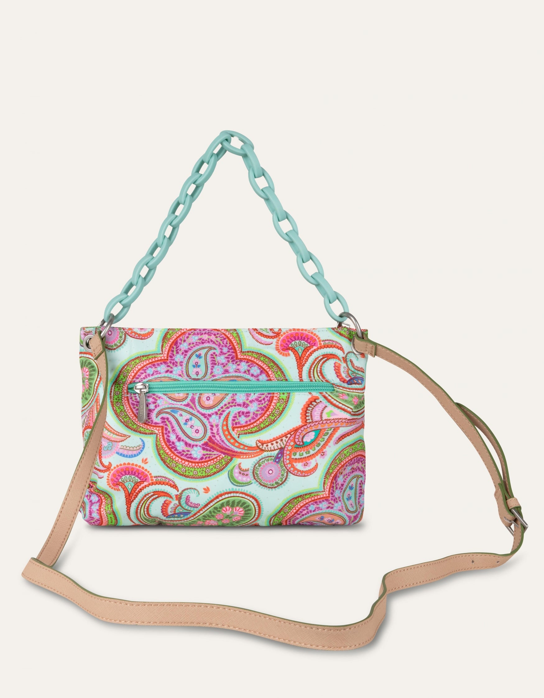 Eine flache Umhängetasche mit sommerlichem Paisley-Print, die auch als Clutch getragen werden kann! - Hauptfach mit Reißverschlussfach und Einsteckfach - Reißverschluss - Reißverschlusstasche auf der Rückseite - Verstellbarer und abnehmbarer Schultergurt (55 CM) - Abnehmbare Kunststoffkette (15 CM) - Abmessungen (BxTxH) 29 x 3 x 20,5 cm