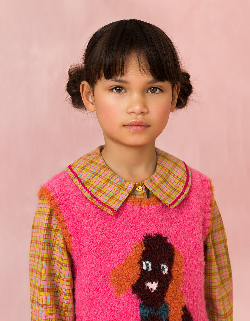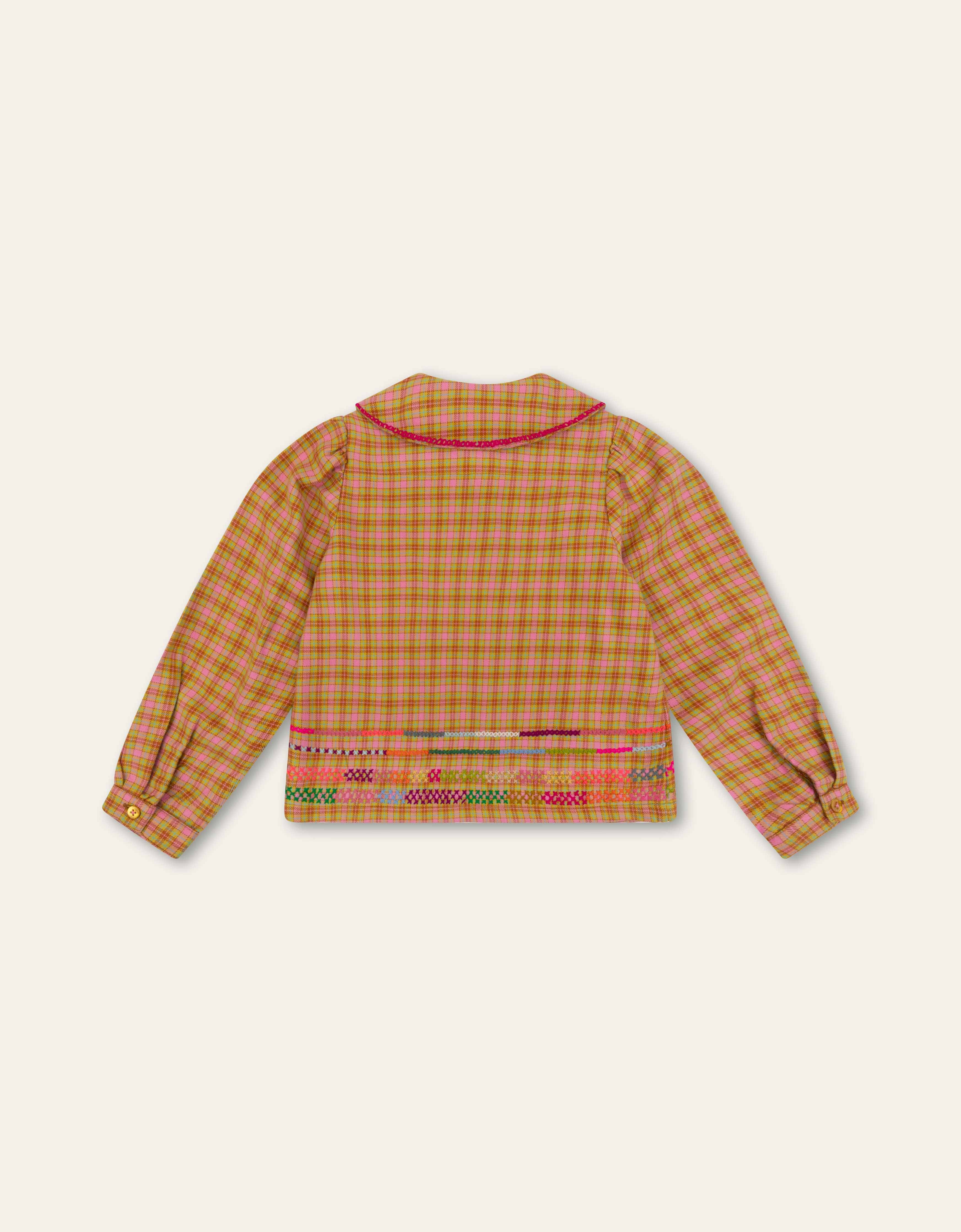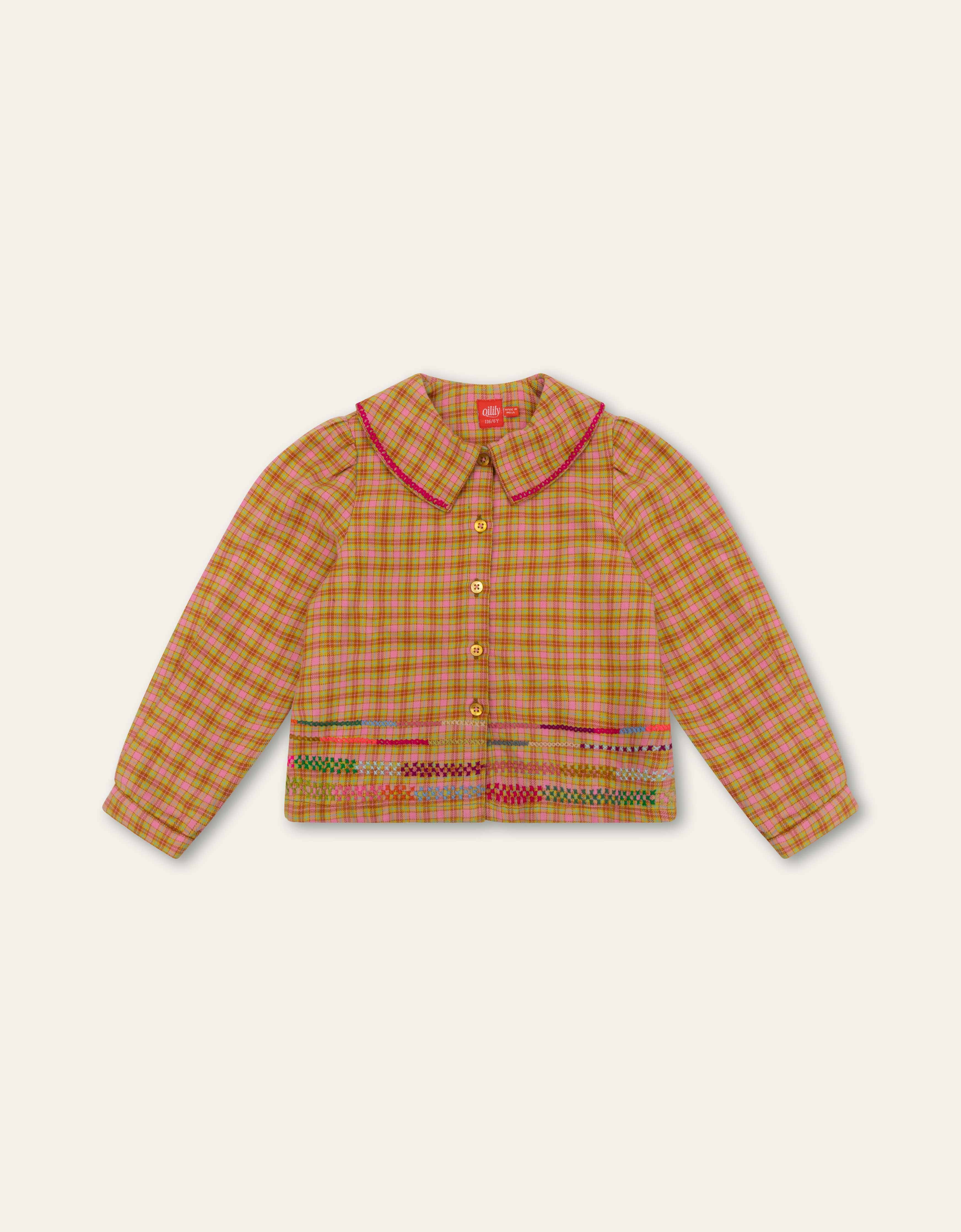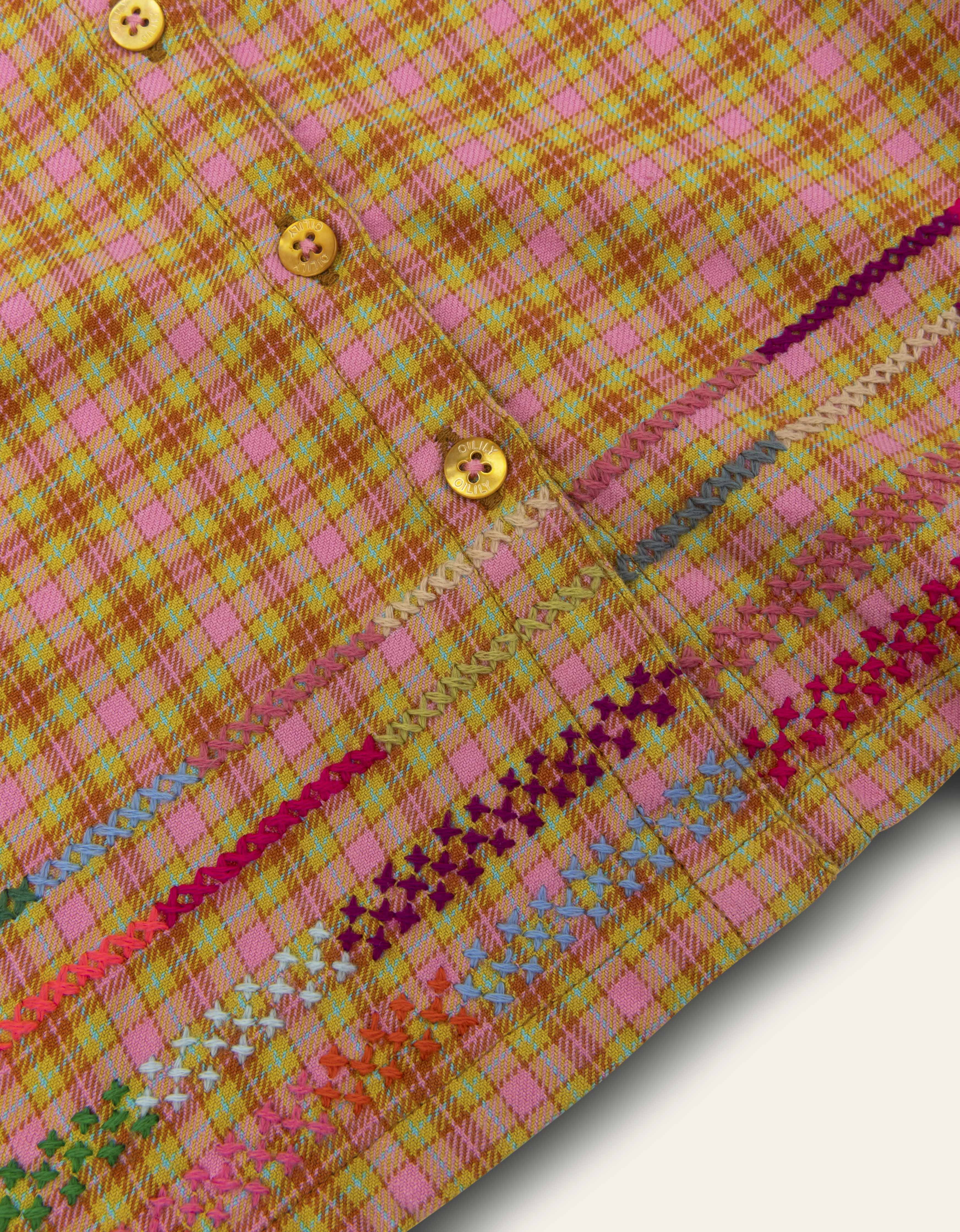 Unser Check Klaasje ist ein besonders feines Karomuster. Am Saum findest du jede Menge verspielte Stickereien, inspiriert von alter niederländischer Volkskunst.
