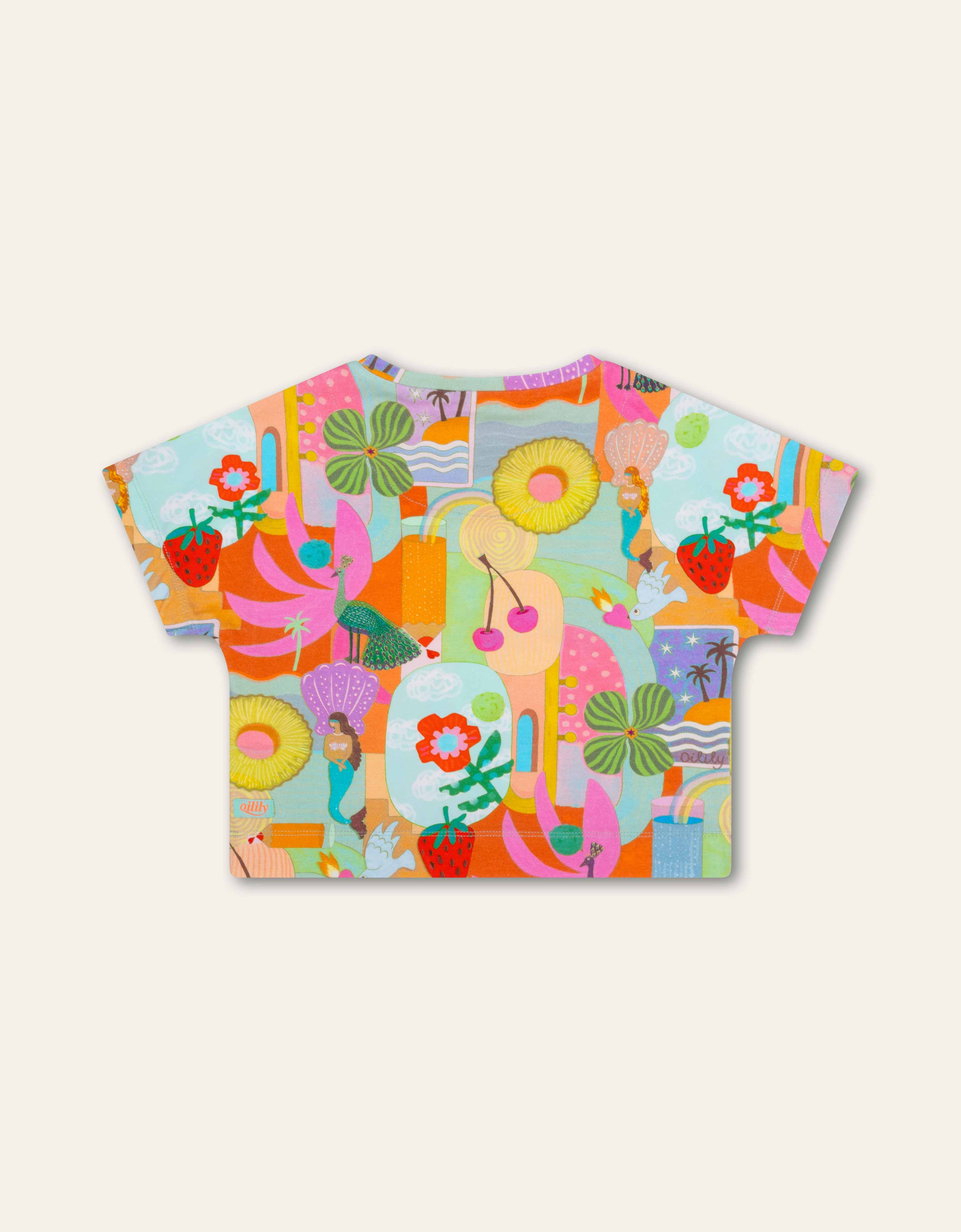 Der Fiesta Print ist ein wahres Fest aus Farben, die den Sommer feiern. Mit Zeichnungen von Früchten, Süßigkeiten und mehr gibt es auf diesem üppigen Shirt genug zu entdecken, das dich glücklich machen wird.