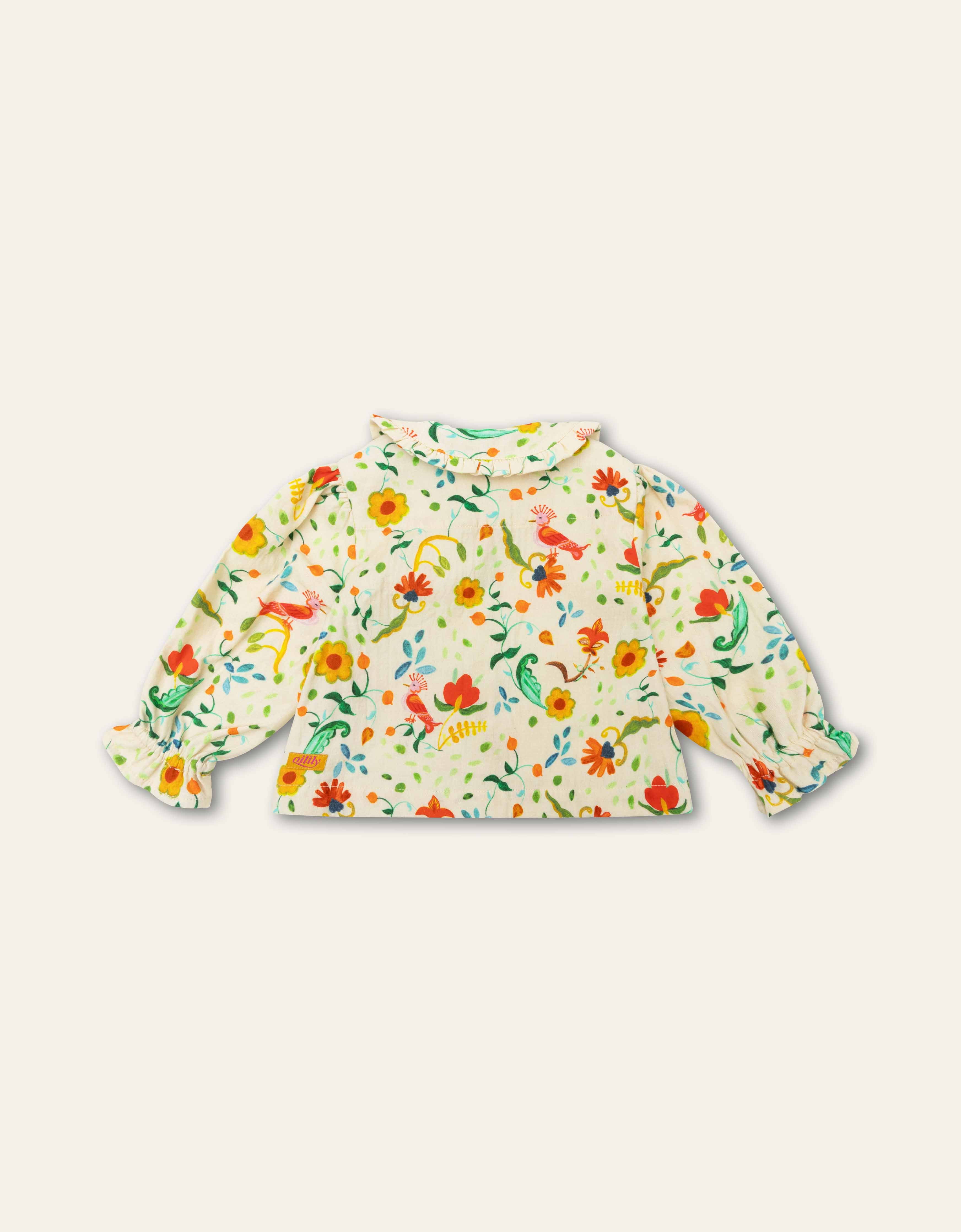 Waffelbaumwolle ist der perfekte Stoff für diese zauberhafte Bluse mit unserem Animal Garden Print voller Blumen und Paradiesvögel. Sie hat zwei Lagen, einen süßen Kragen und kleine Rüschen an den Ärmeln.