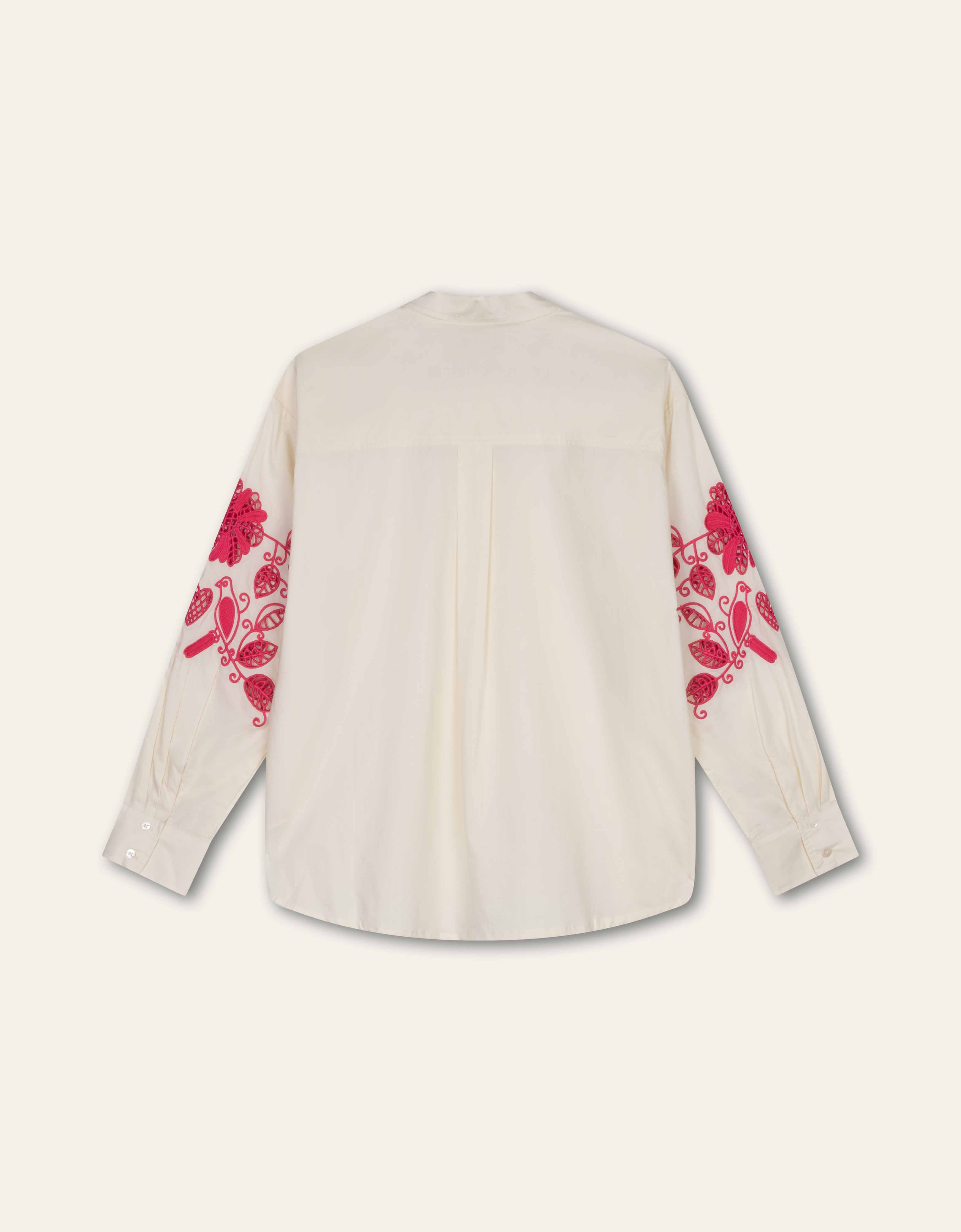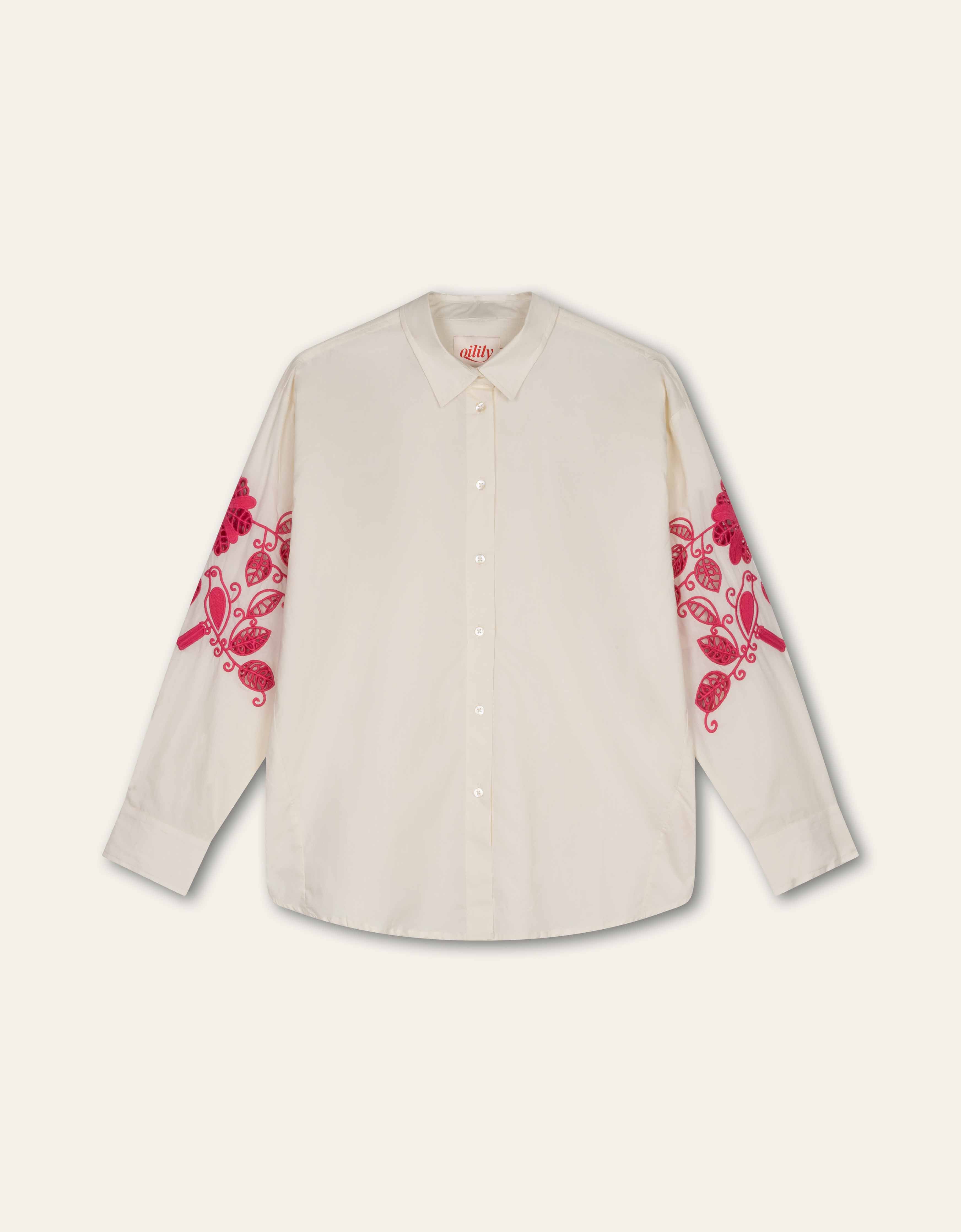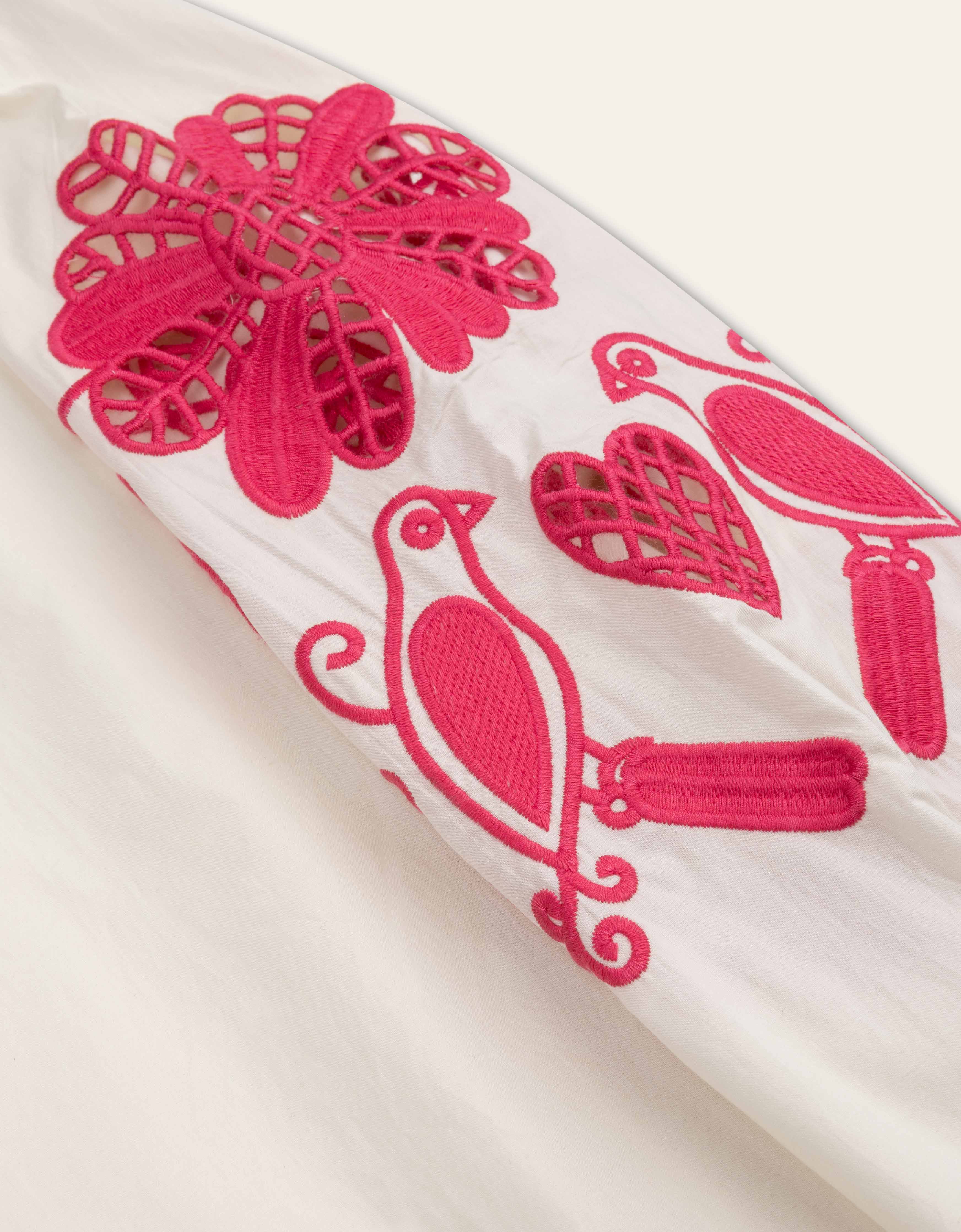 Diese lange Bluse aus Popeline-Baumwolle hat eine lockere Passform. Die durchbrochene Stickerei in Rosa auf den Ärmeln sorgt für ein dezentes, verspieltes Detail. Das gerade Modell fällt schön am Körper entlang; wählen Sie eine Nummer größer für einen lässigen Look.