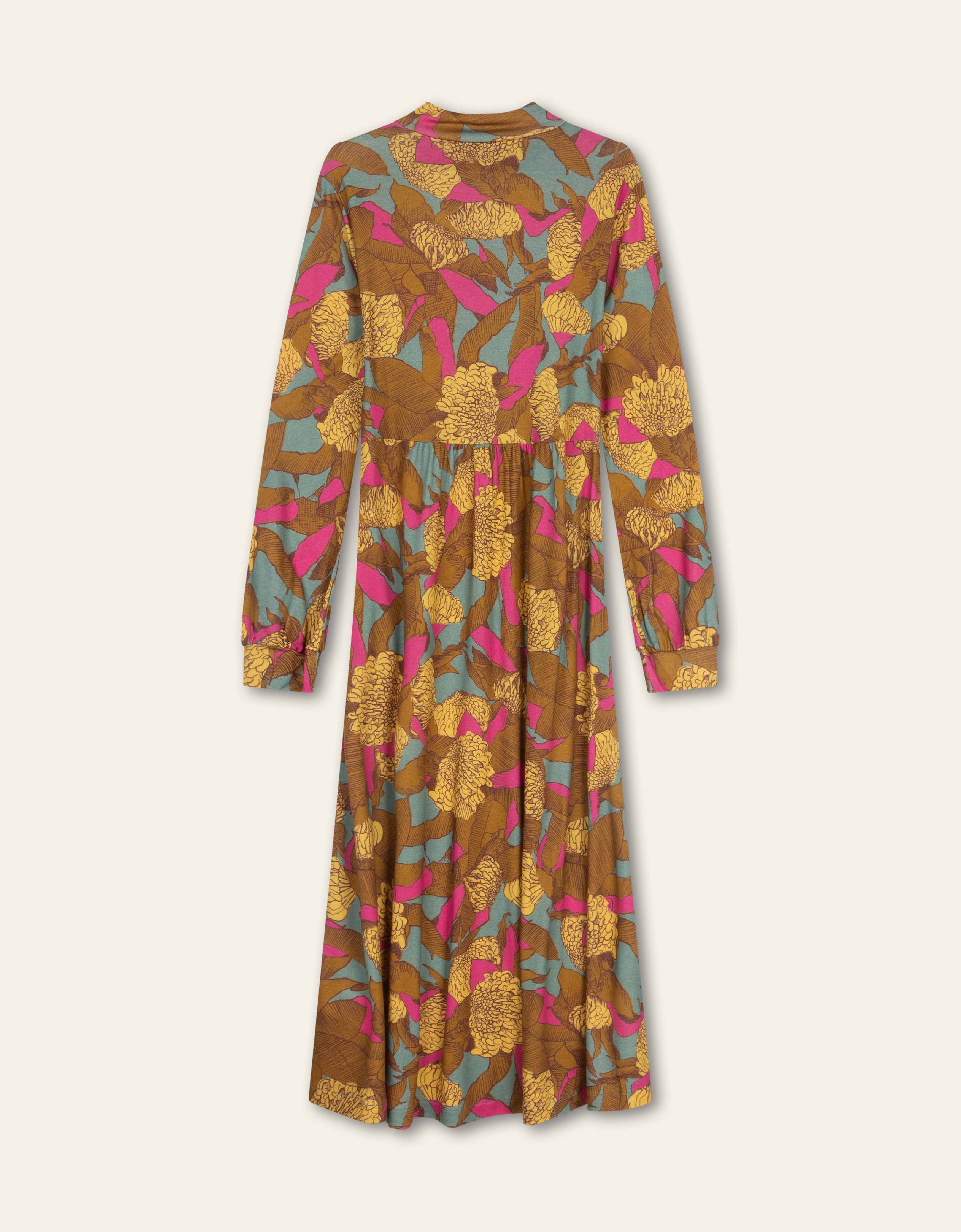 Für unseren Coraline Print fertigten eine von Chrysanthemen und Blättern inspirierte digitale Zeichnung an. Das Ergebnis ist ein Blumen Print, der dieses knöchellange Kleid ziert. Das Modell mit schmalem Stehkragen wurde aus Lyocell gefertigt und ist an der Innenseite aus gebürsteter Wolle gearbeitet. Warm, fröhlich und sehr feminin.