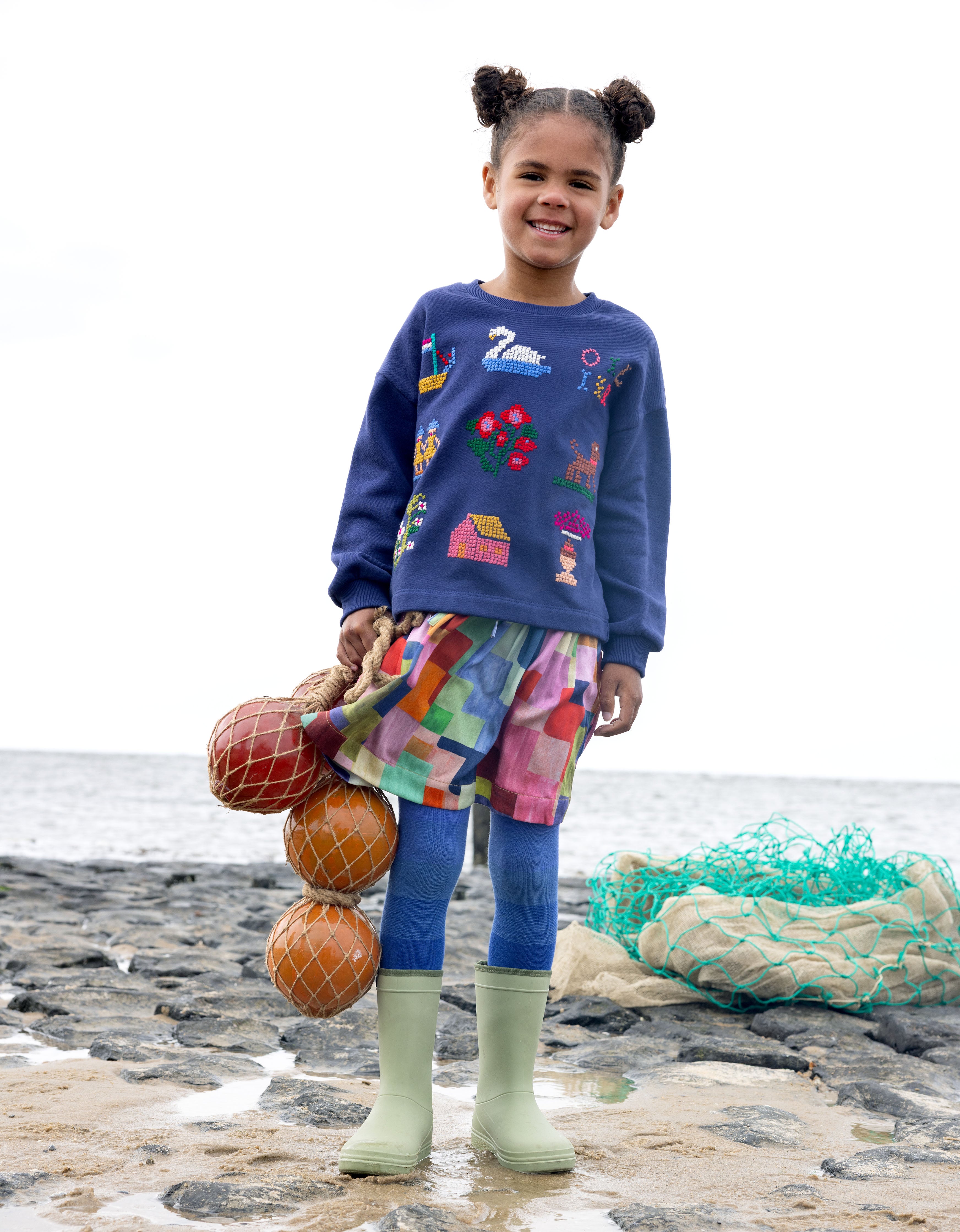 Dieser verspielte Rock besteht aus zwei Faltenlagen und einem passenden Kordelzug. Der Echo Island Print ist inspiriert von Farben und Formen der niederländischen Polderlandschaft.
