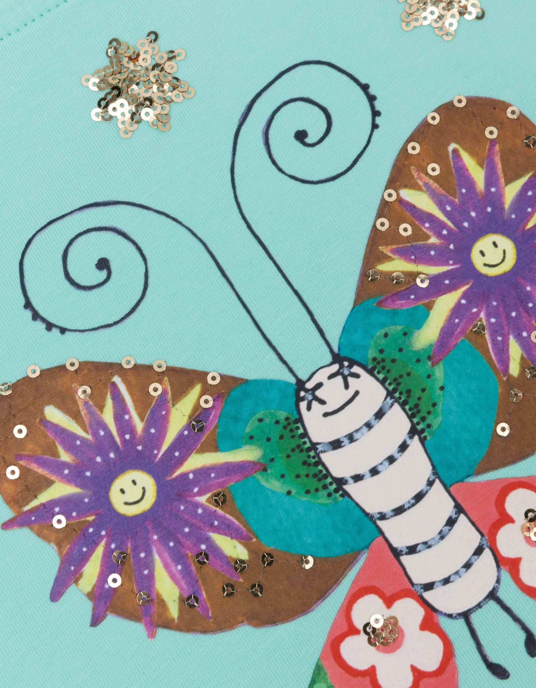 Dieser sonnige Schmetterling steckt dich mit seiner guten Laune sofort an. Er hat es sich auf diesem locker sitzenden Shirt bequem gemacht und hat glänzende Augen, kleine Sonnen auf seinen Flügeln und ist mit glitzernden Perlen verziert. Zieh das Shirt an und strahle mit dem Falter um die Wette!