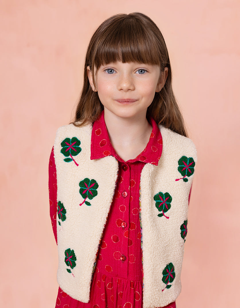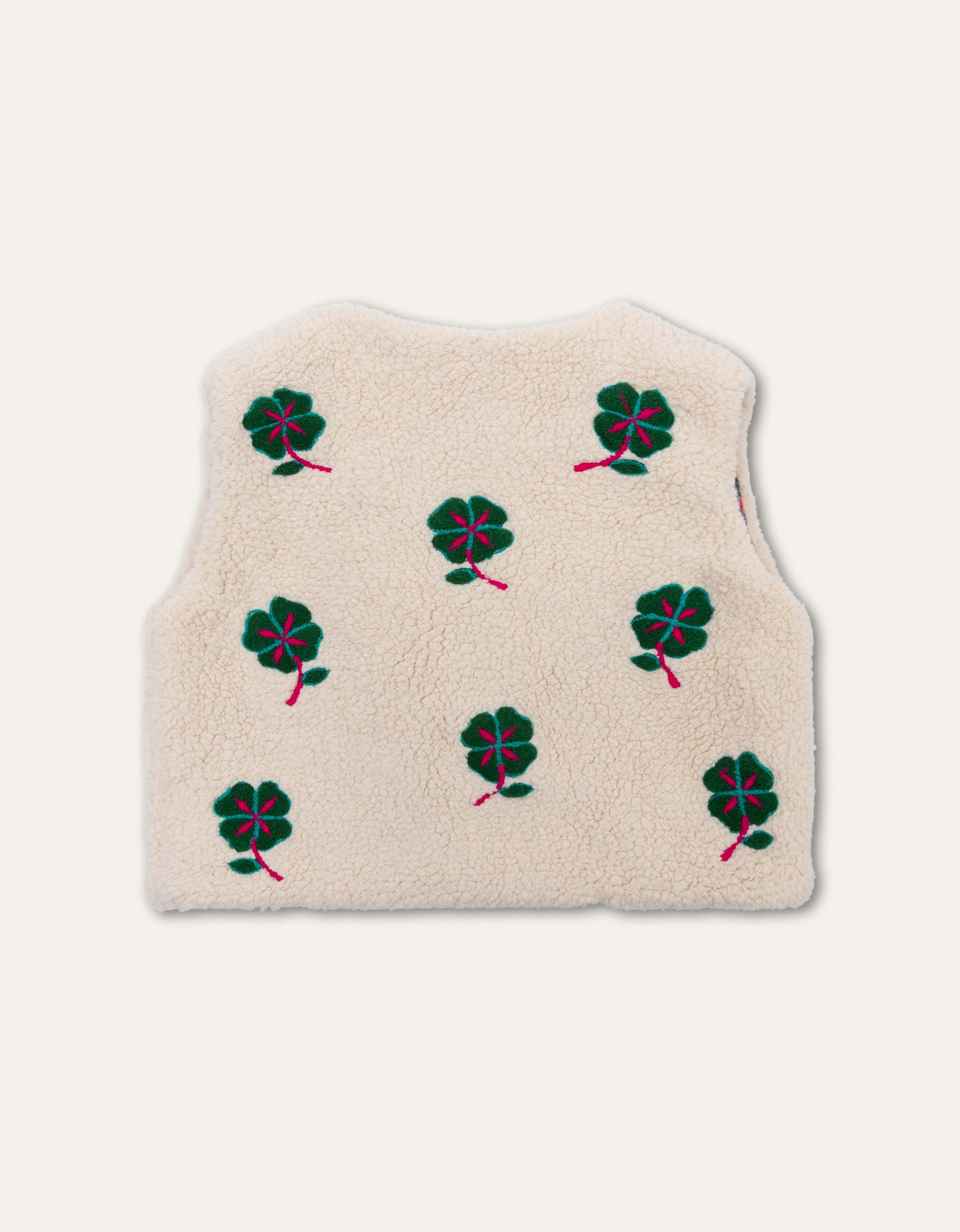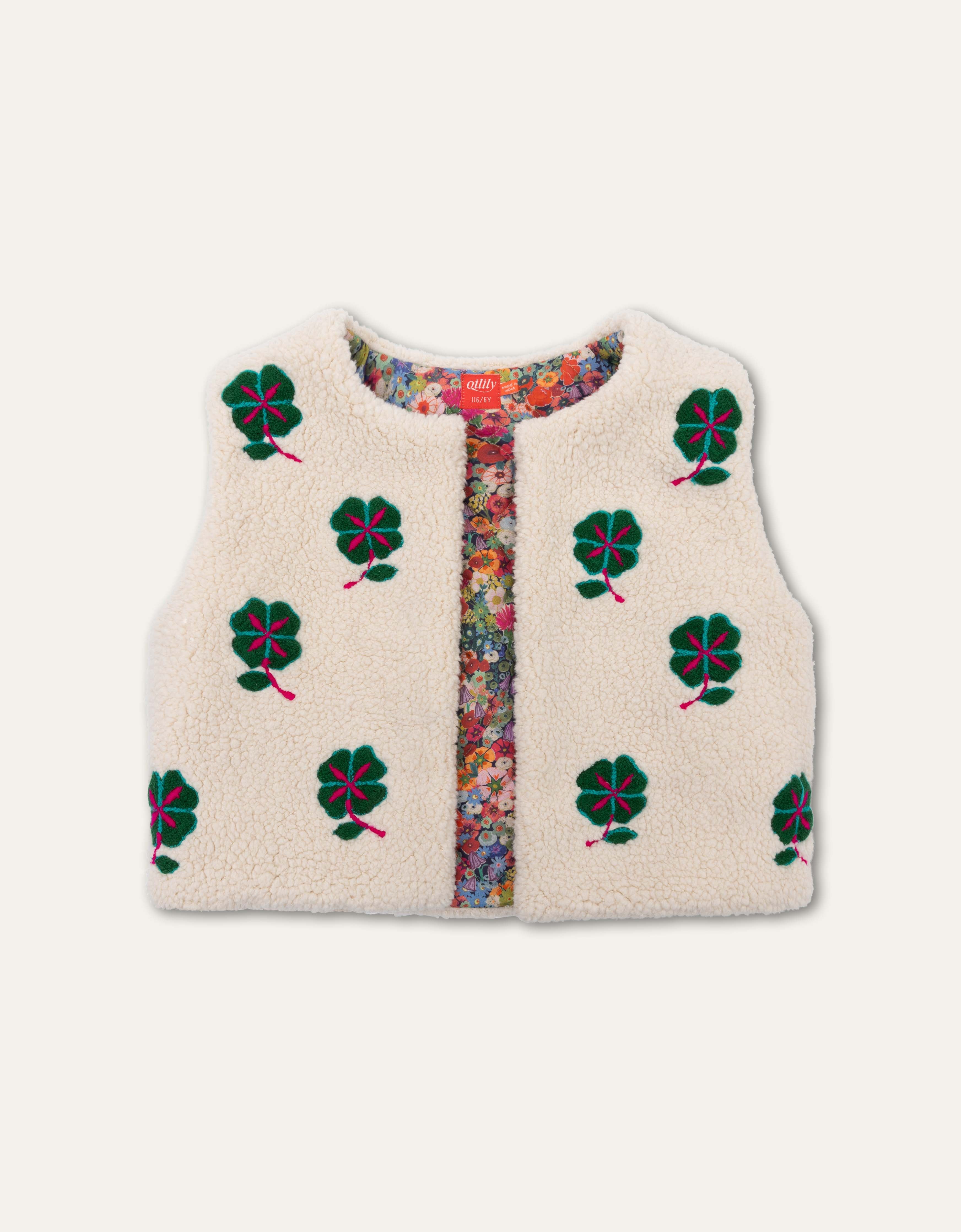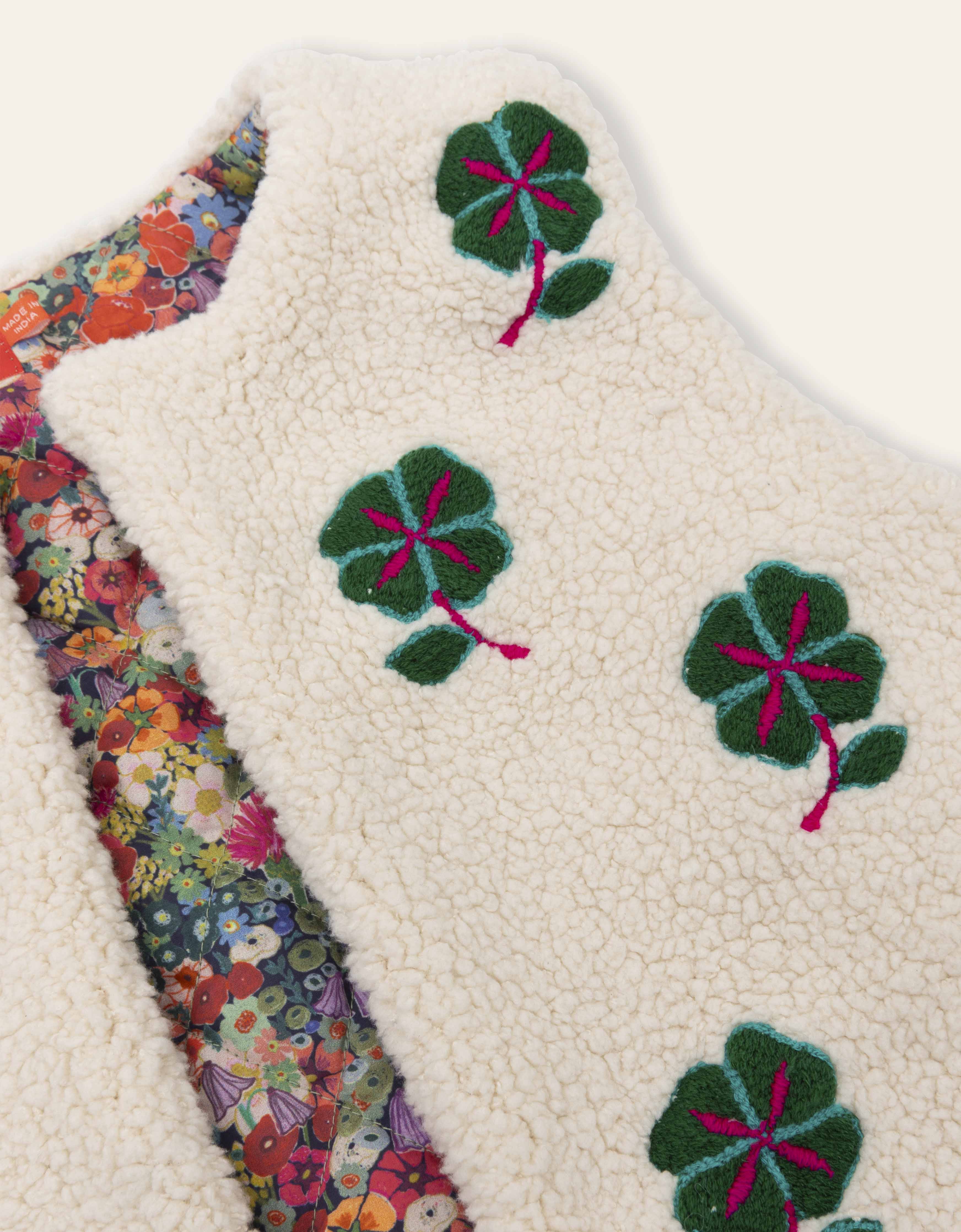 Soft teddy bodywarmer filled with lucky charms: the four leaf clovers. The inside is lined with the print Scottish Garden, a digitally drawn floral in happy colours.