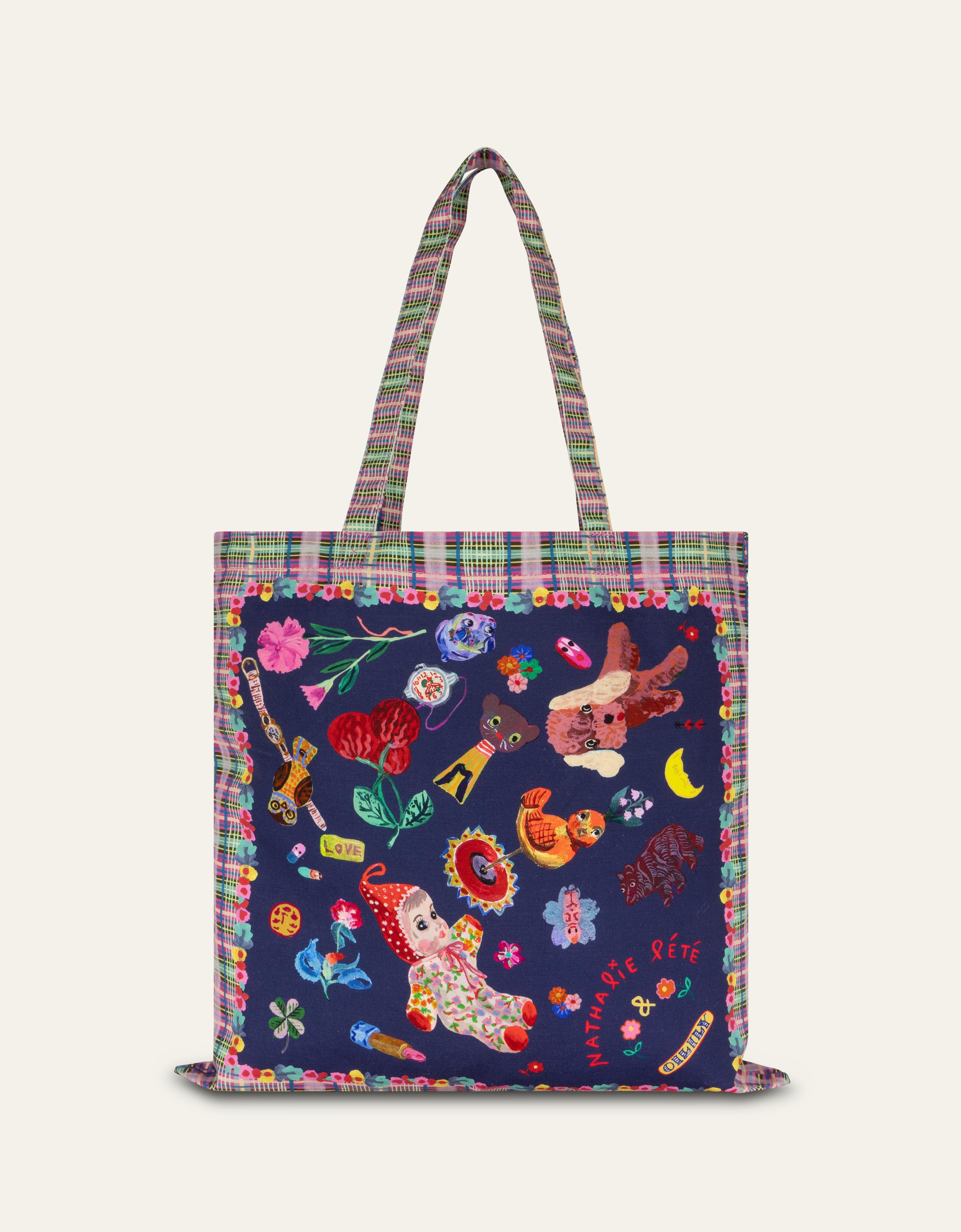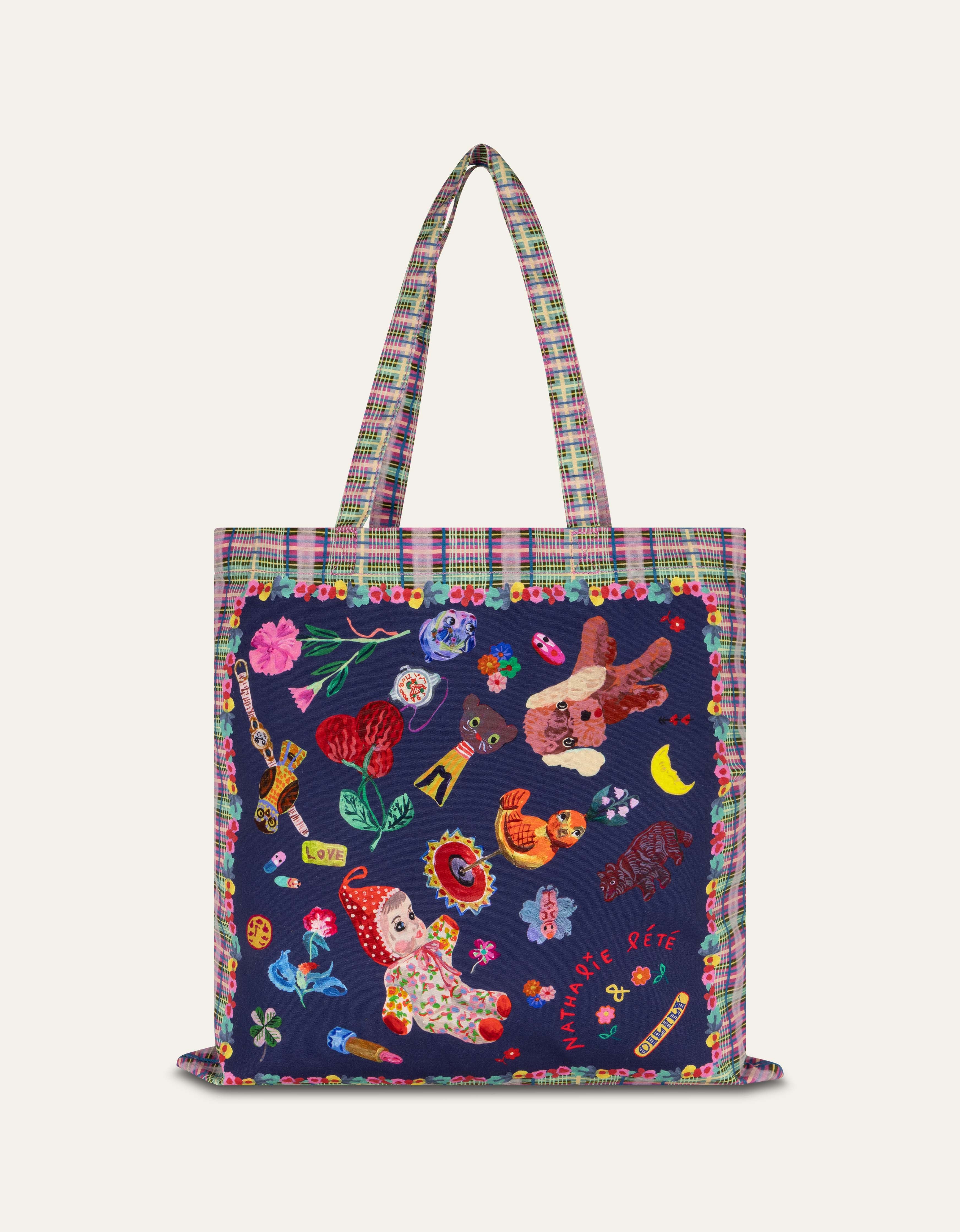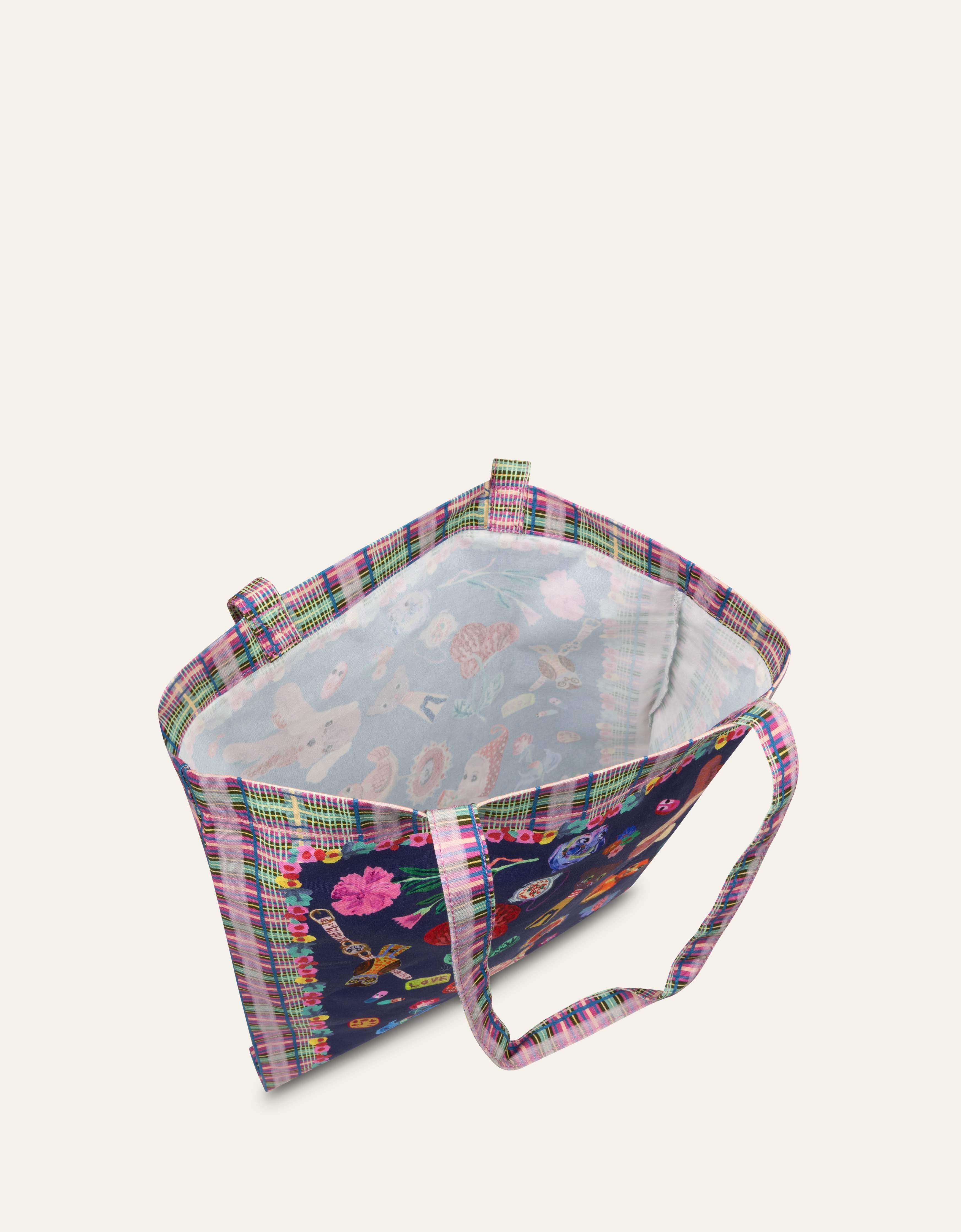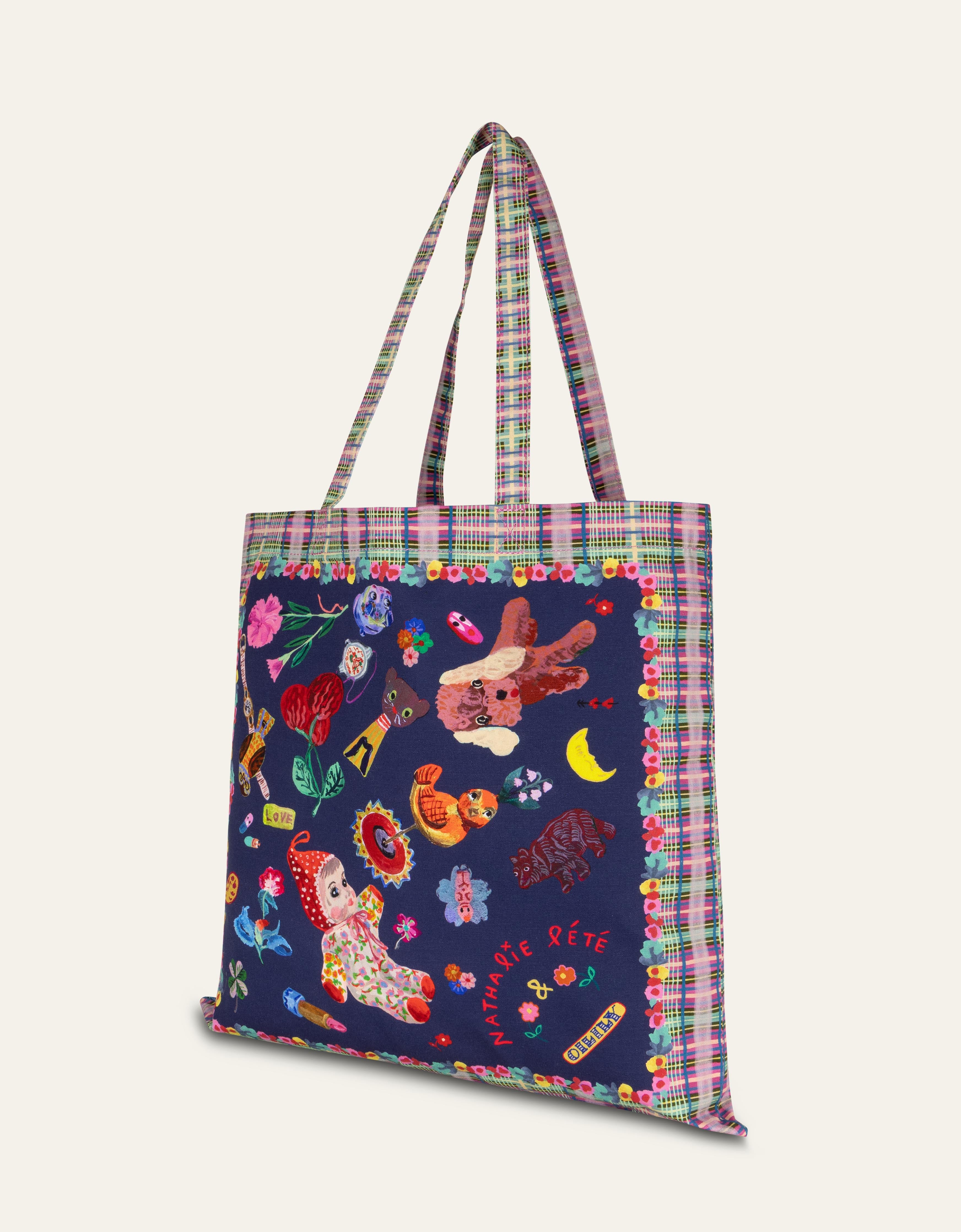 A cotton shopper with the Surprise Balls print. Artist Nathalie Lété designed this print exclusively for Oilily: a unique print of colorful balls filled with small toys and treasures.