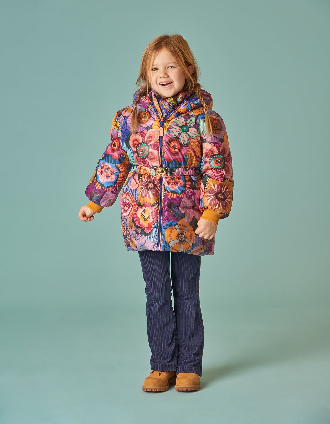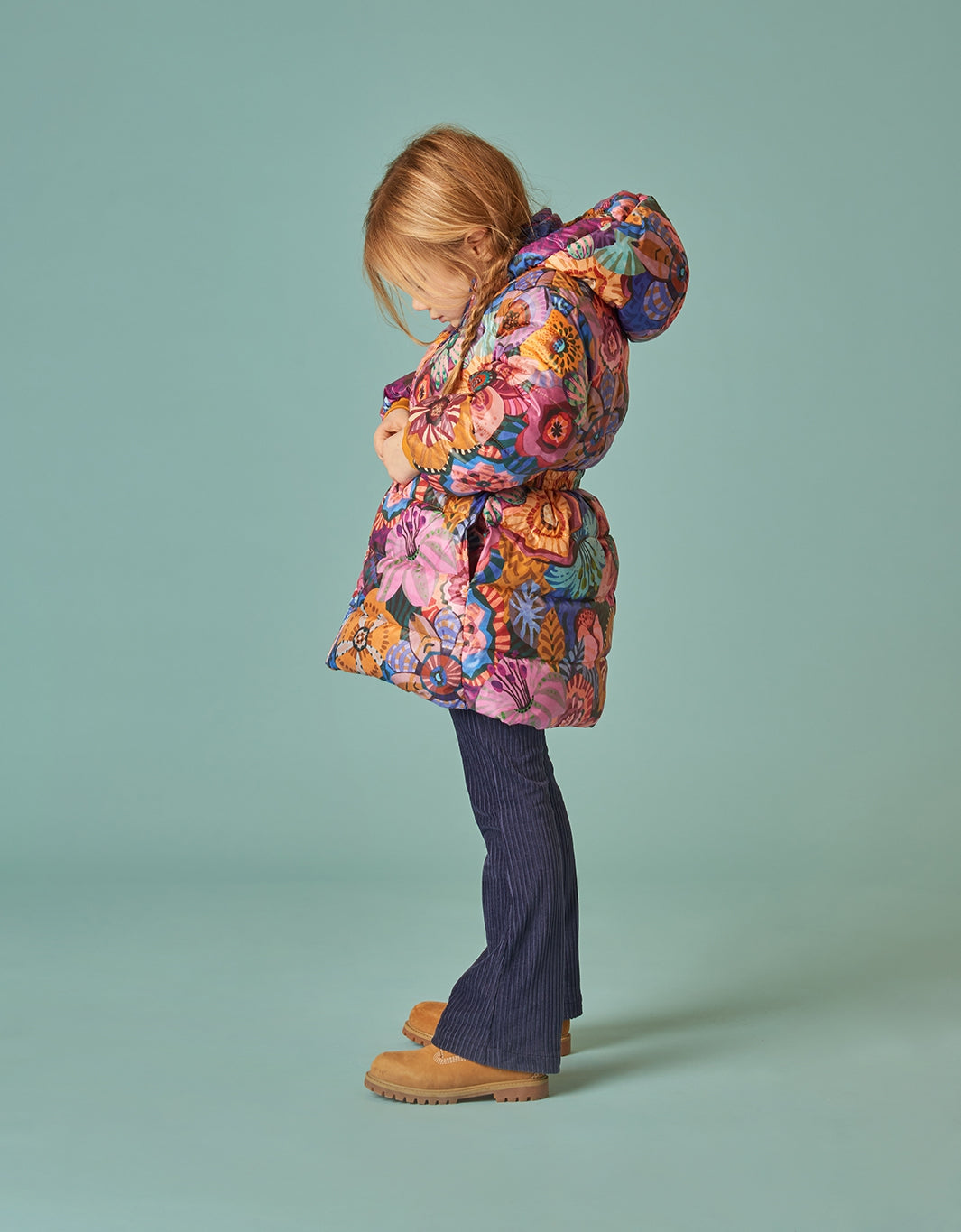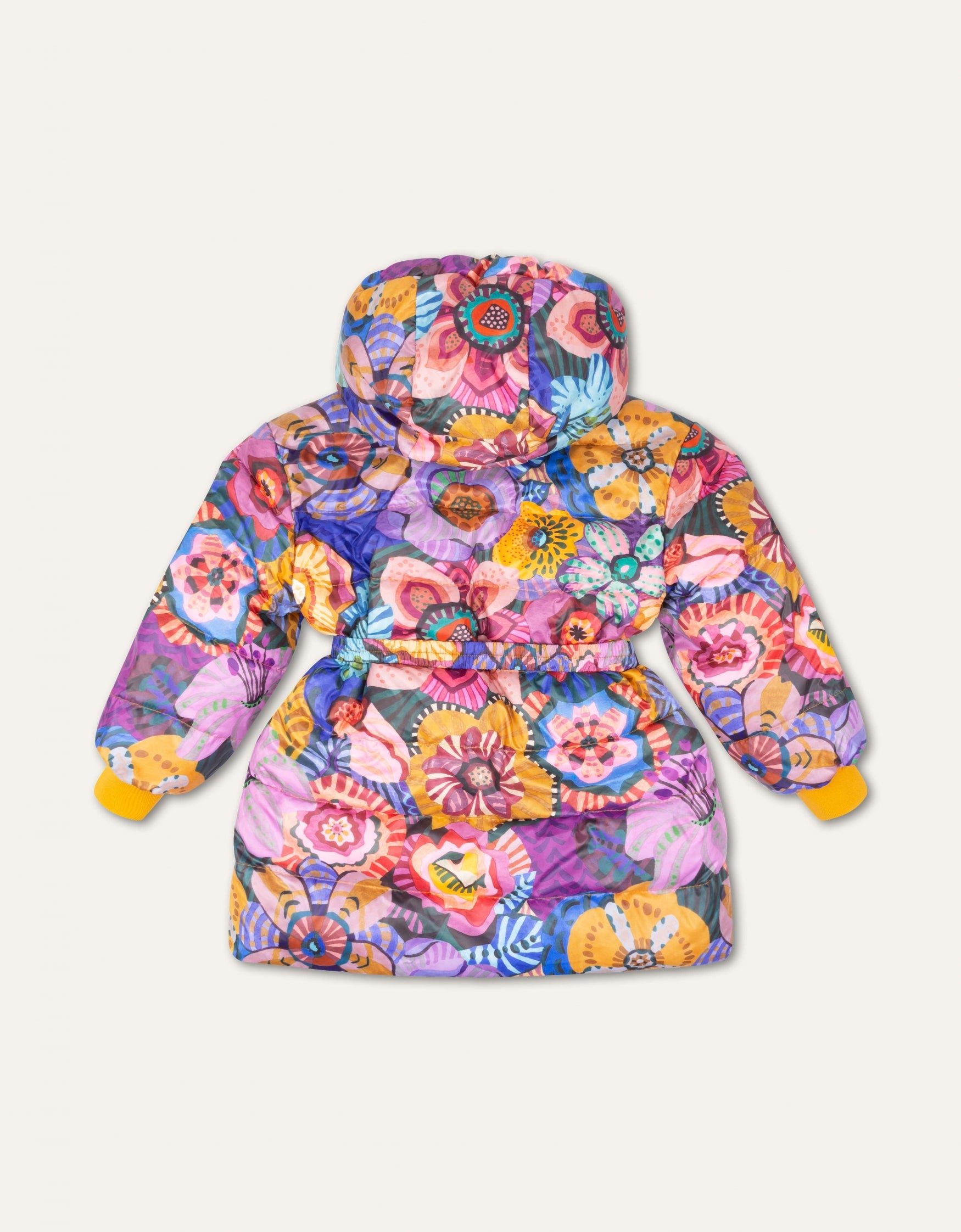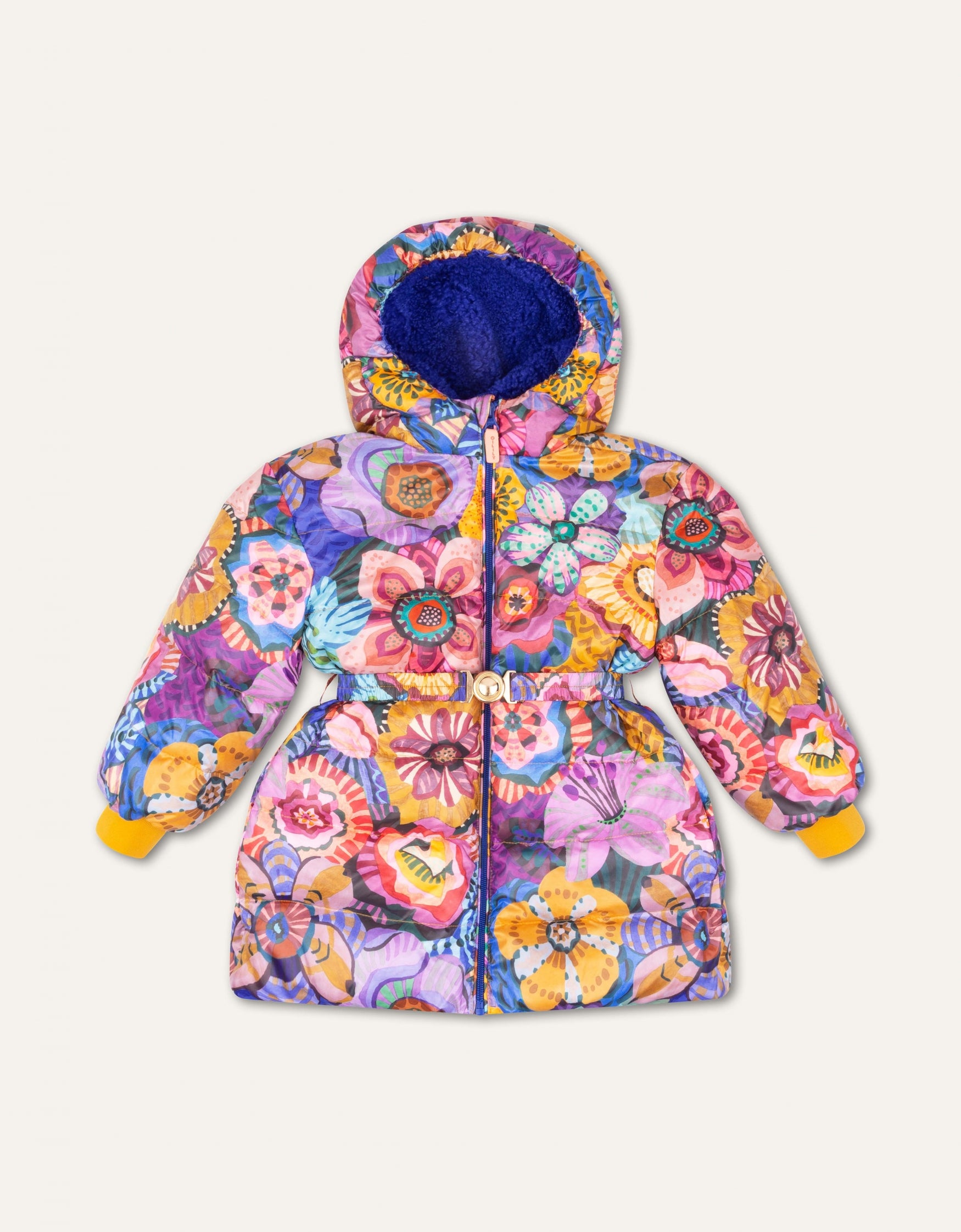 How pretty! The Winter Flowers are all hand-painted and look gorgeous on this winter coat. The coat is lined with curled fake fur so very soft on the inside. While the coat has a straight fit, you can also change the shape with the matching belt.