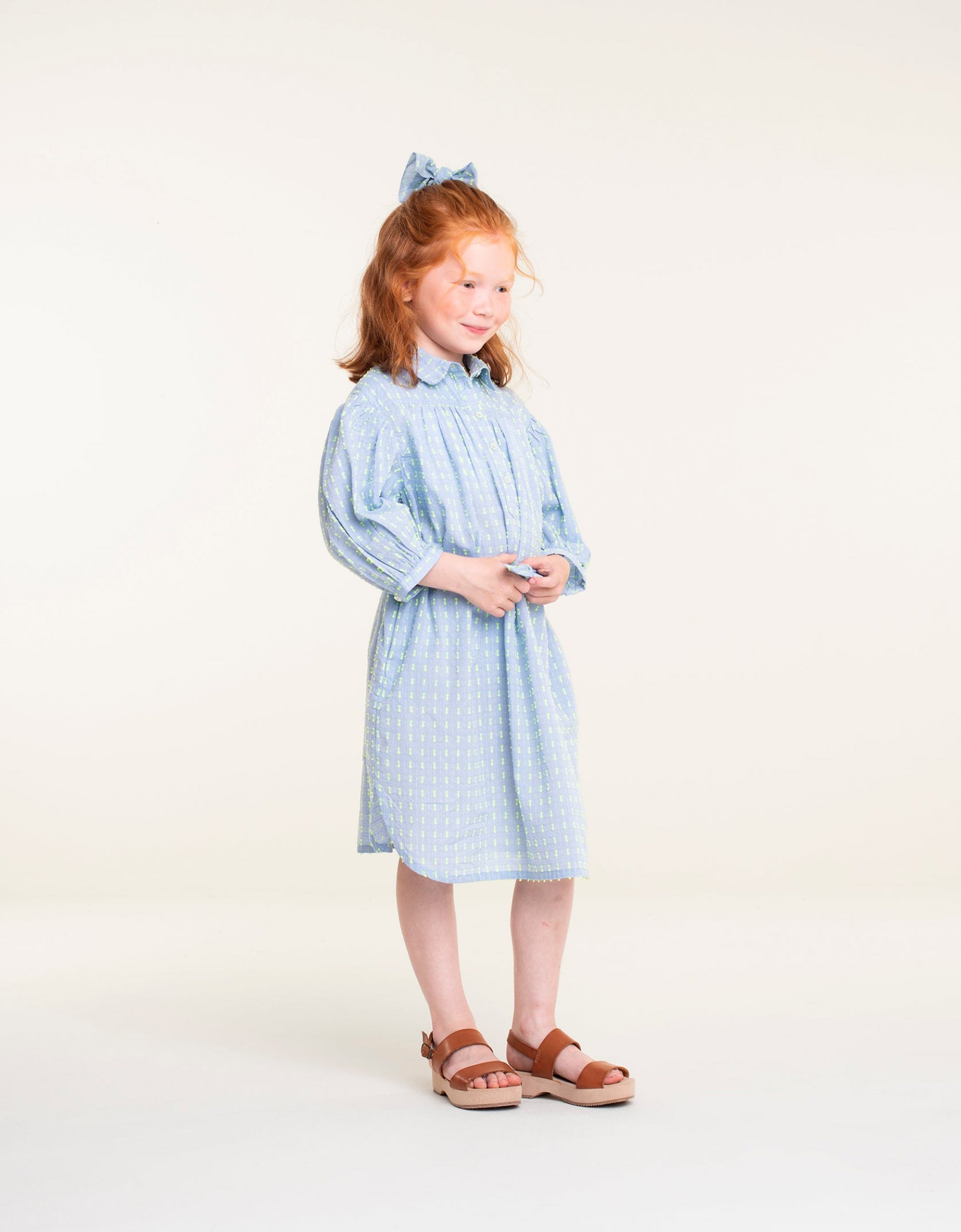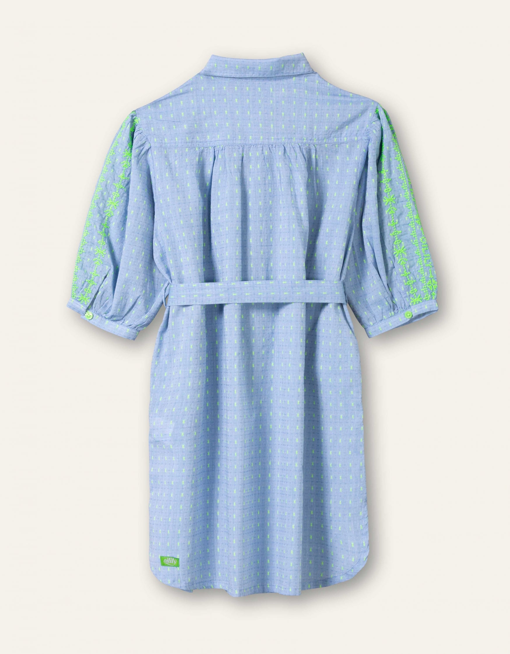 Midi-dress made from 100% cotton in a playful combo of ice-blue with neon green. On the sleeves detailed stitchings in amazing green that go nicely with the button and the dots. With a button close and a matching belt in the waist. - Extra relaxed fit - Midi-dress - 100% cotton