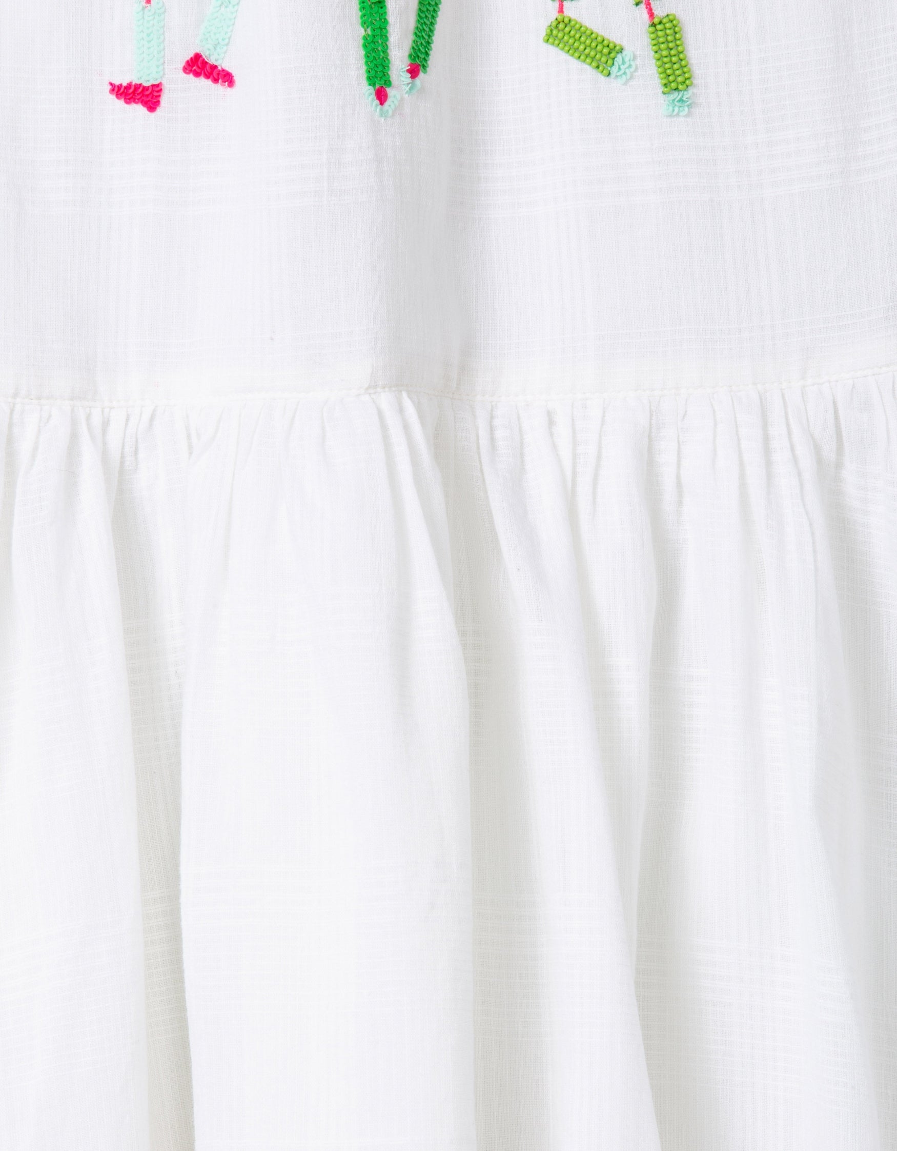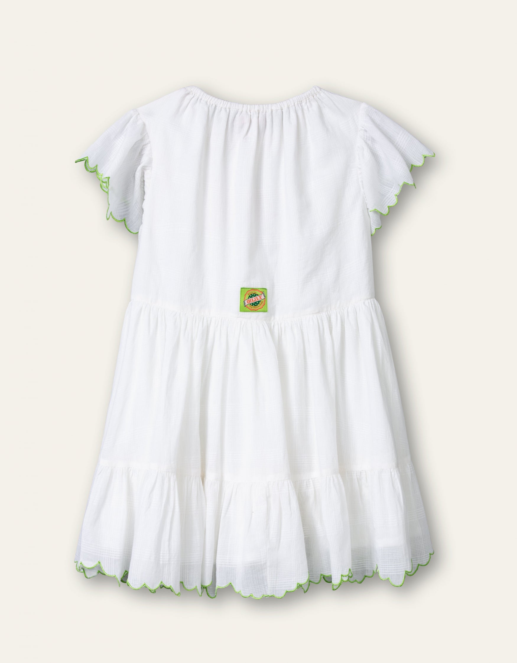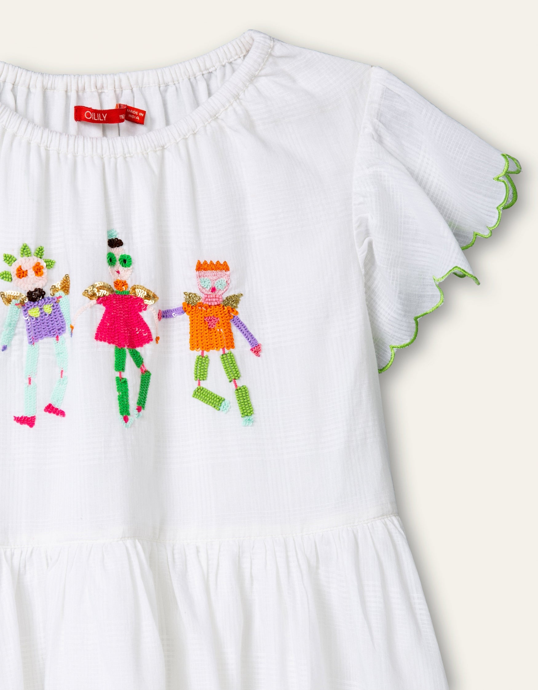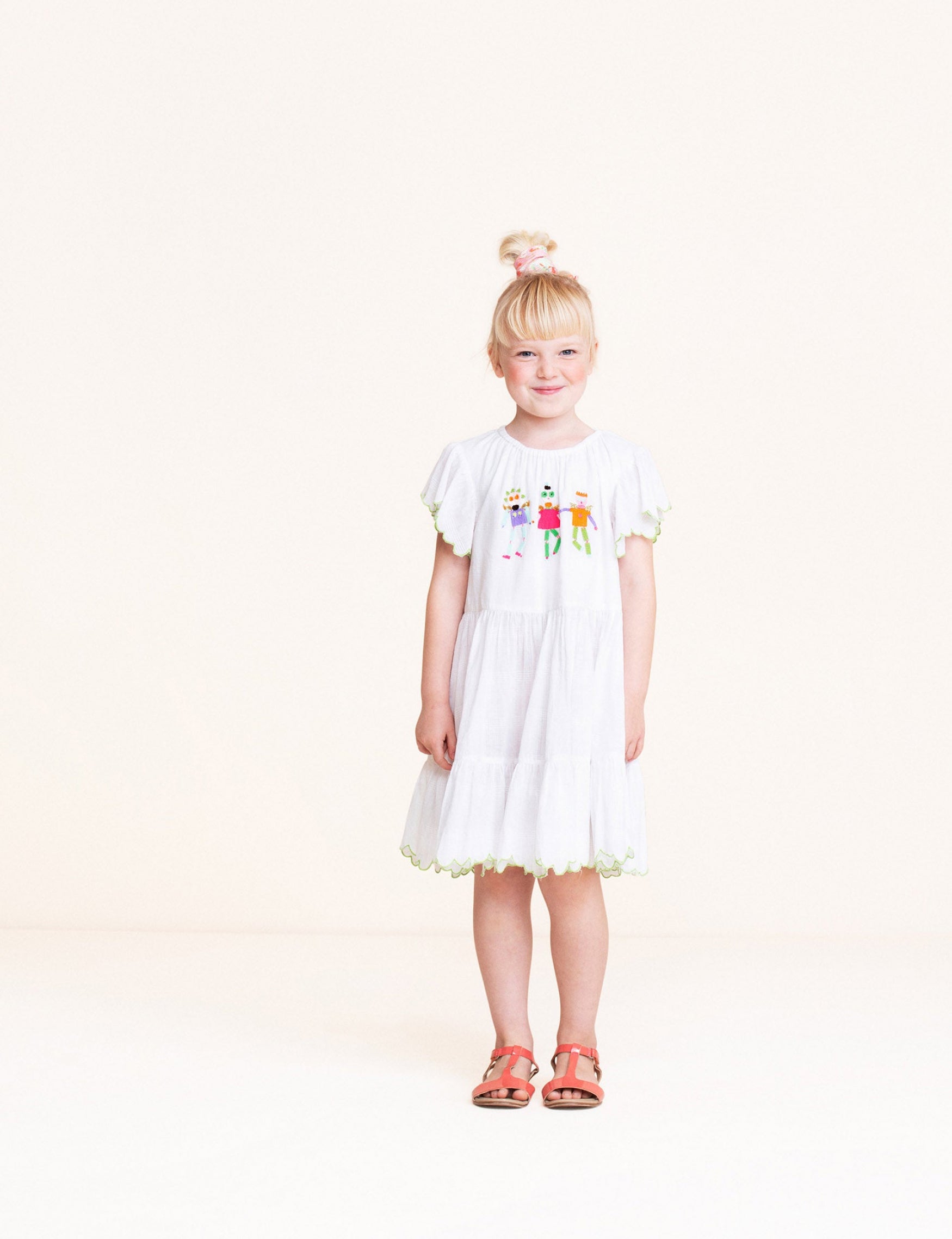 Always imagined yourself on a cloud? Dreaming away, having cotton candy all day long and just picking flowers for your hair? This lovely dress is perfect for daydreaming. Super soft cotton, delicate layers, lovely rounded hems and with hand-embroidered robo-angels to come along for the ride.