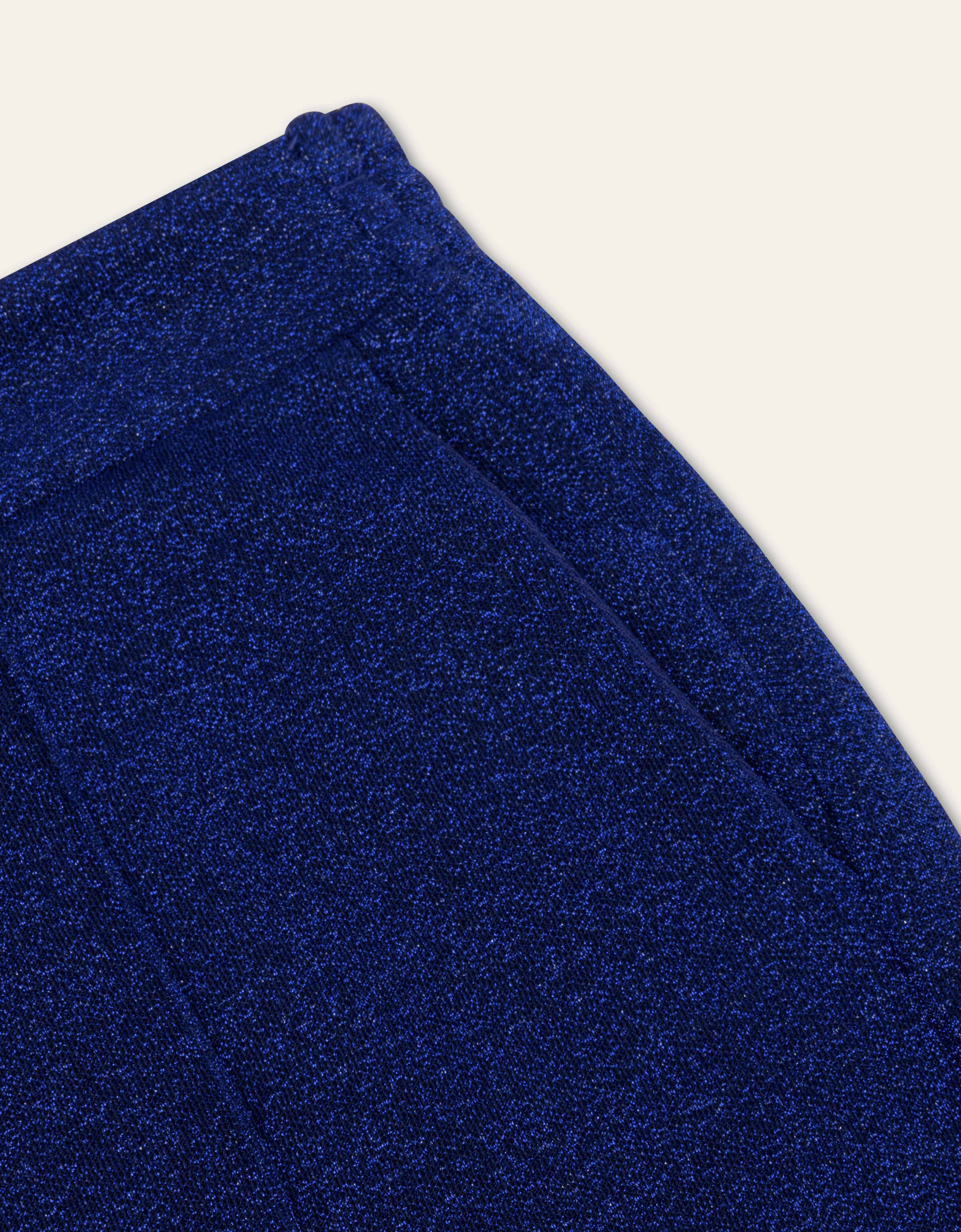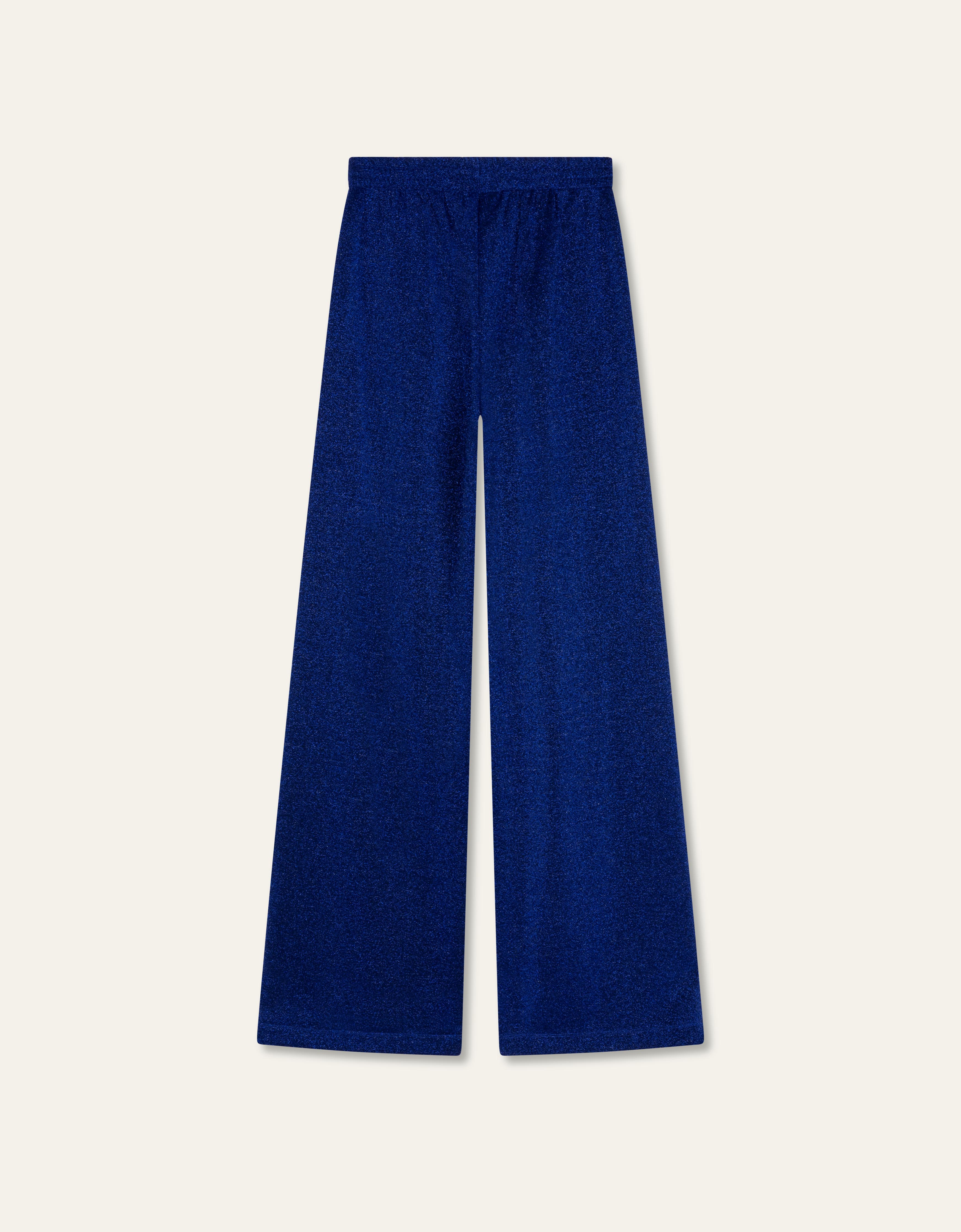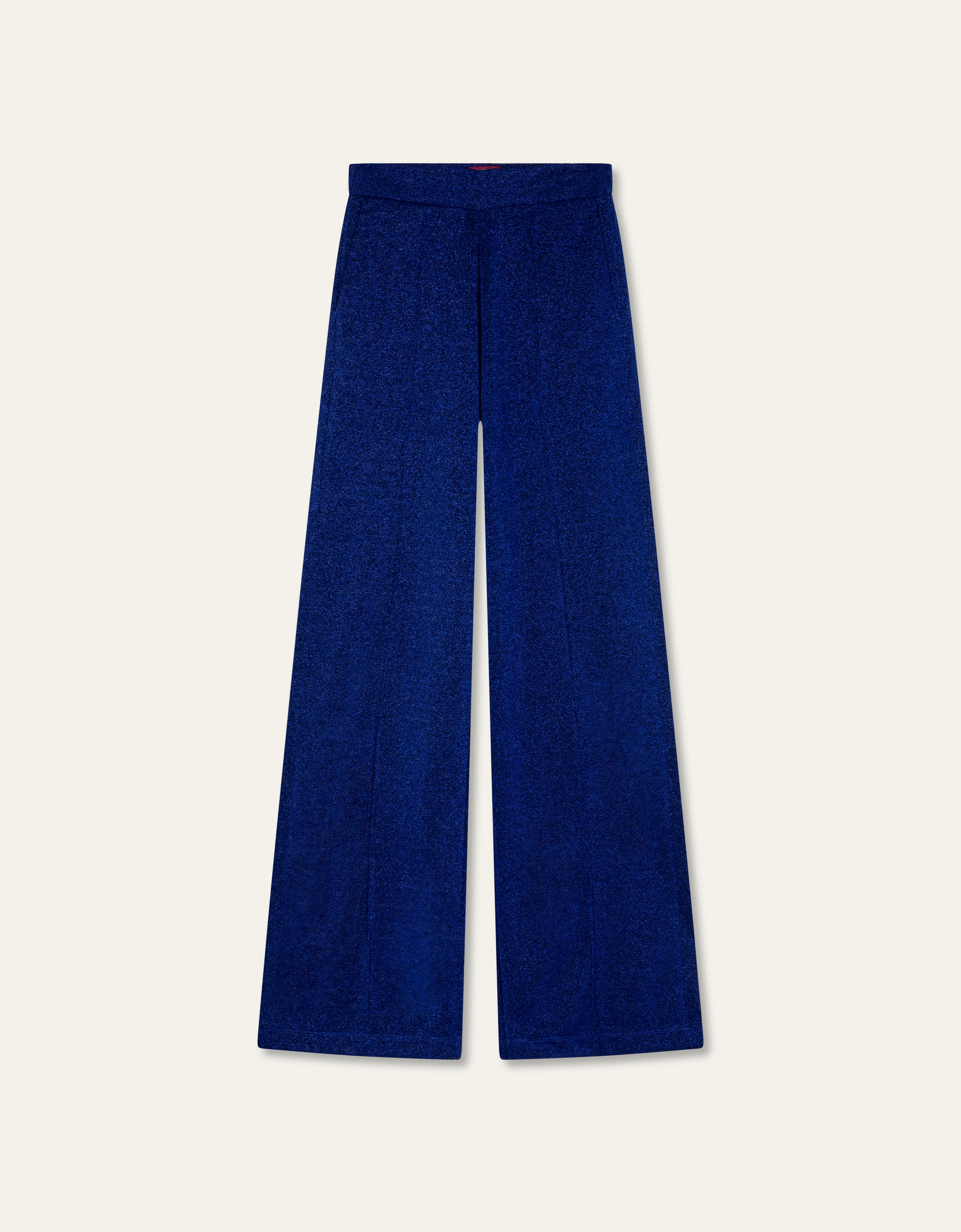 Combine these glitter lurex trousers as much as you like, they go with everything. The fold goes over the front and the trousers have a straight, wide fit with a stretchy waist.