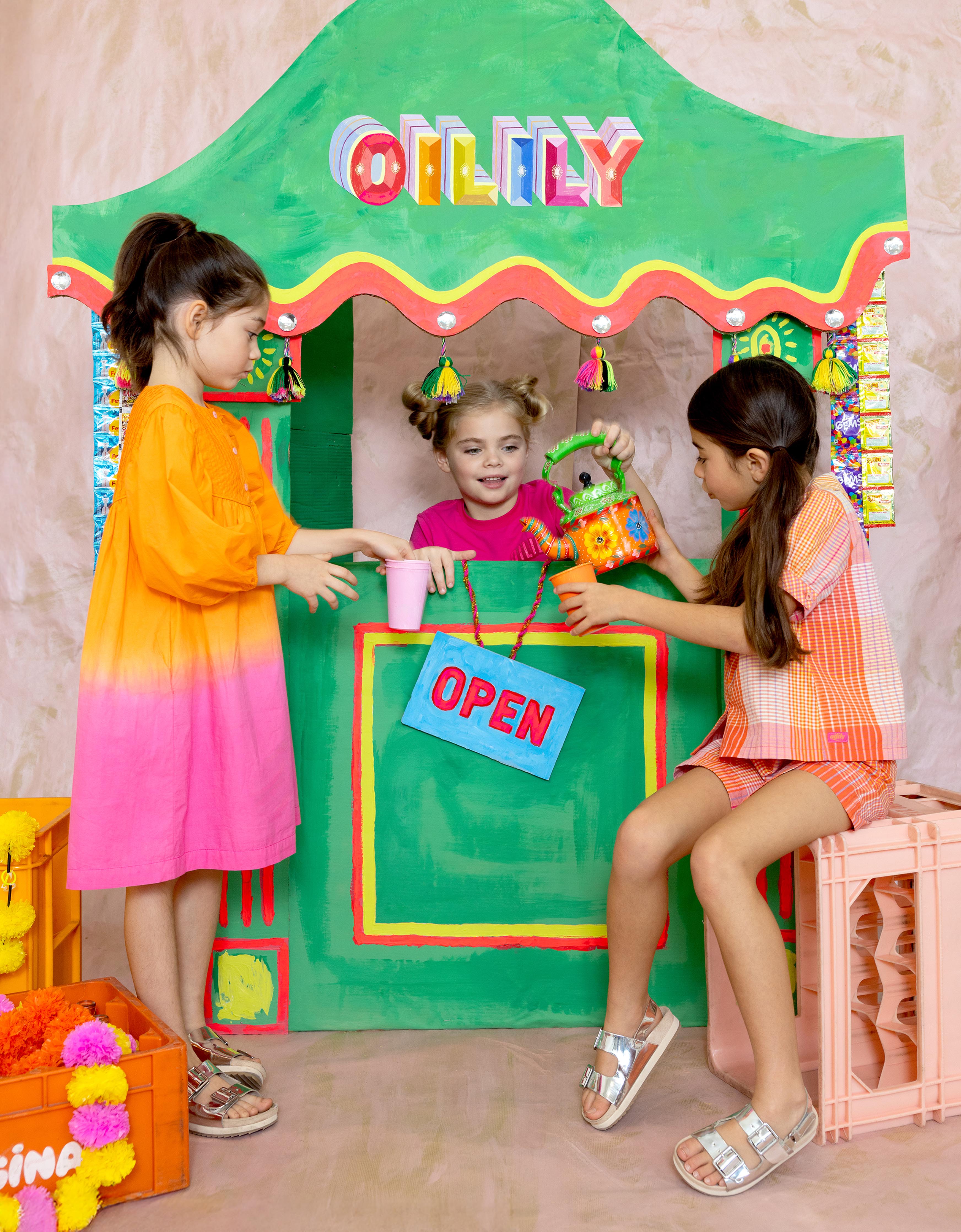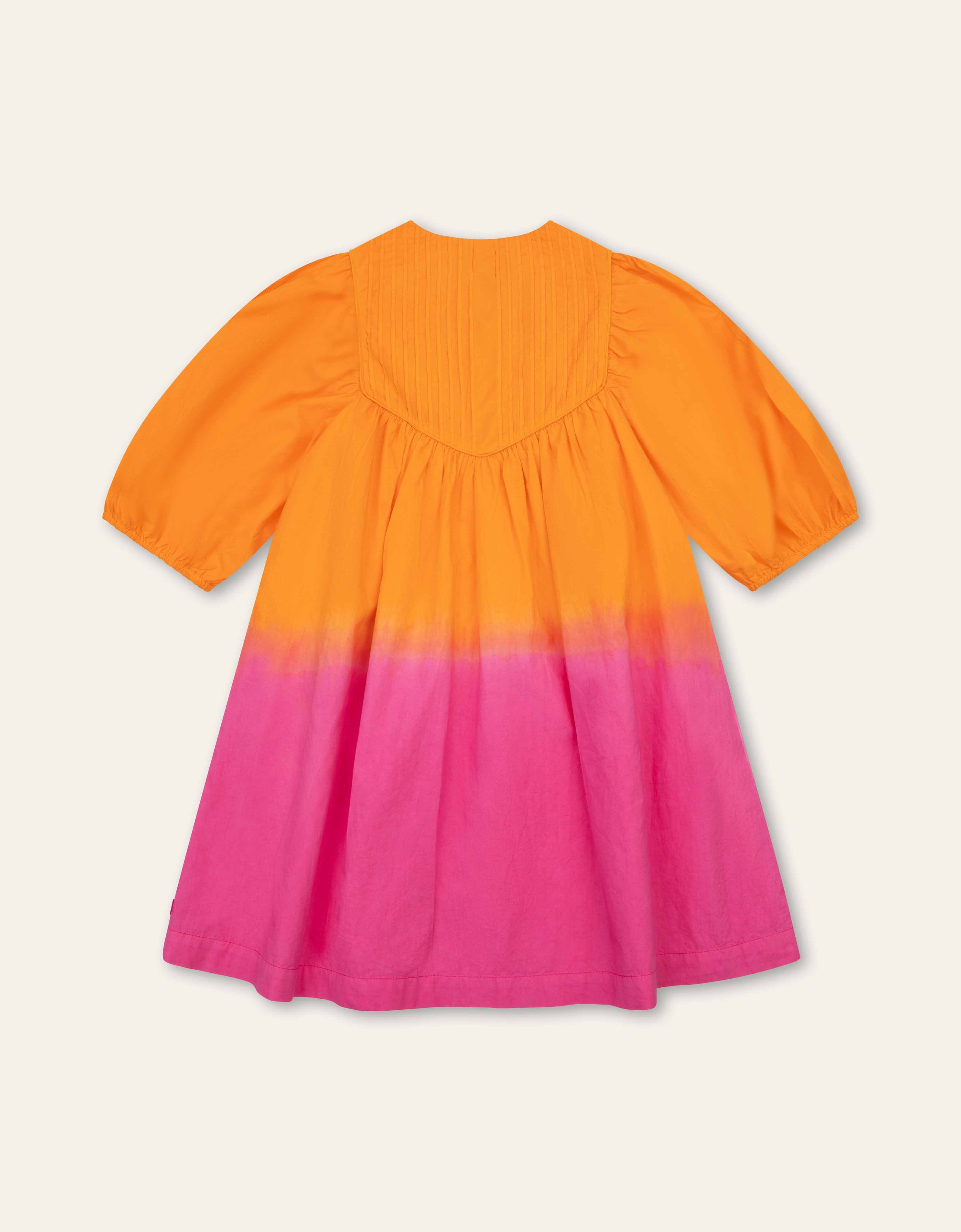 This dress has been dipped in dye, first in orange, then in pink. Each dress is unique, with flowing colours and a playful tie-dye effect.
