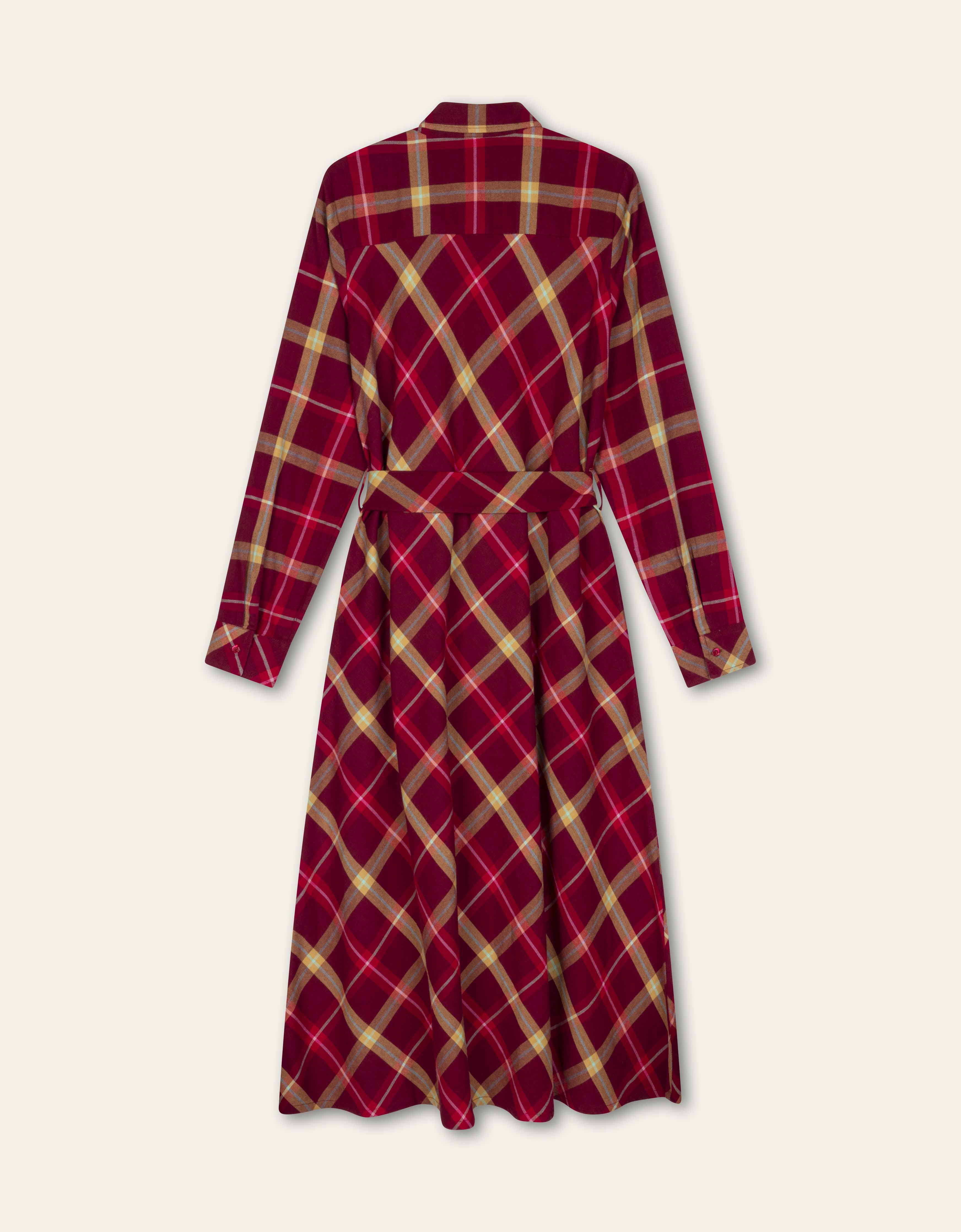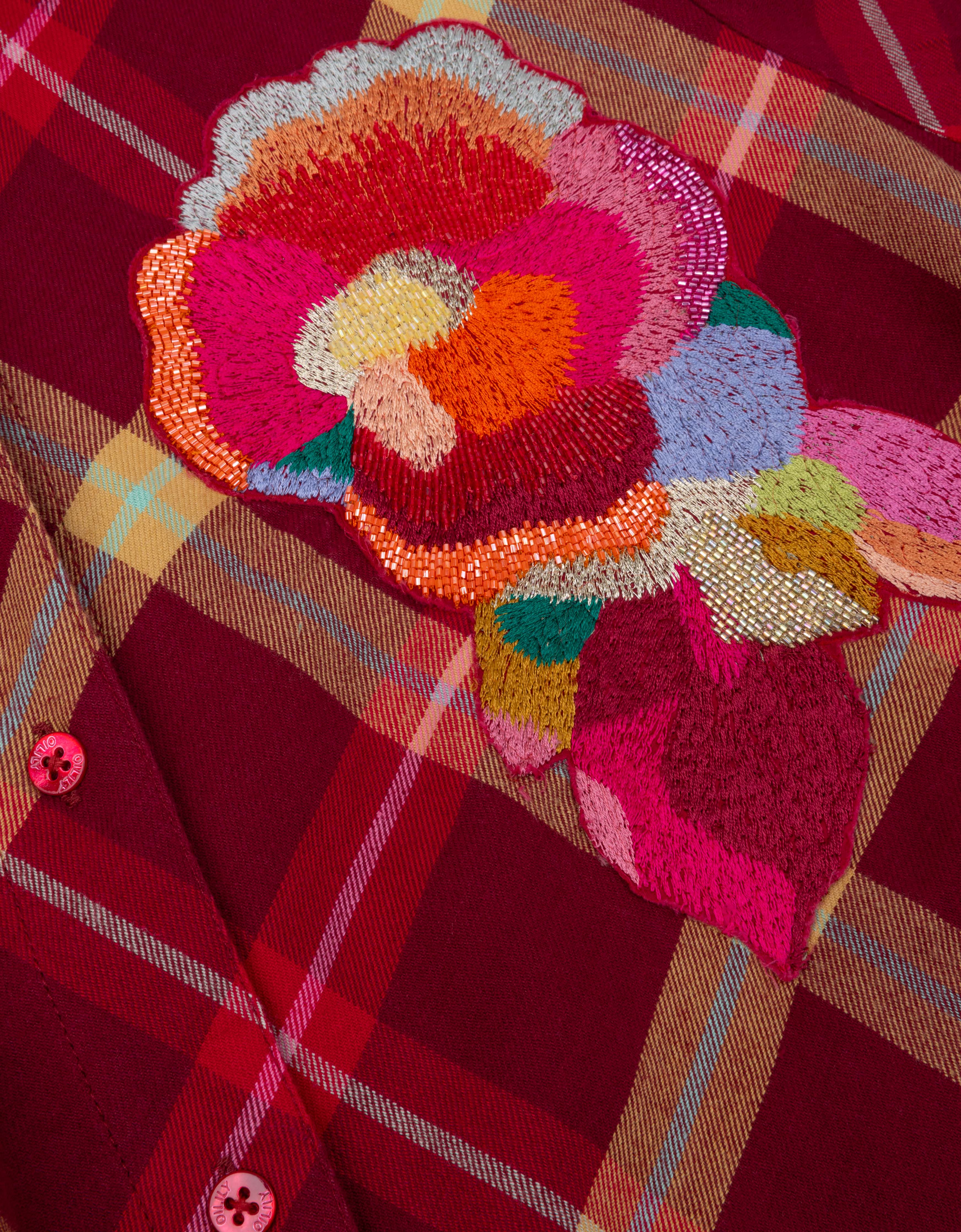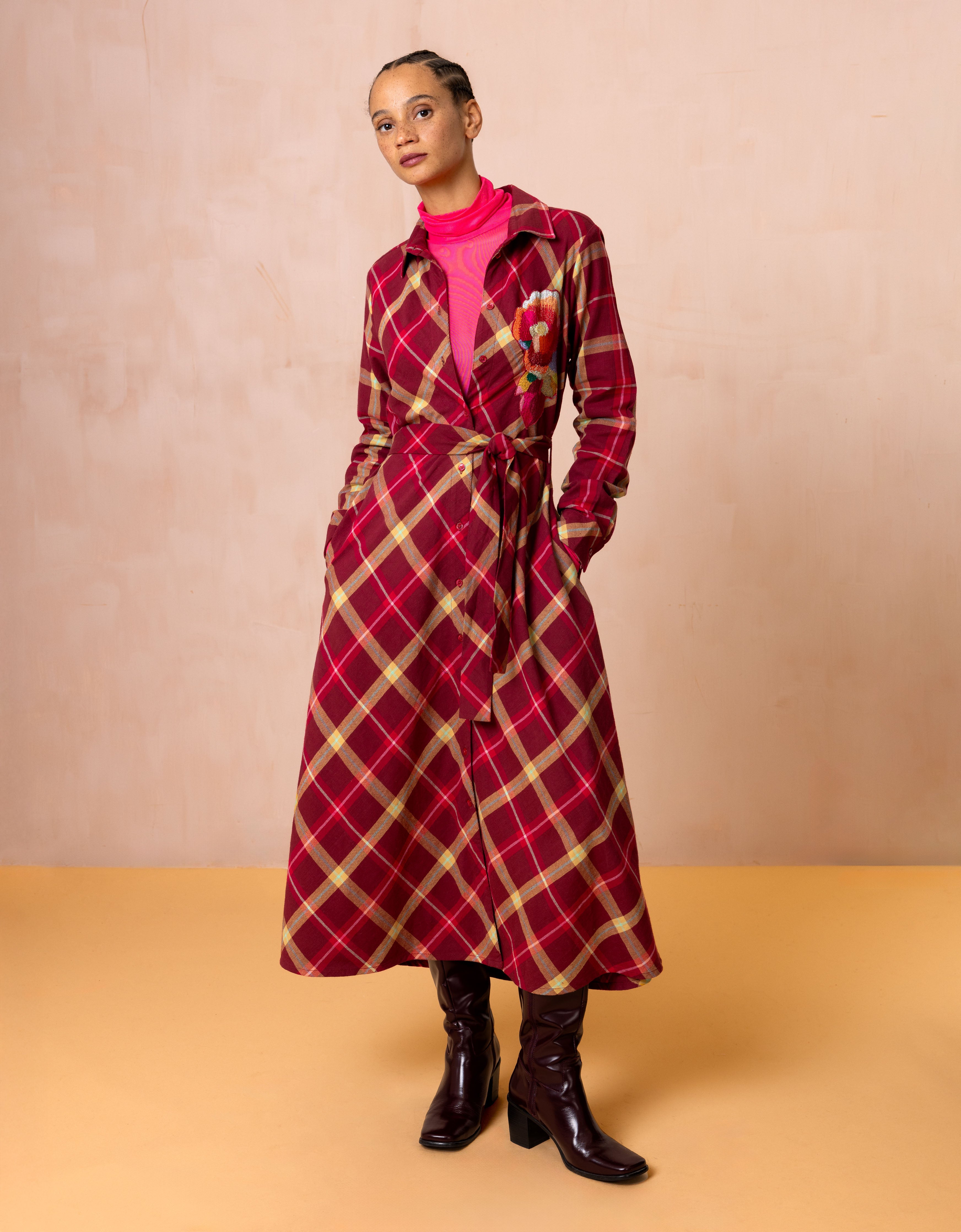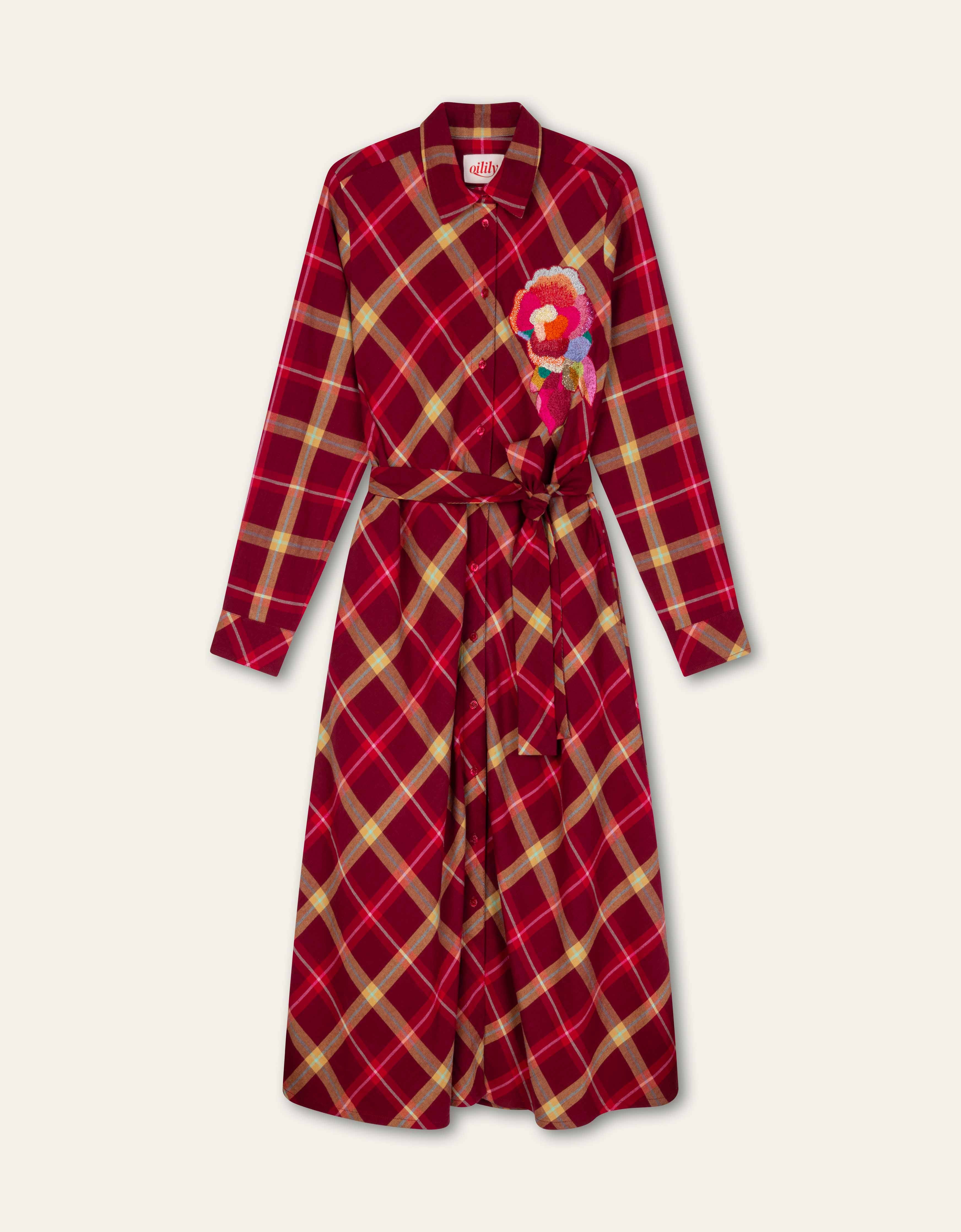 Cotton midi-dress with matching belt in cool check. The gorgeous floral colour accent is embroidered partly by hand and shines by the subtle use of sequins. And, of course, this dress has side pockets.