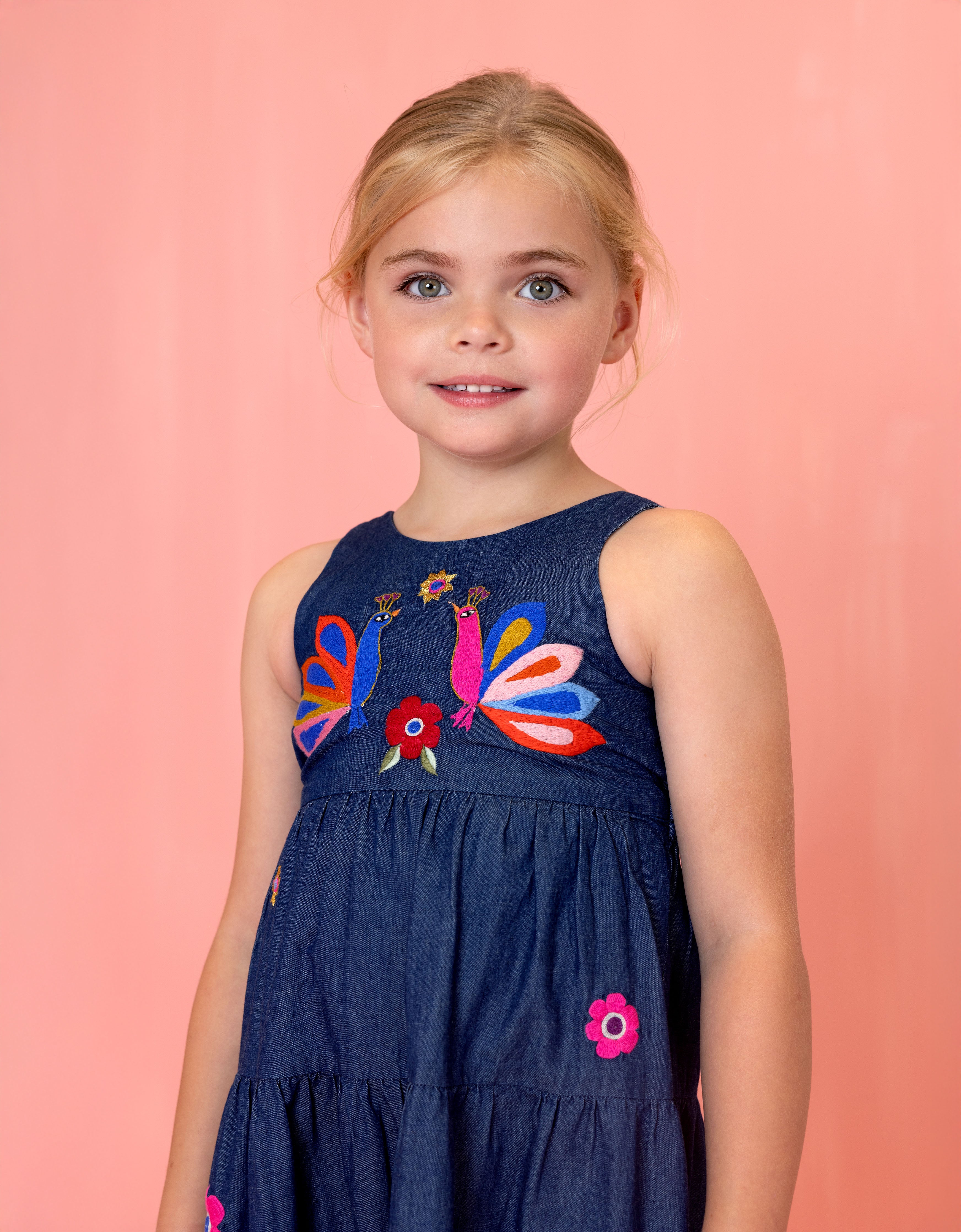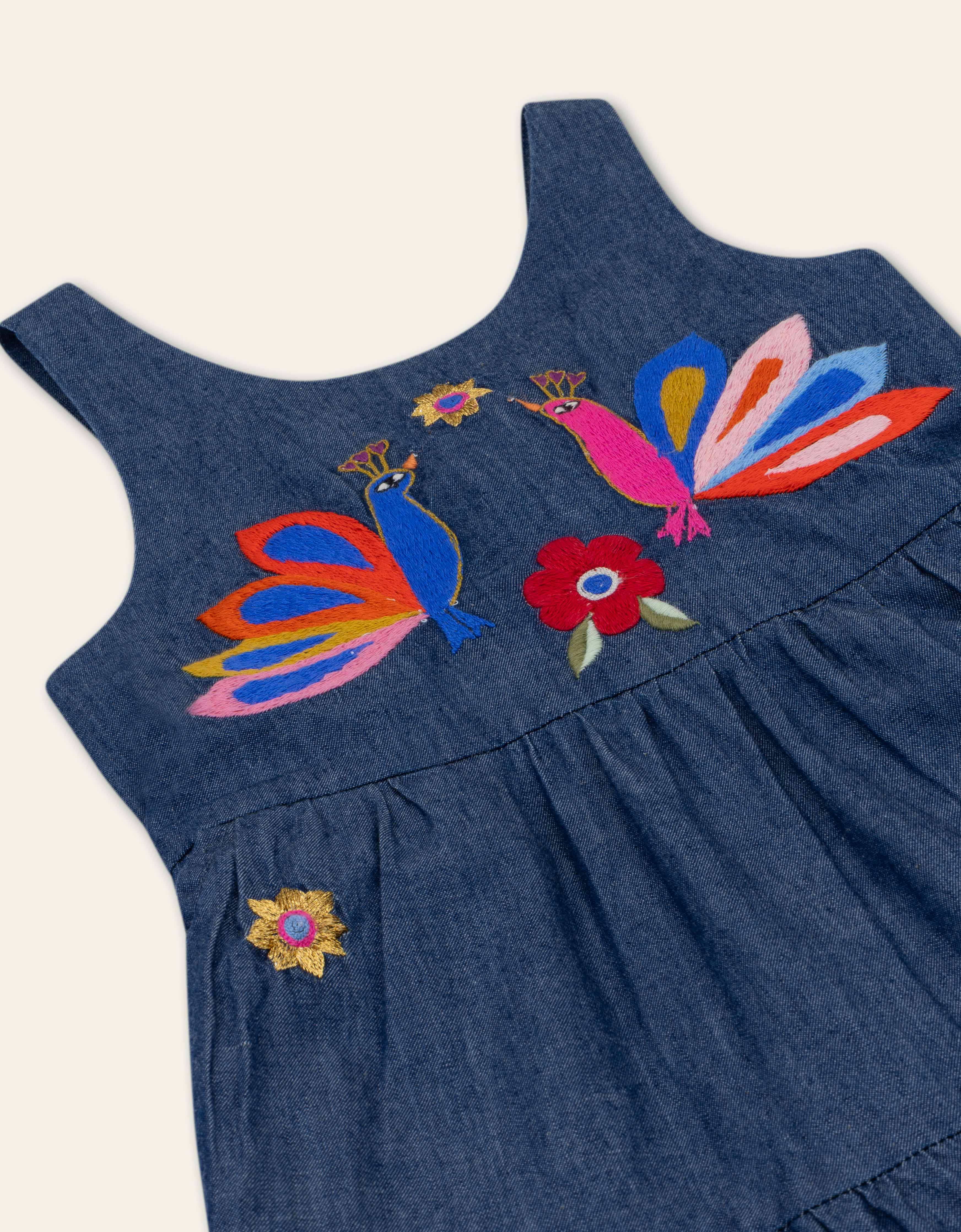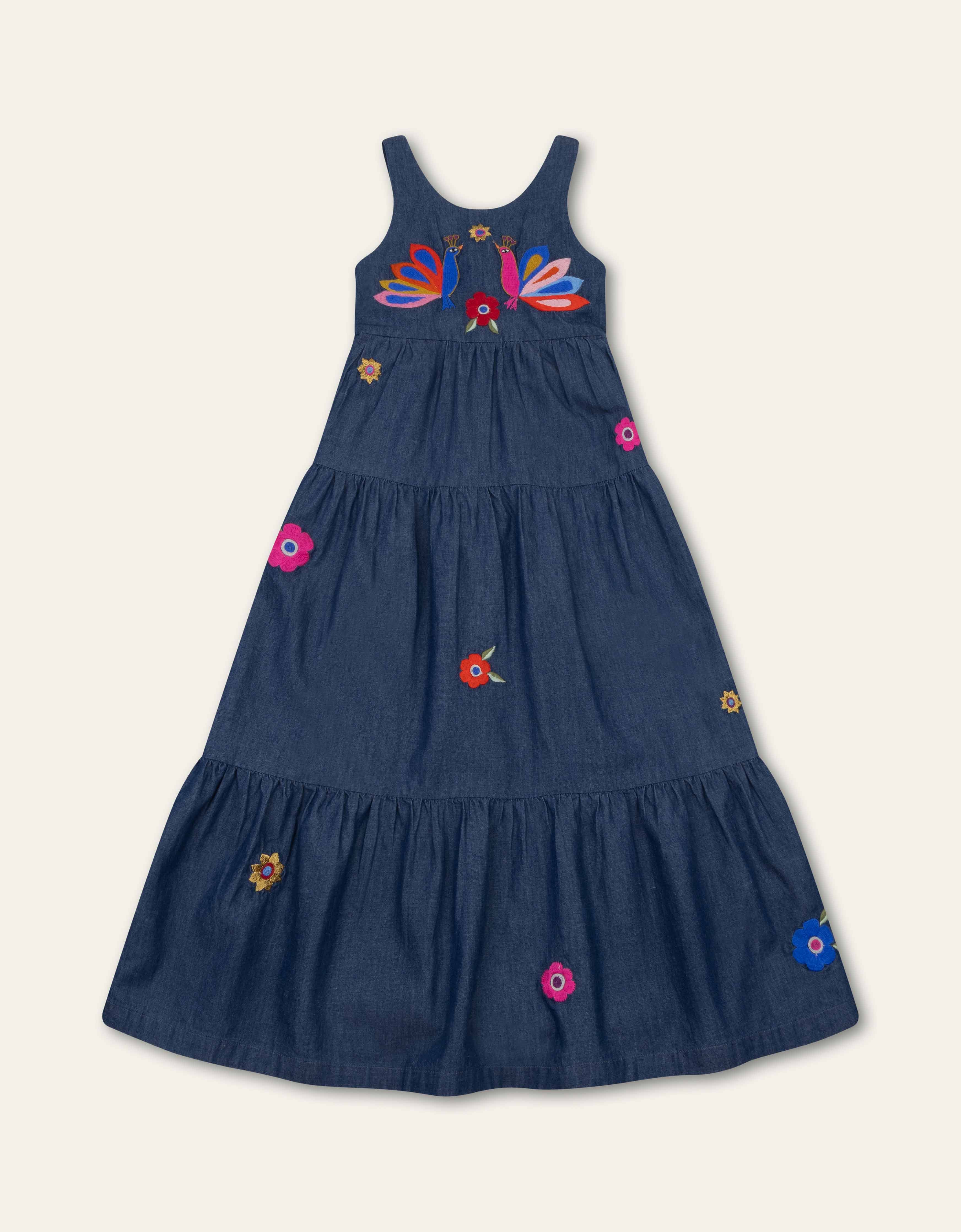 Long dress in supple denim look made from 100% cotton, with an open back and embroidered details.