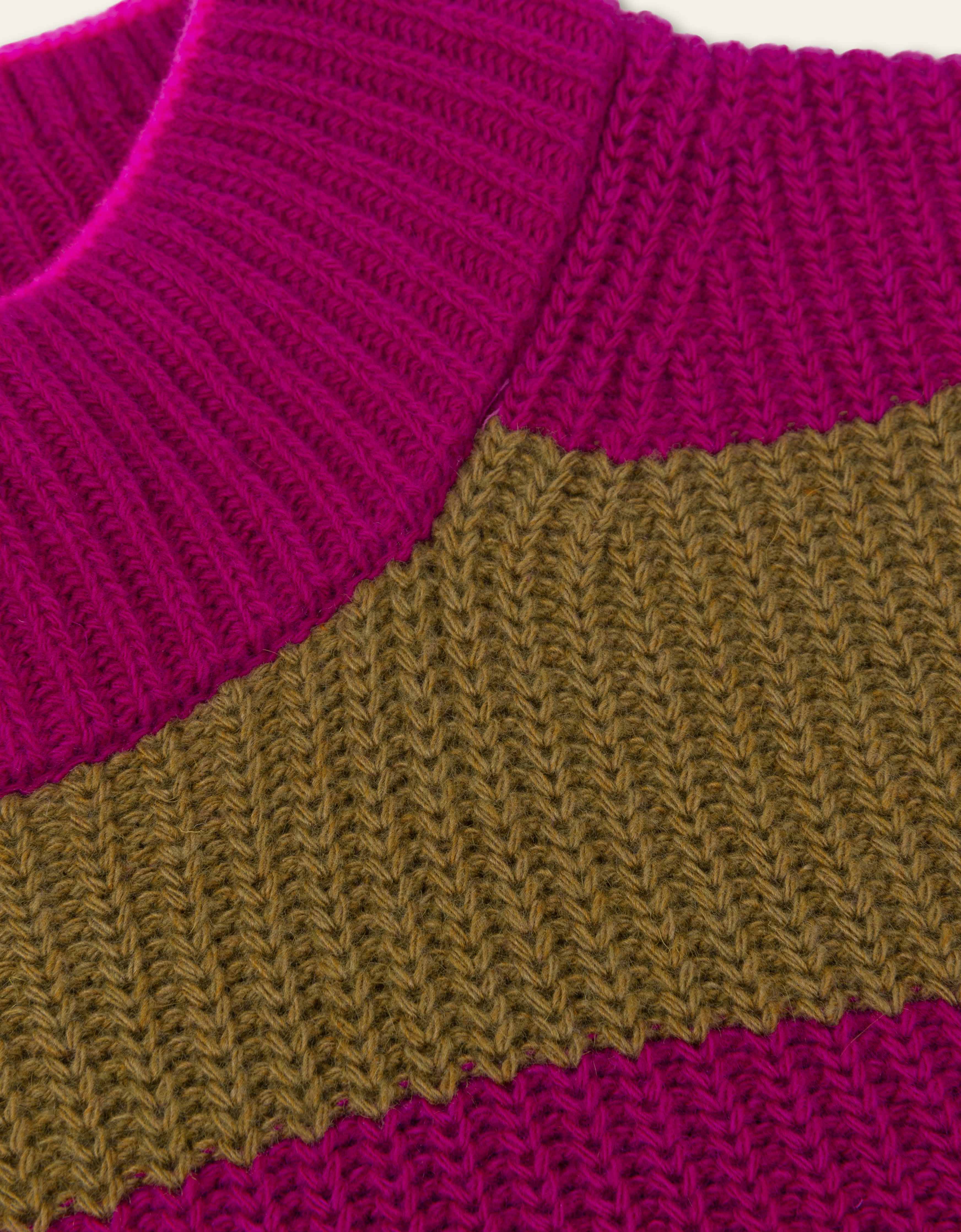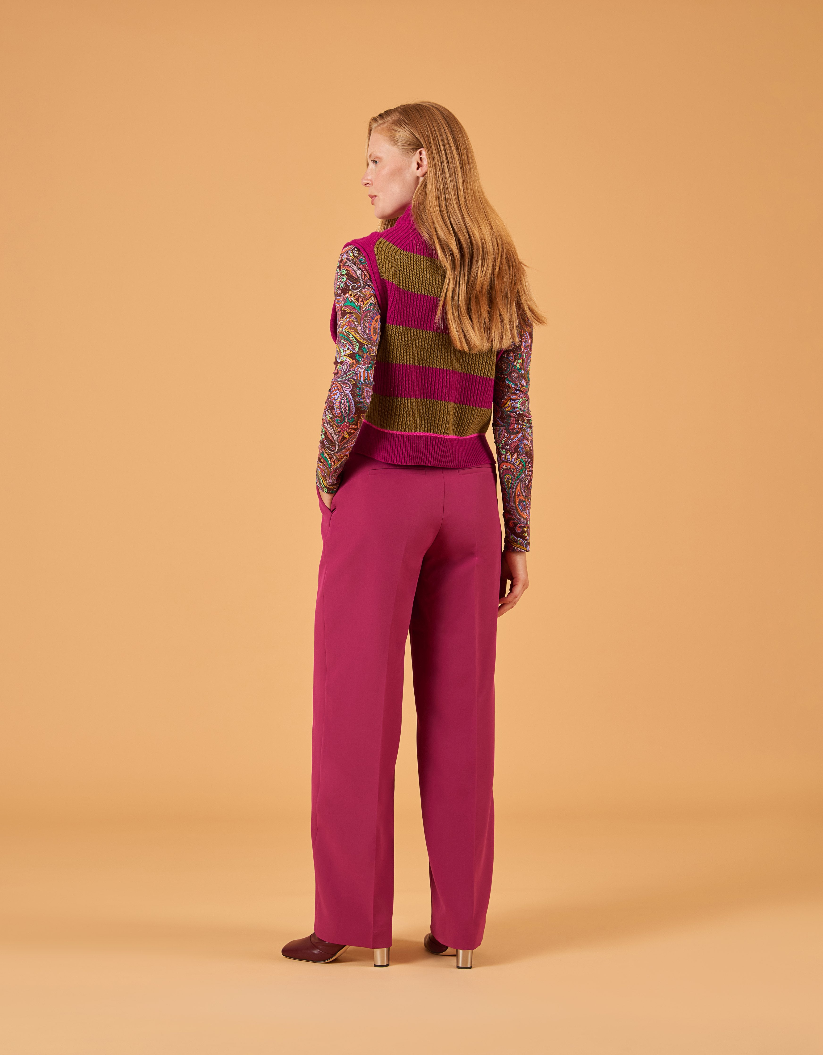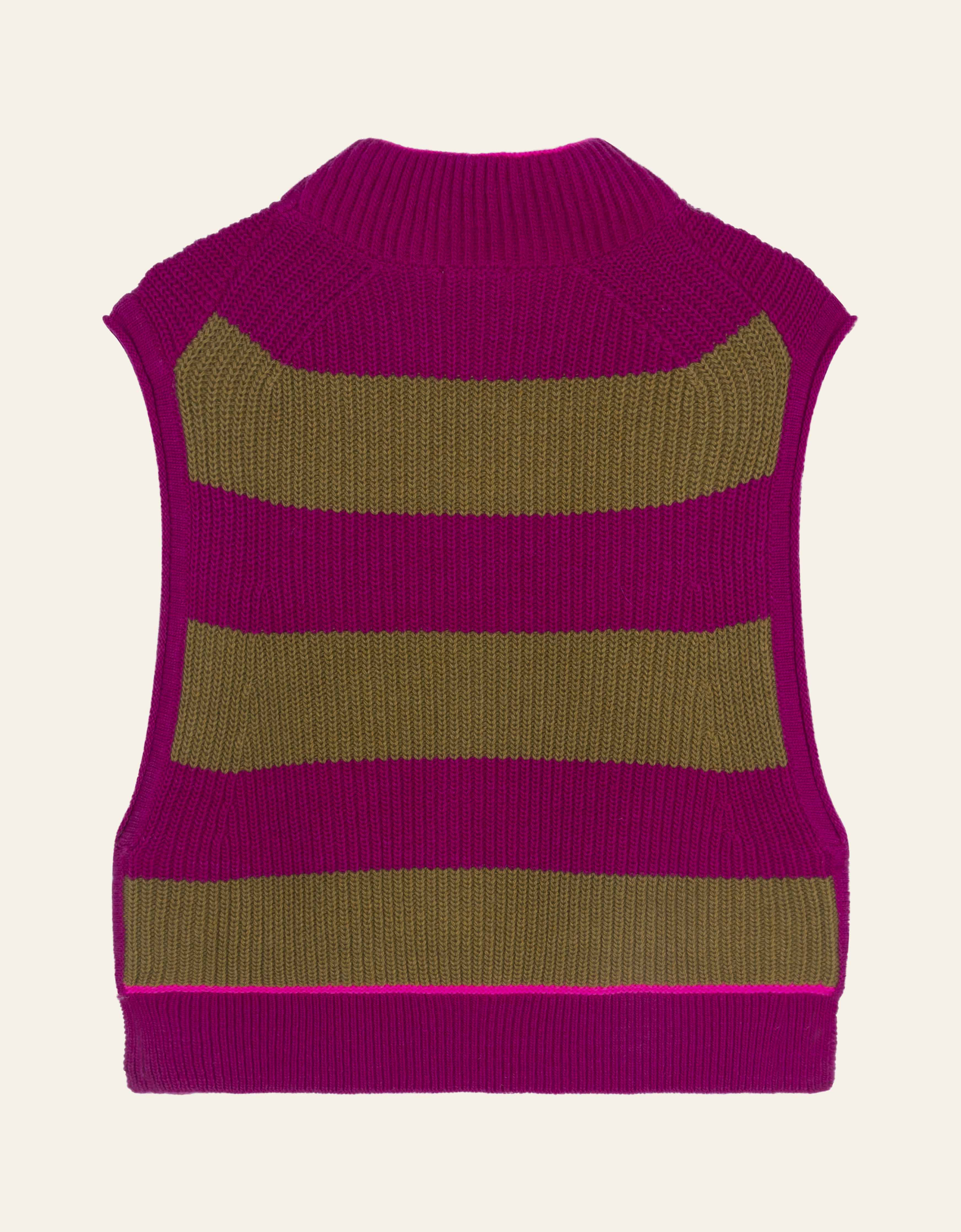 Go for layers by mixing & matching with this spencer. Because of the extra large armholes, knitted fully fashioned, you can easily combine this spencer with wide-sleeved tops and blouses. The trim continues in the side and goes into a contrasting coloured split. To keep the shape of your woollen items, we recommend you don't hang but fold this piece.