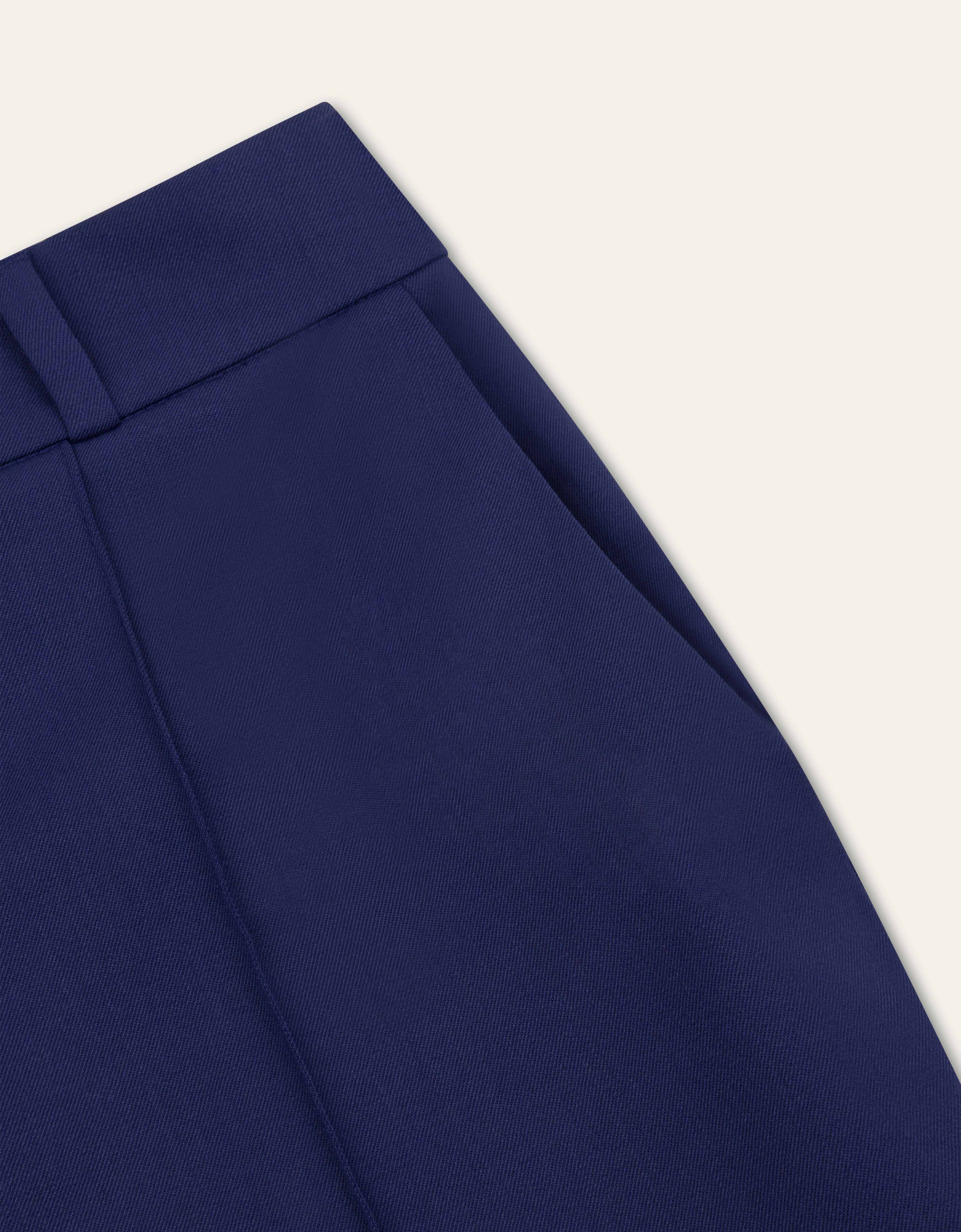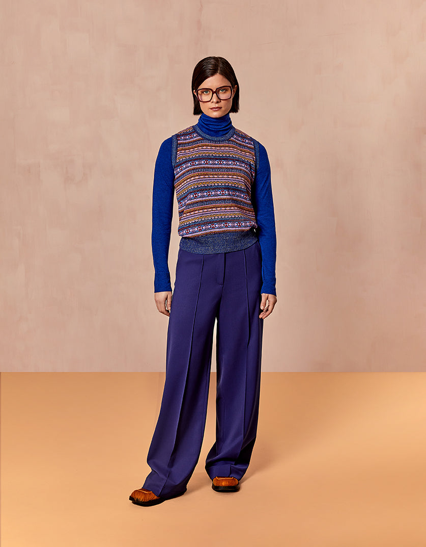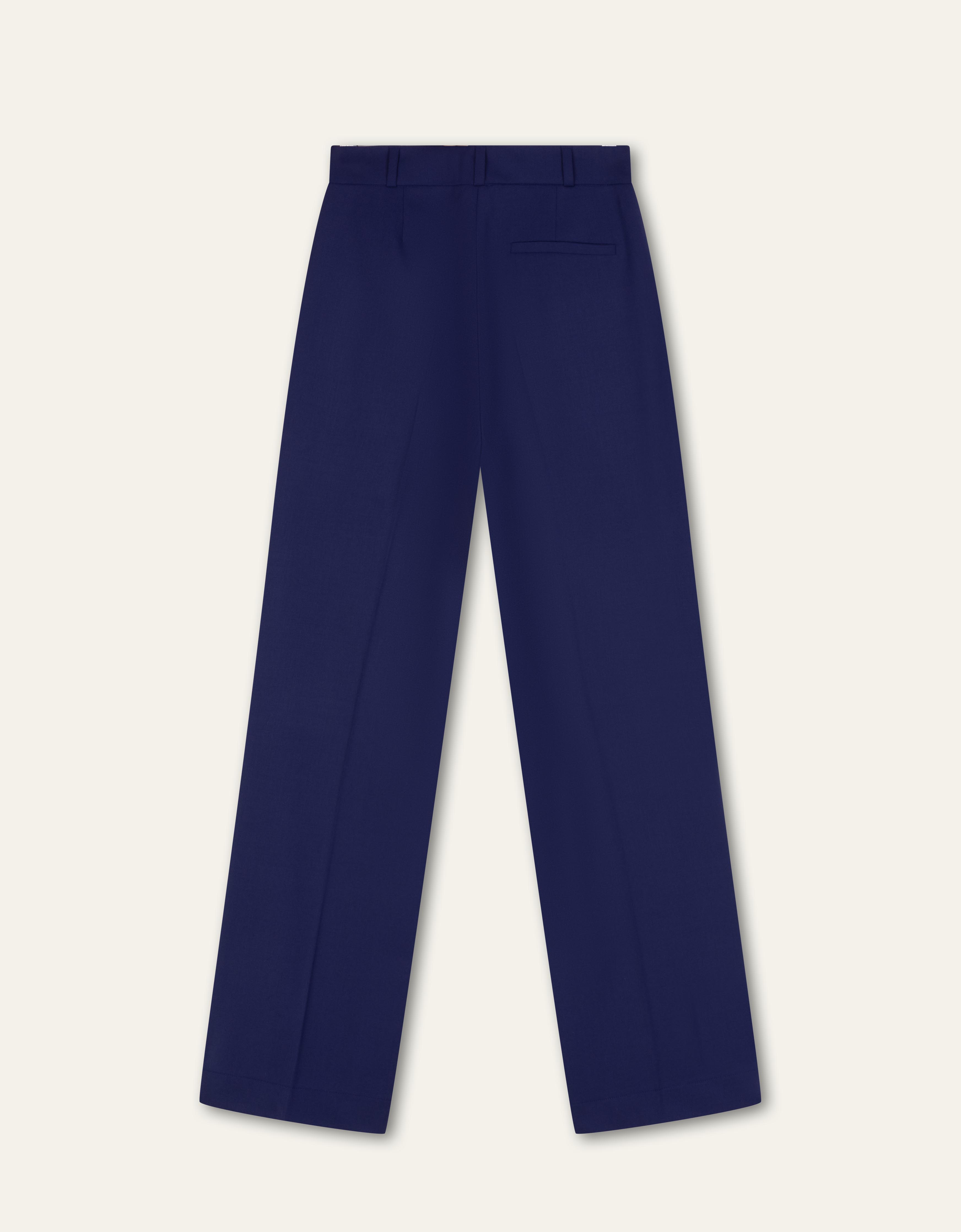 Lovely trousers for any occasion with a straight fit and a strong pleat along the front. With a blind zipper and a faux back pocket. The lining in the waist is playful with the colourful print Pieternella Strips.