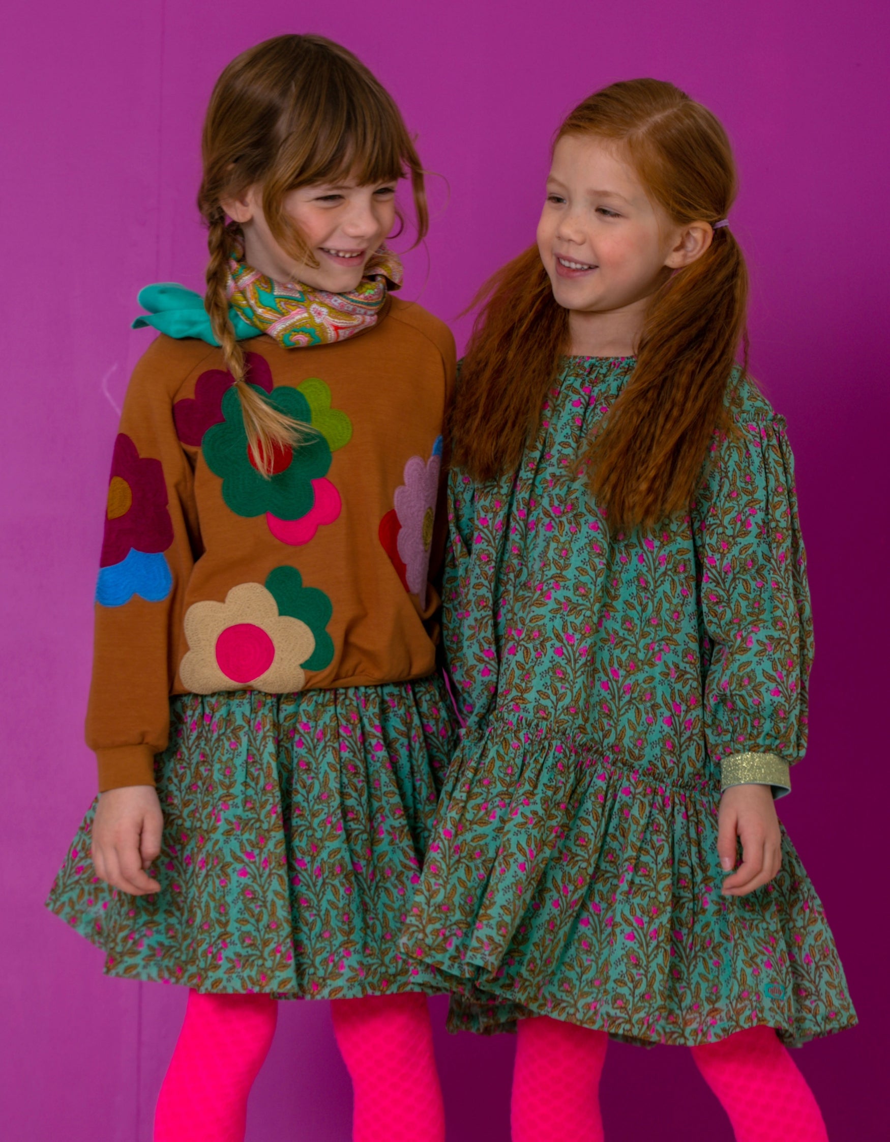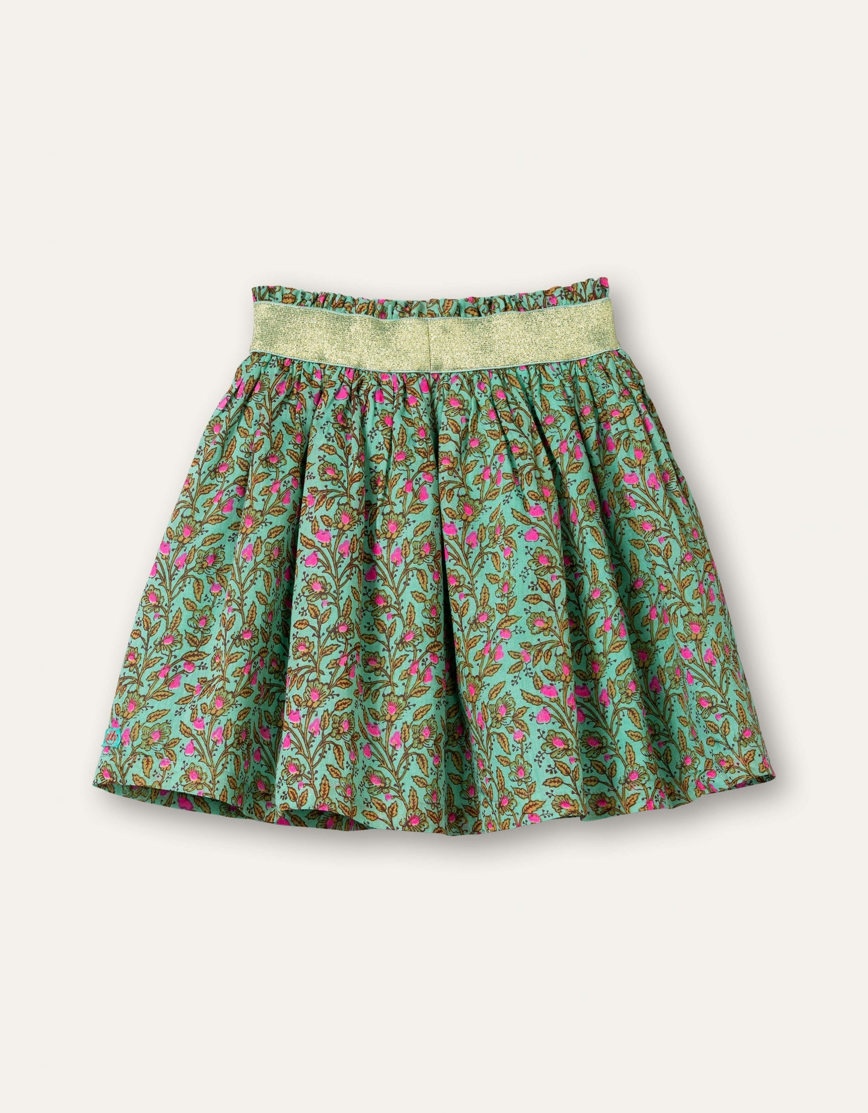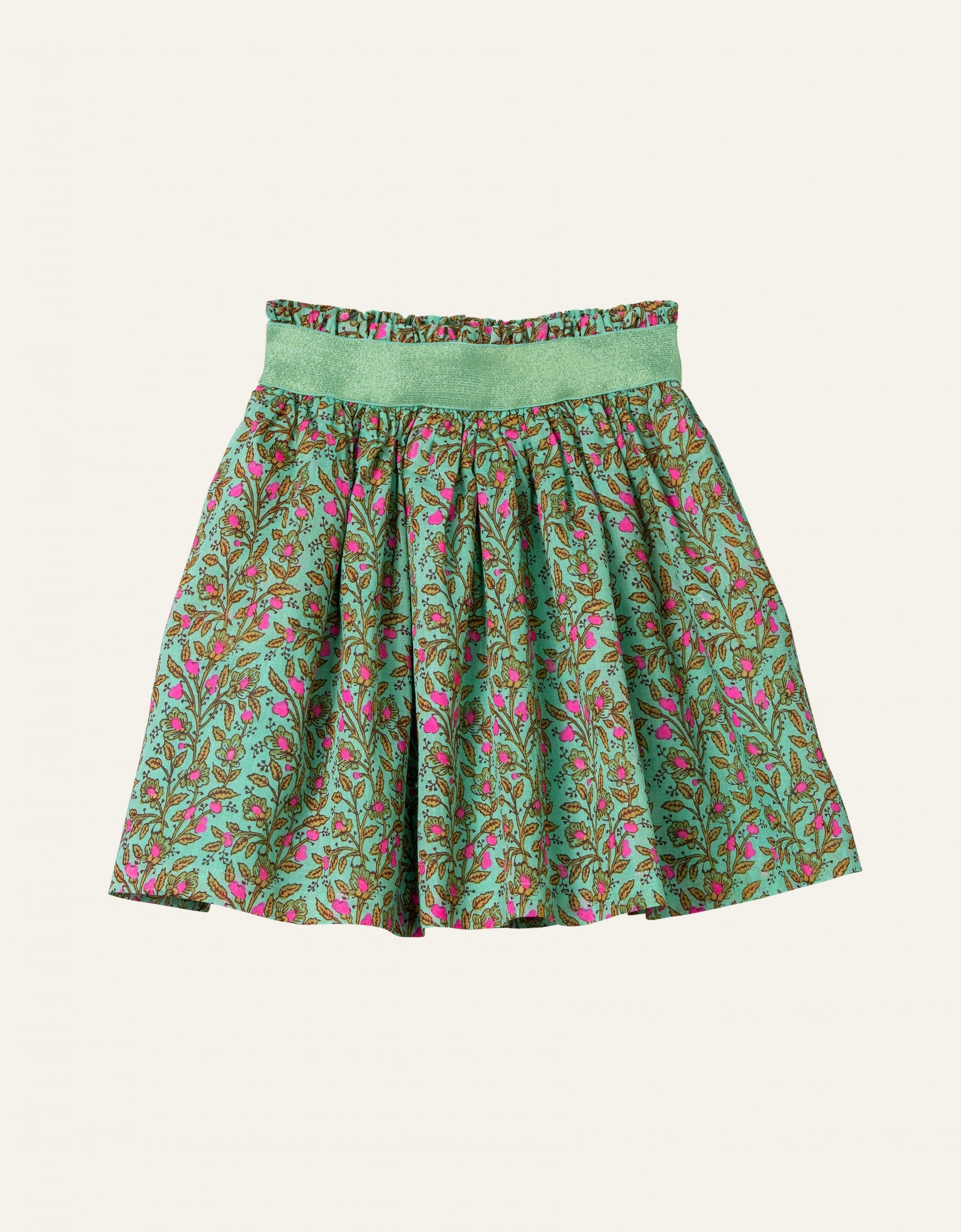 A cheerful floral skirt with frills and a golden elastic waistband. The floral print is screenprinted making it look gorgeous inside and out. With bright pink dots as colour accent. - 100% cotton organdy - Double-layered - Regular fit