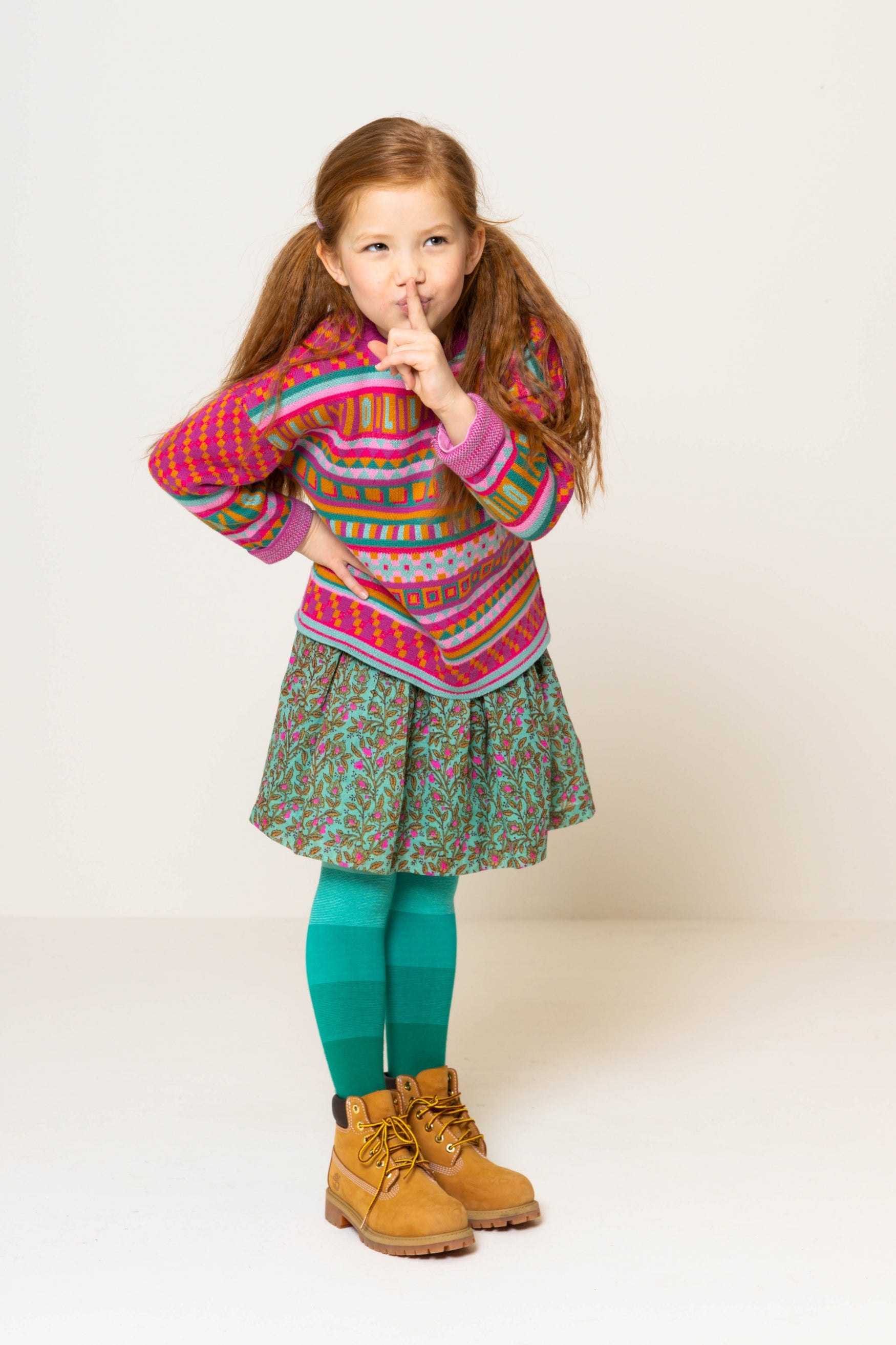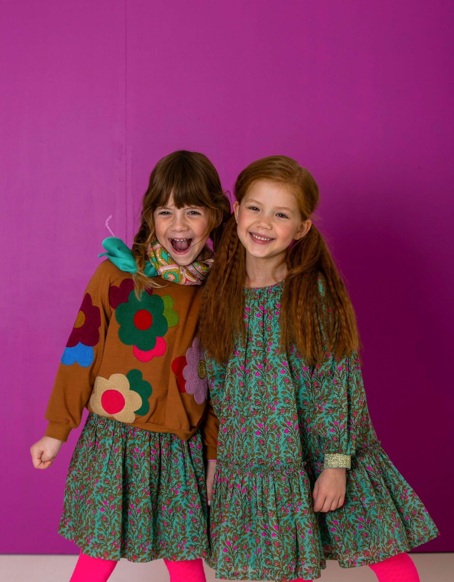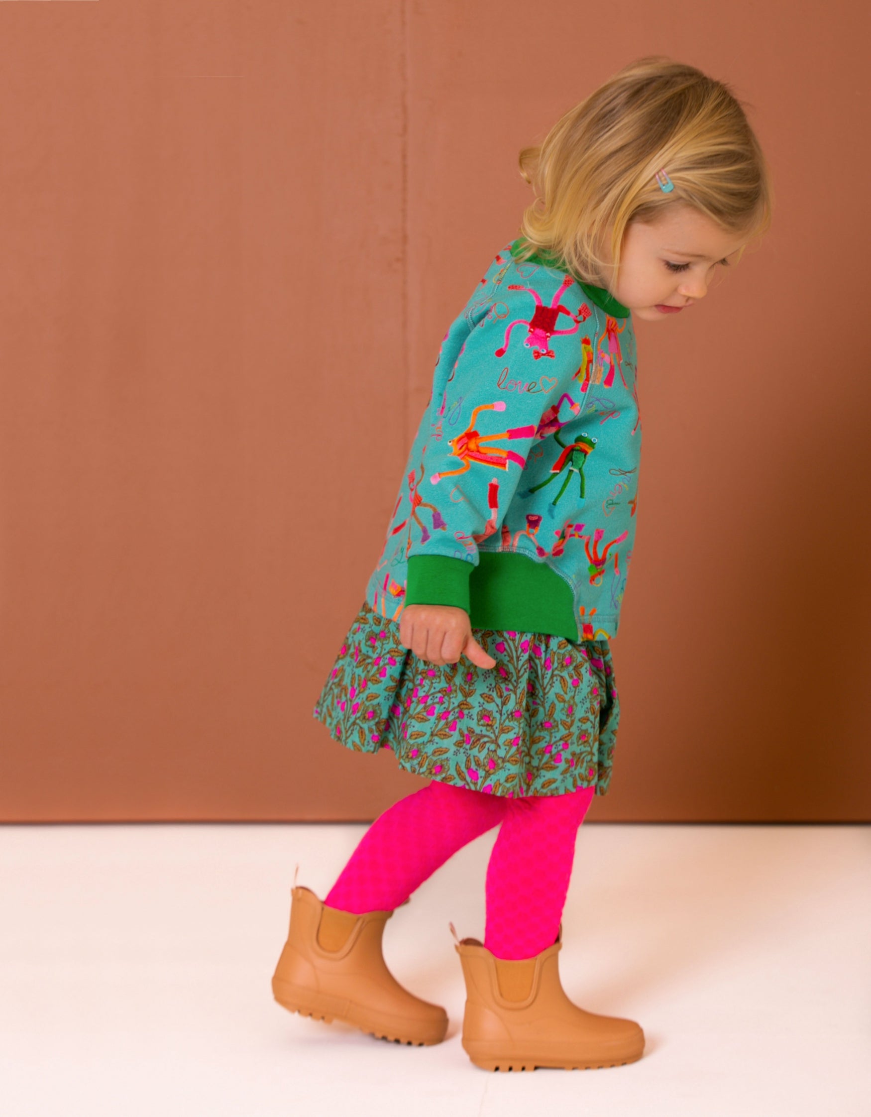 A cheerful floral skirt with frills and a golden elastic waistband. The floral print is screenprinted making it look gorgeous inside and out. With bright pink dots as colour accent. - 100% cotton organdy - Double-layered - Regular fit