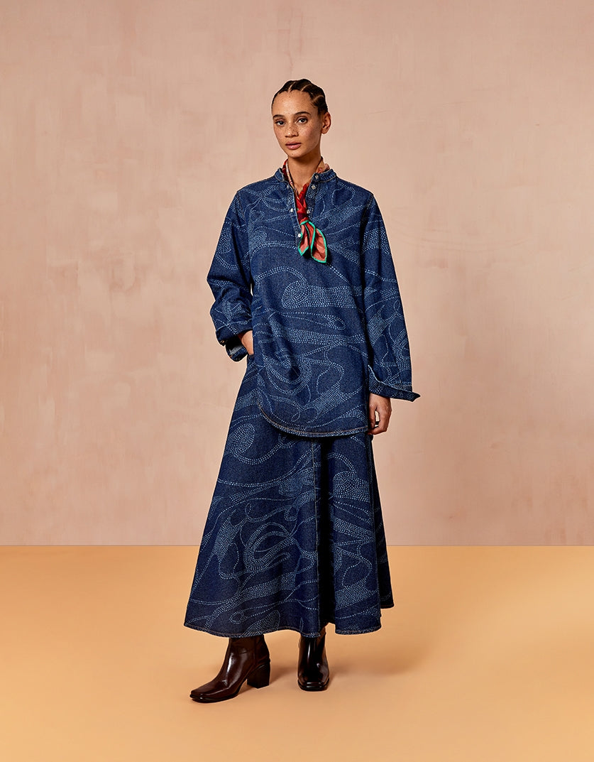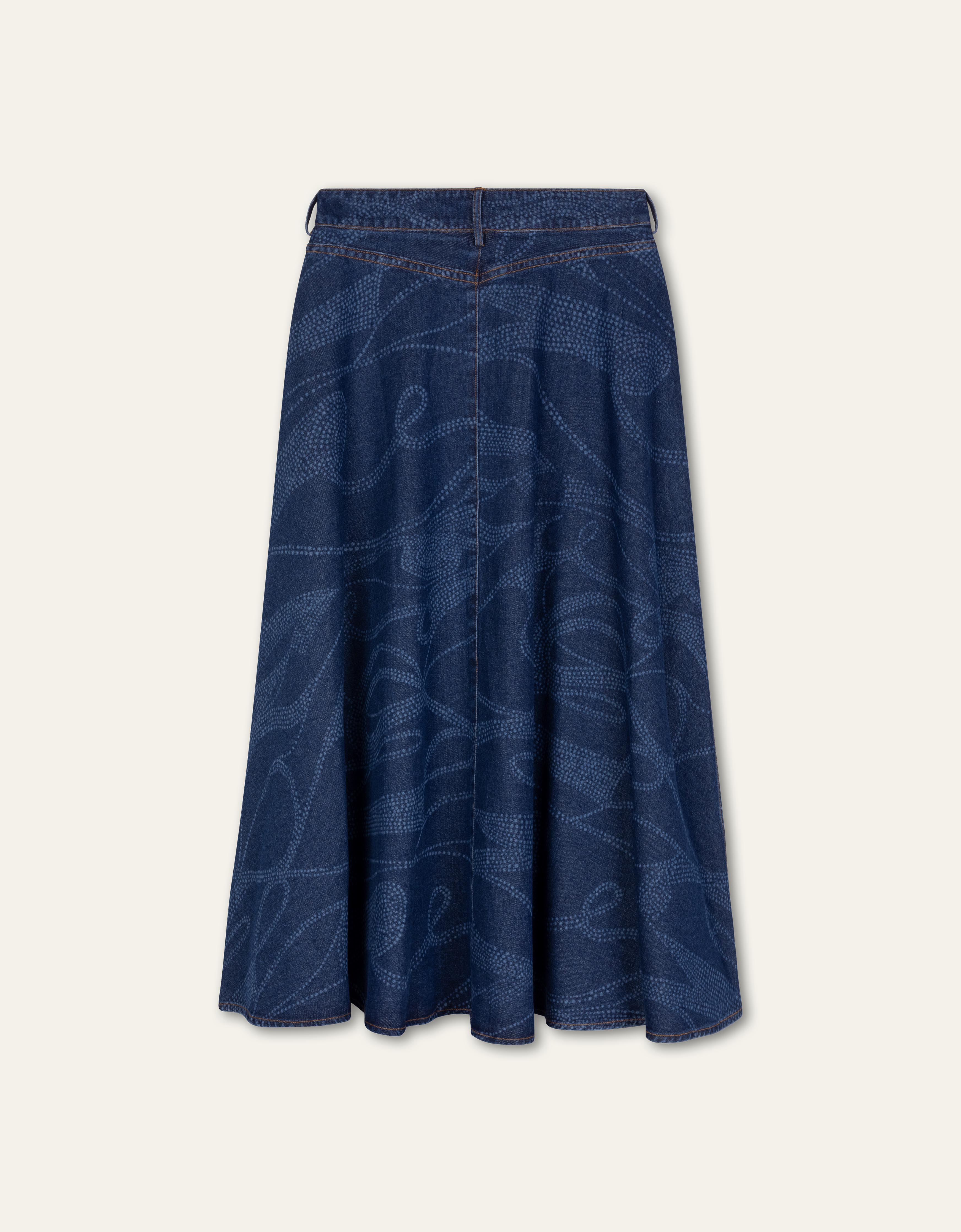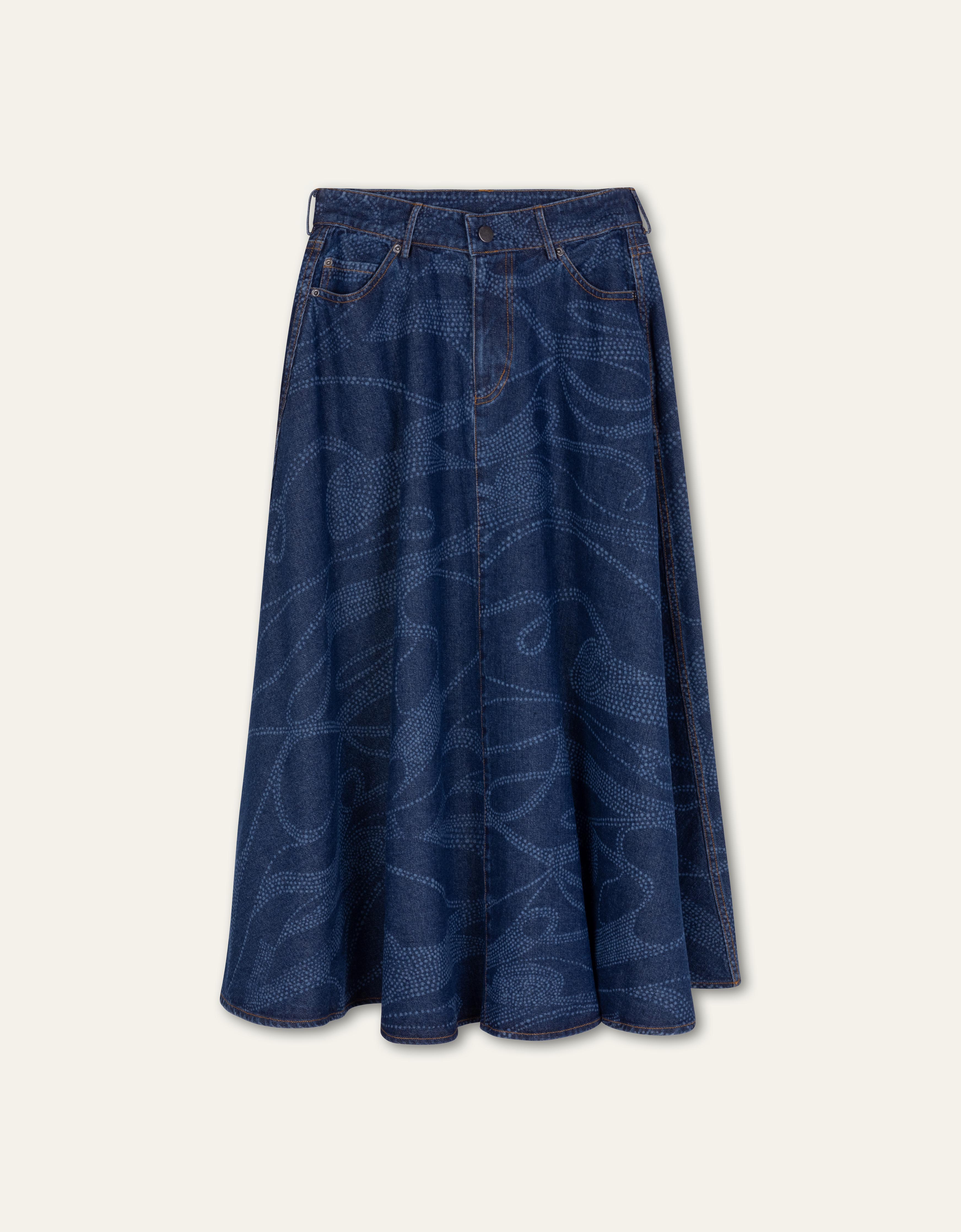 Go for denim with denim. Wear this long denim skirt with the matching denim blouse. The skirt has a laser-print and that brings an unexpected depth and texture to the material. The skirt has subtle front pockets.