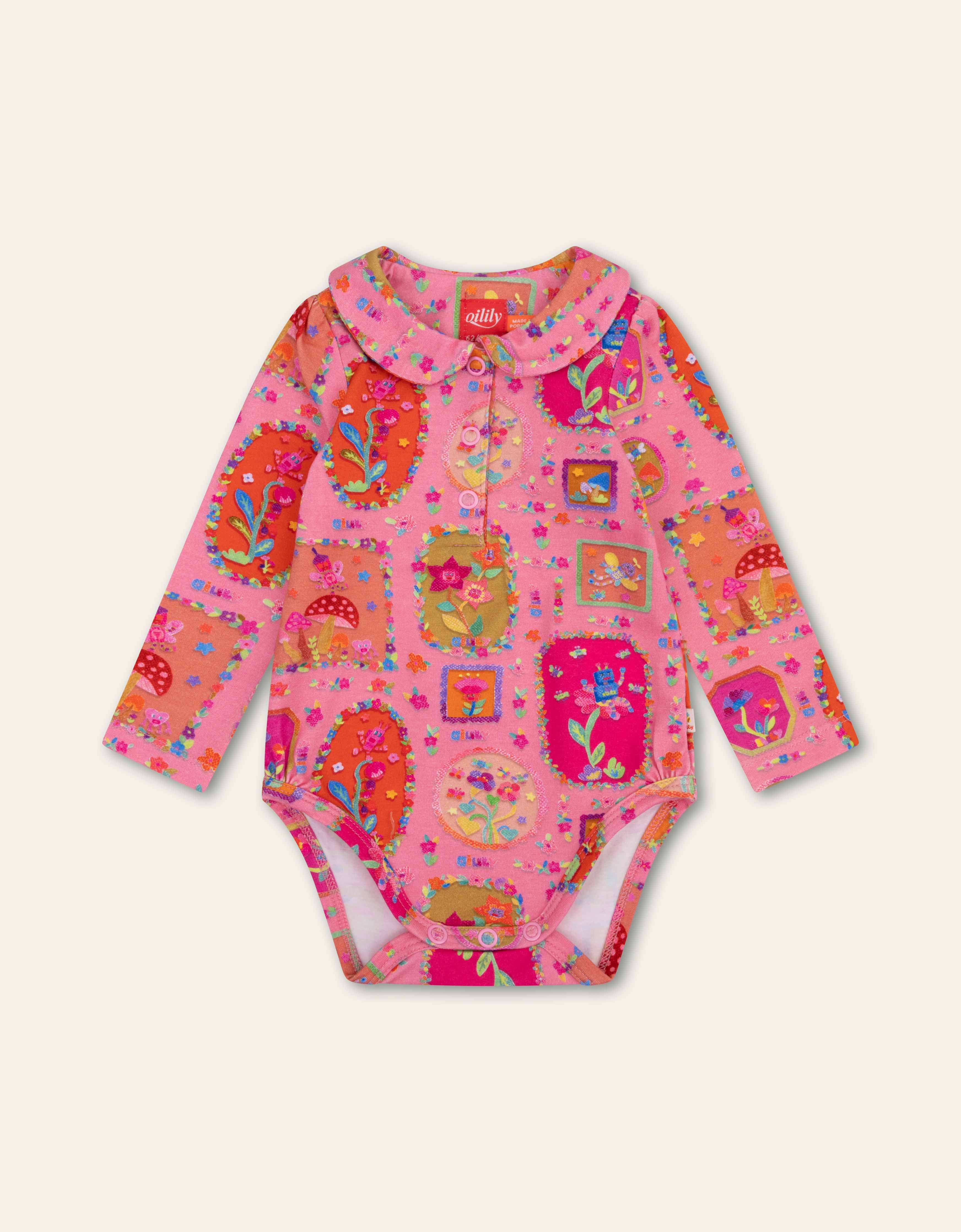 A romper with collar and long sleeves. In pink with hand-drawn flowers and robots on super-soft cotton.