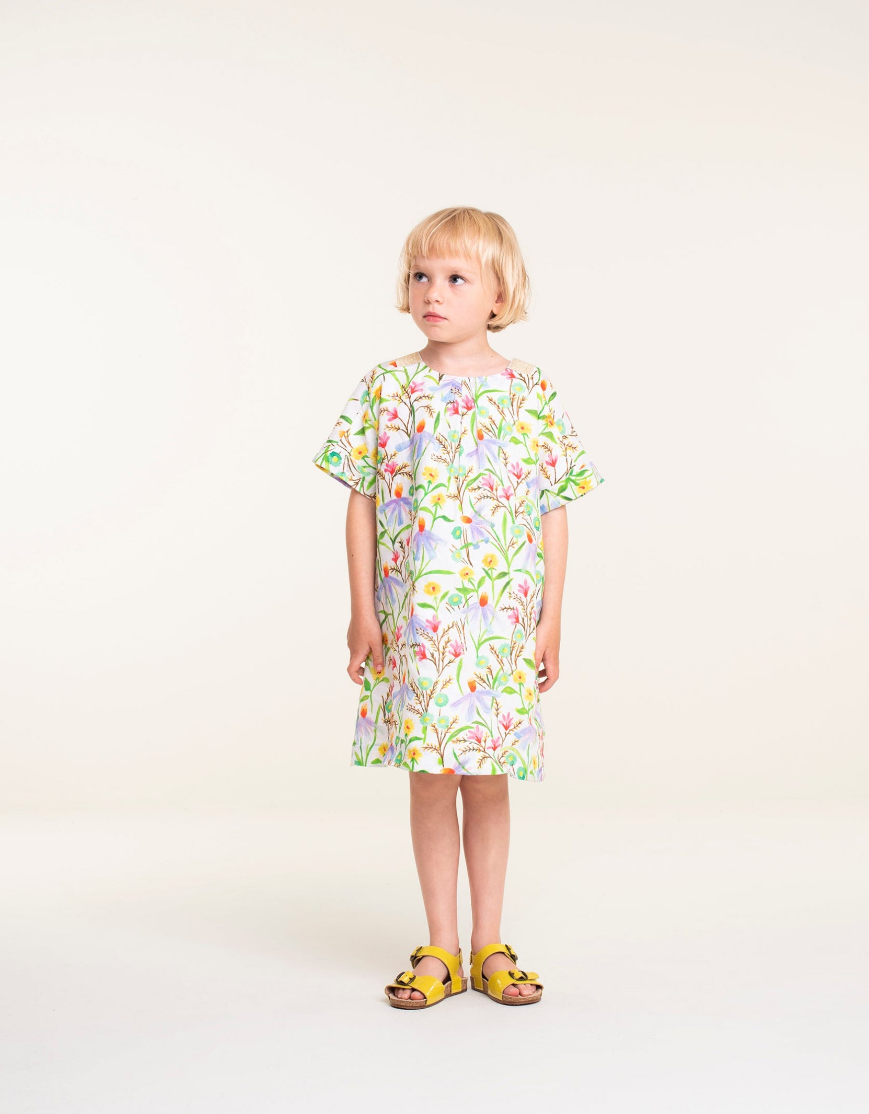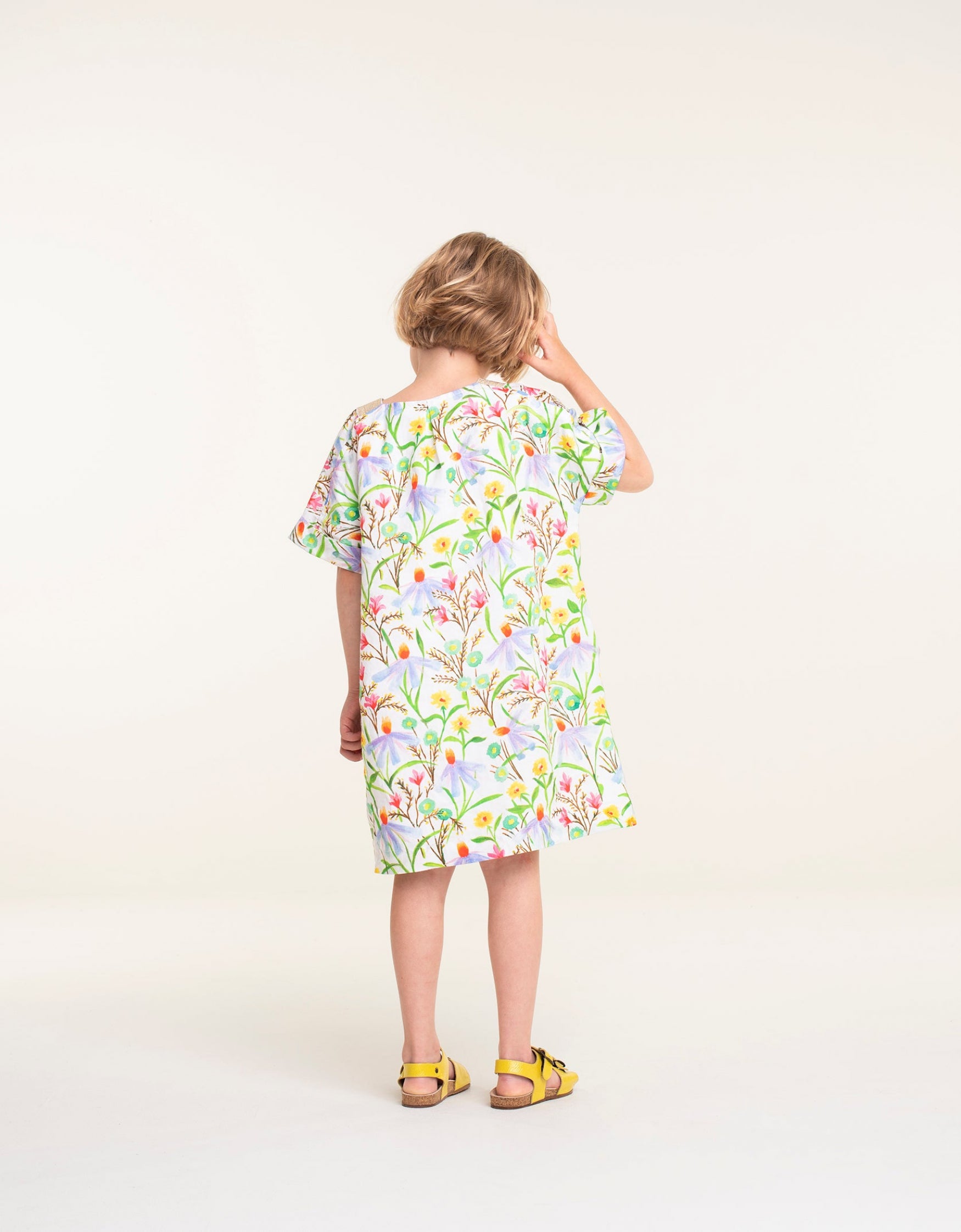 Light, breezy, comfy linnen dress with watercoloured flowers for a daydreaming look. This dress has a relaxed fit with short sleeves, sideseam pockets and glitter golden accents on the shoulders. - Relaxed fit - 100% linen - With a flexible collar