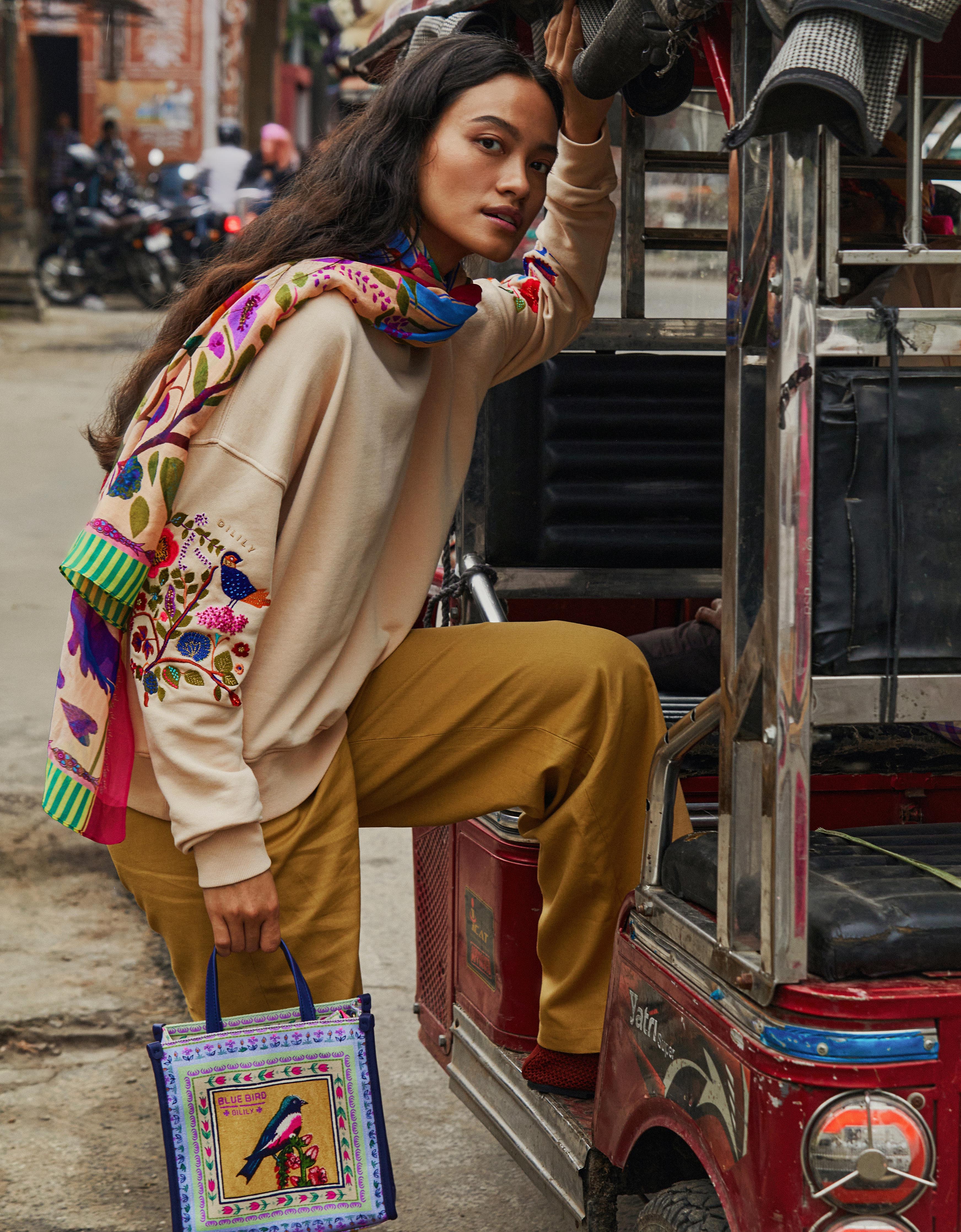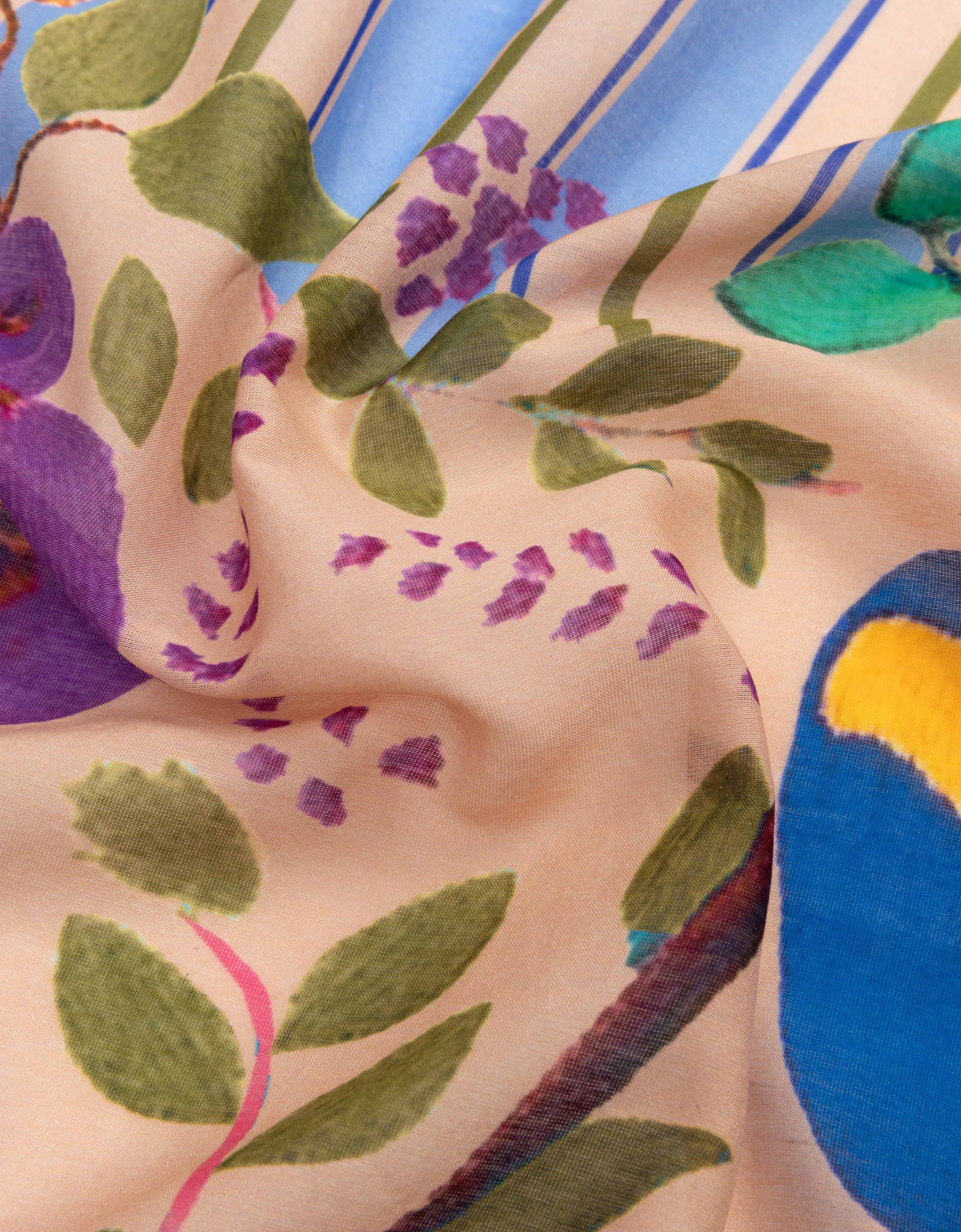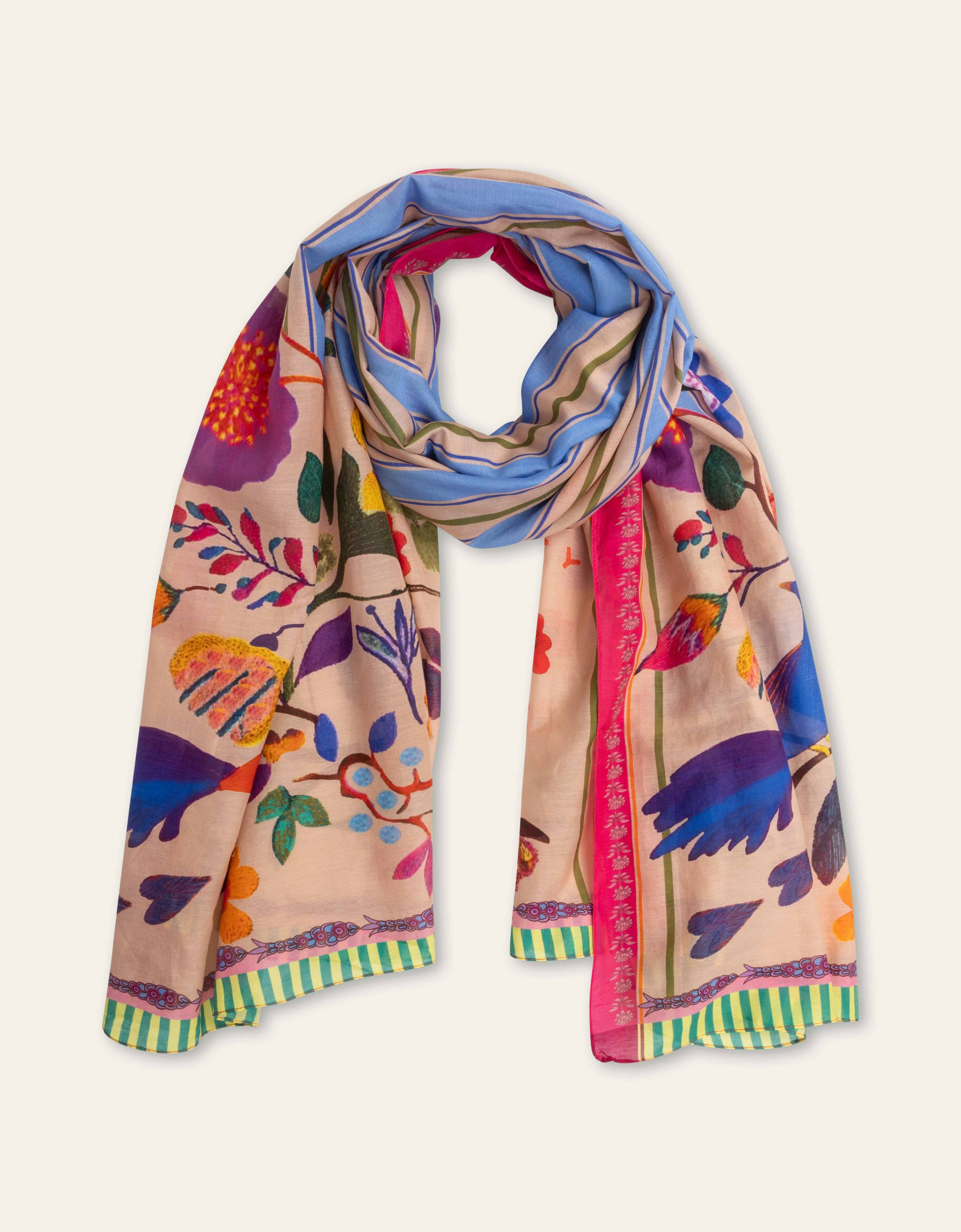 This scarf combines stripes, flowers and blue birds in a playful and stylish design. The vibrant pattern gives your outfit a fresh, colourful look.