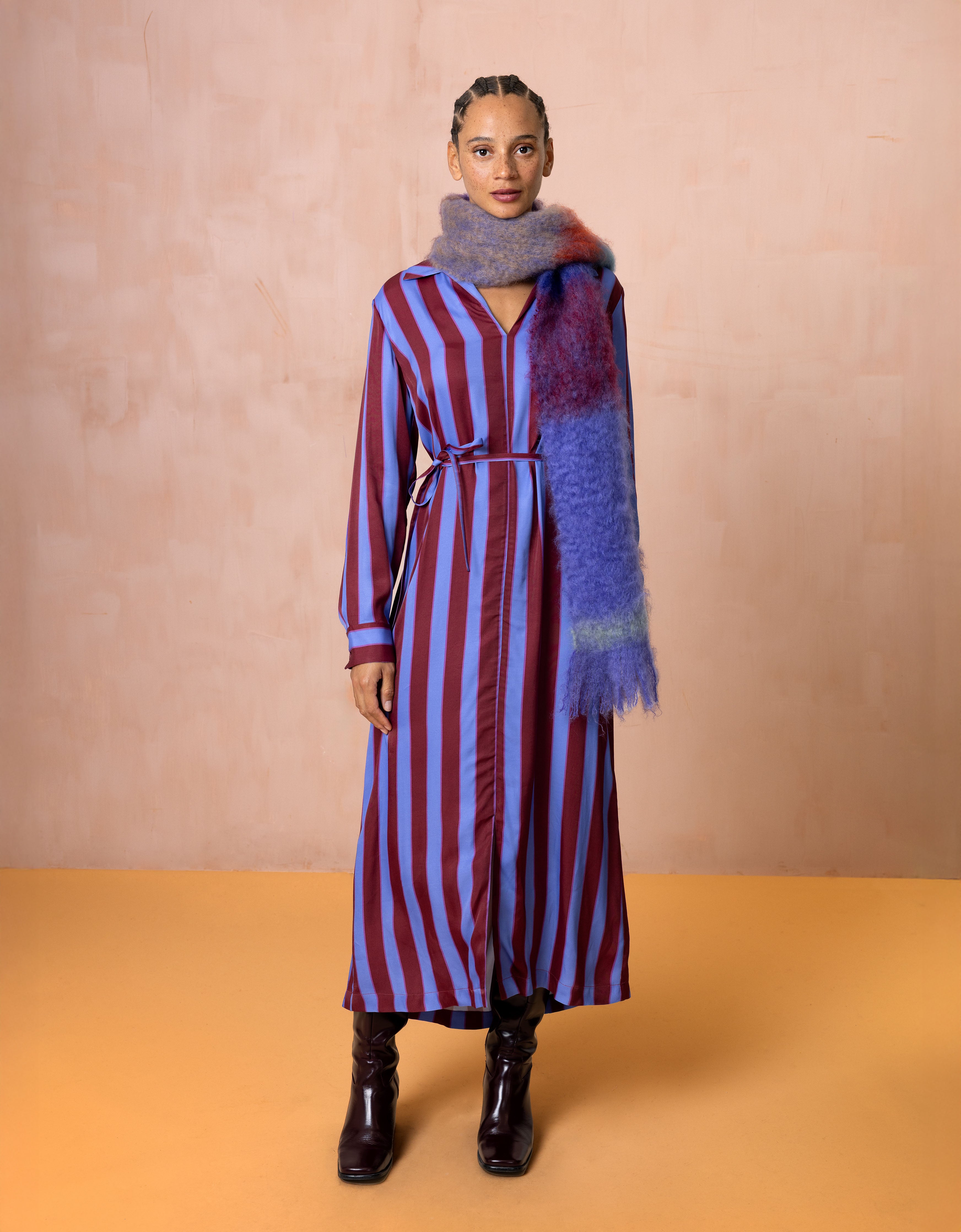 Midi button dress in warm colours in the statement Glenmour Stripes. Style this dress as you like with the matching belt.