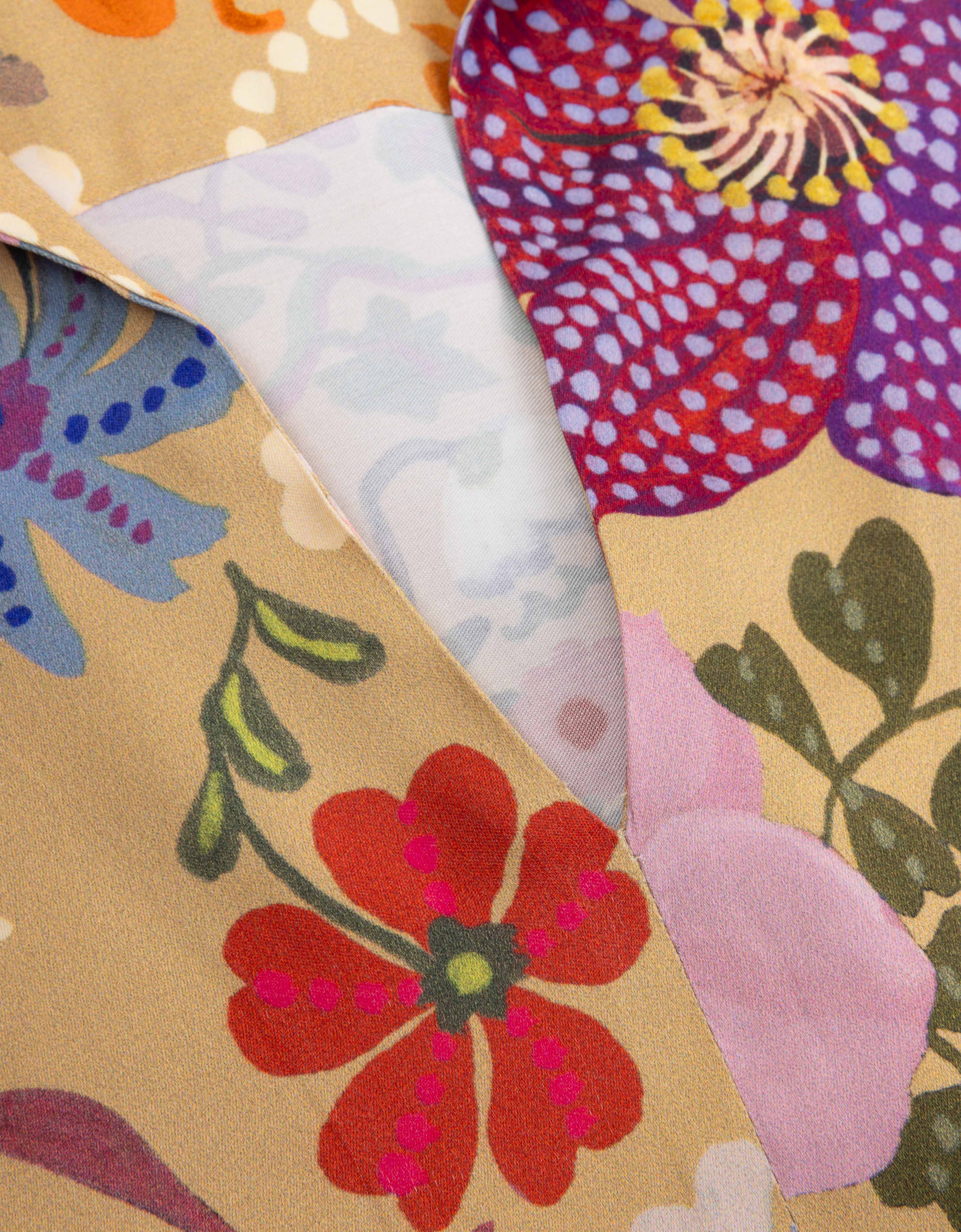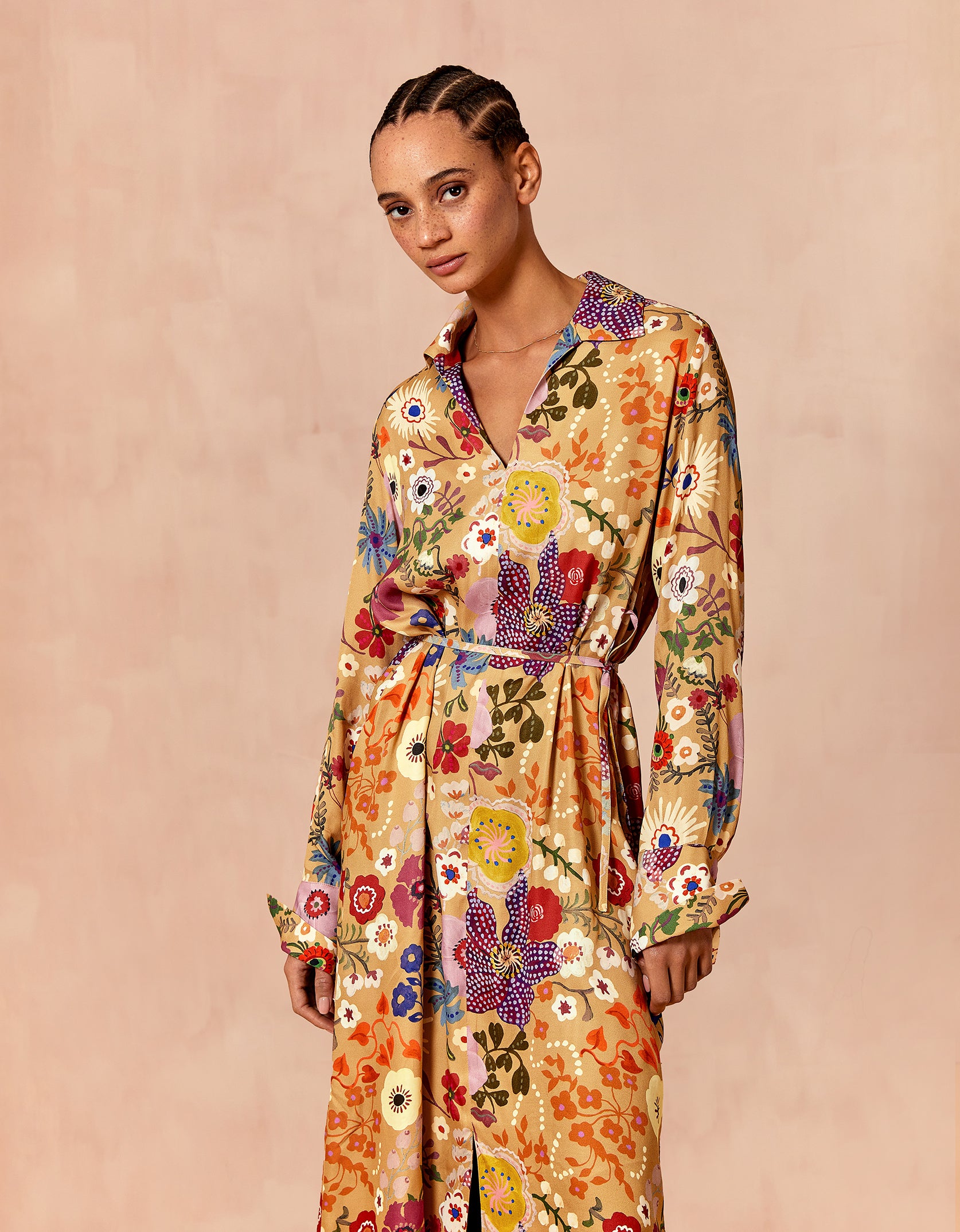 The Tide Spirits print, created by artist Nathalie Lété, celebrates traditional craftsmanship and folklore beauty. This hand painted design can be admired on this button midi-jurk with matching belt. The collar is open and the long cuffs can be rolled up as you like it.