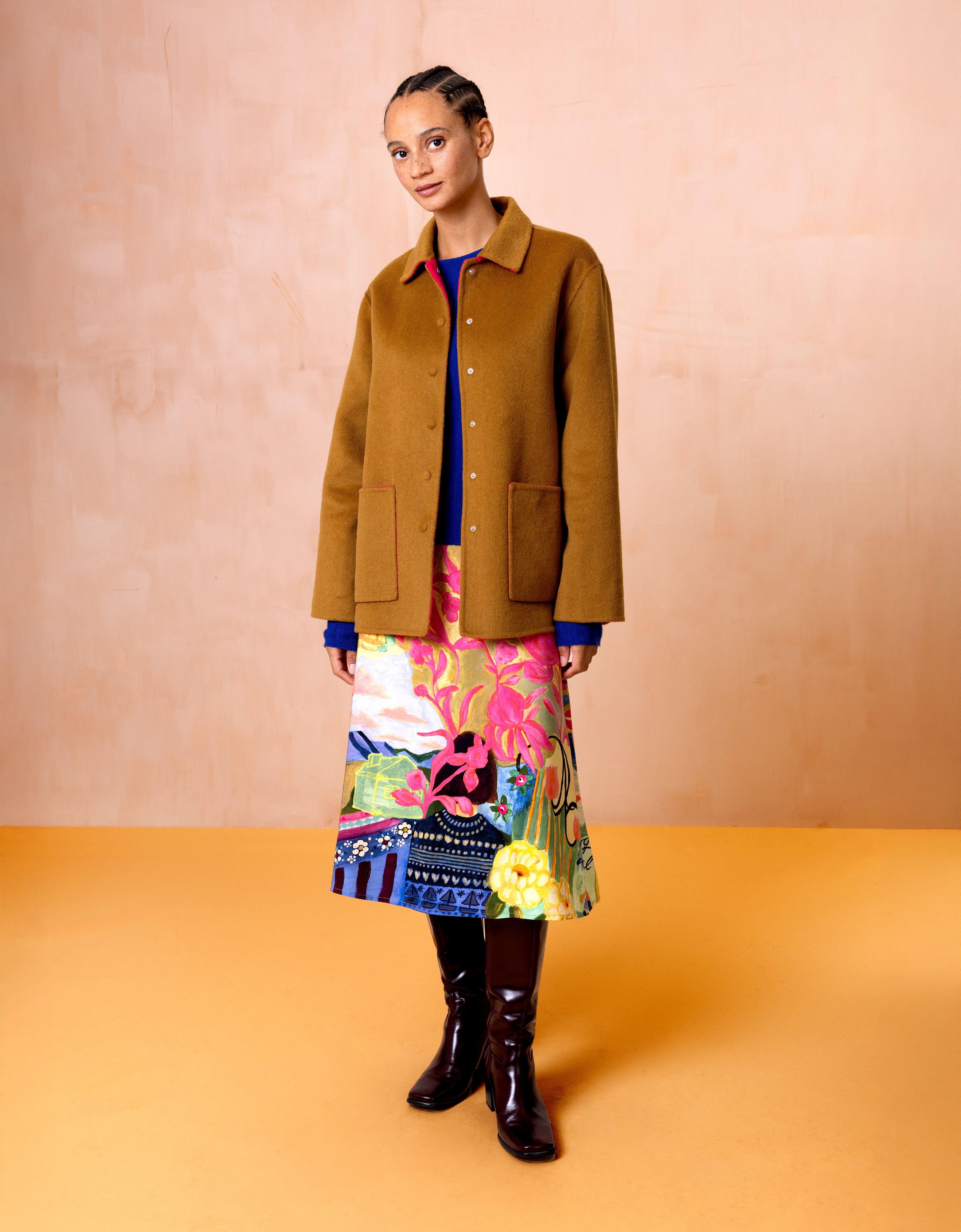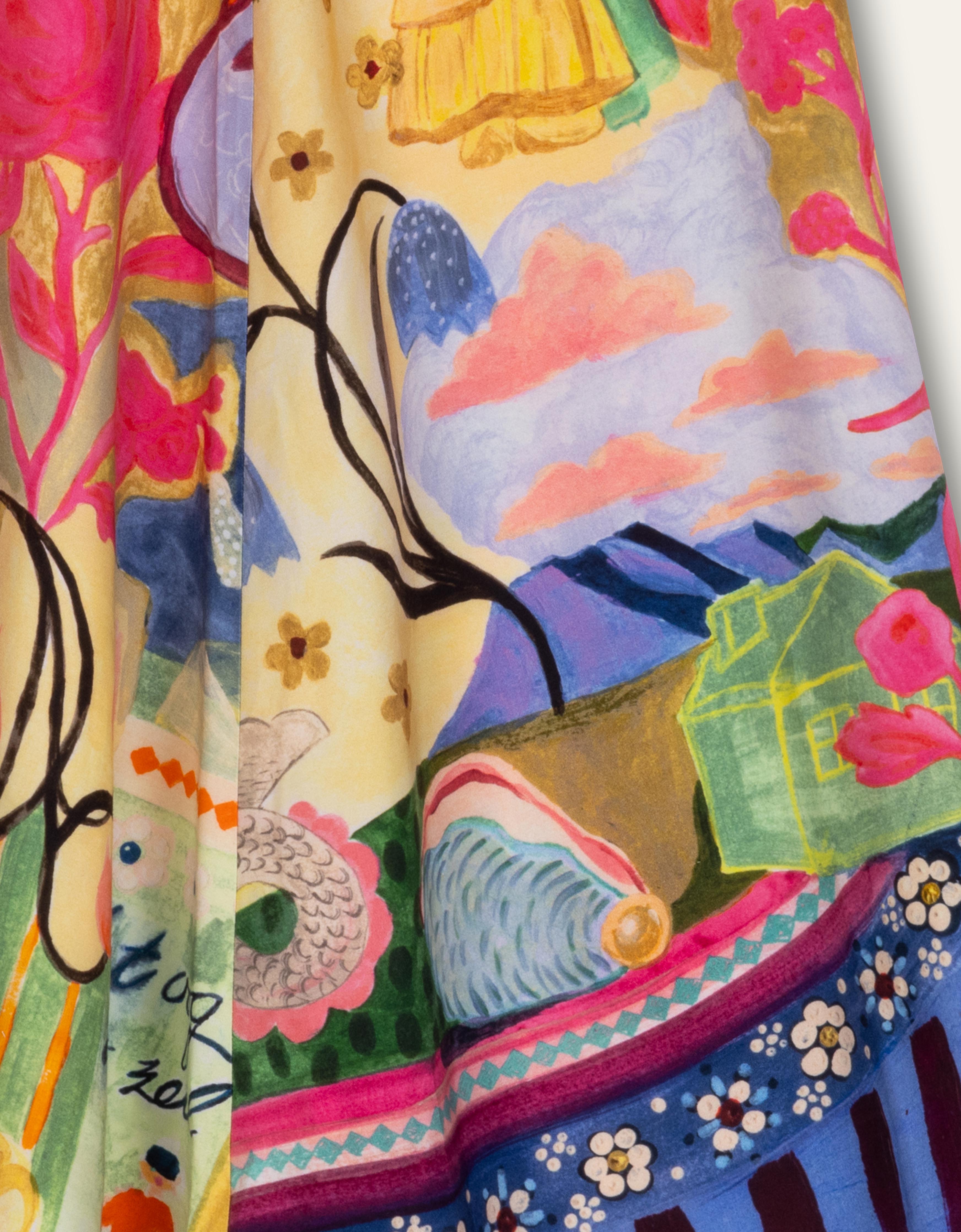This midi skirt has a blind zipper in the side and a wide stretchy waistband for a comfortable fit. On this skirt the wondrous print Thistle Cheese can really shine. This design is painted by hand and inspired by nature and sea surrounding Scotland and the longgone isle of Schokland.